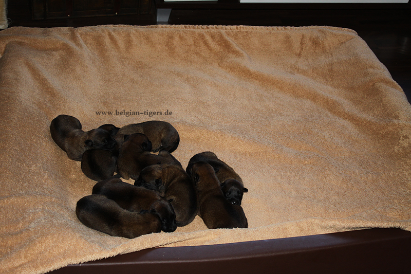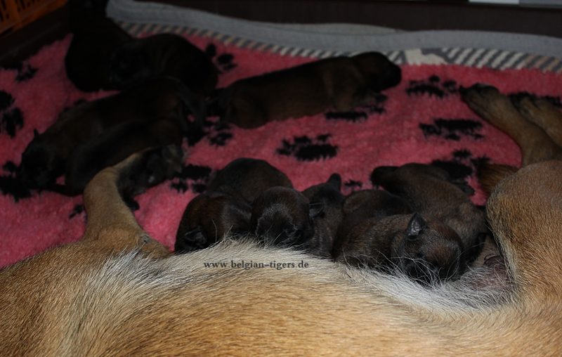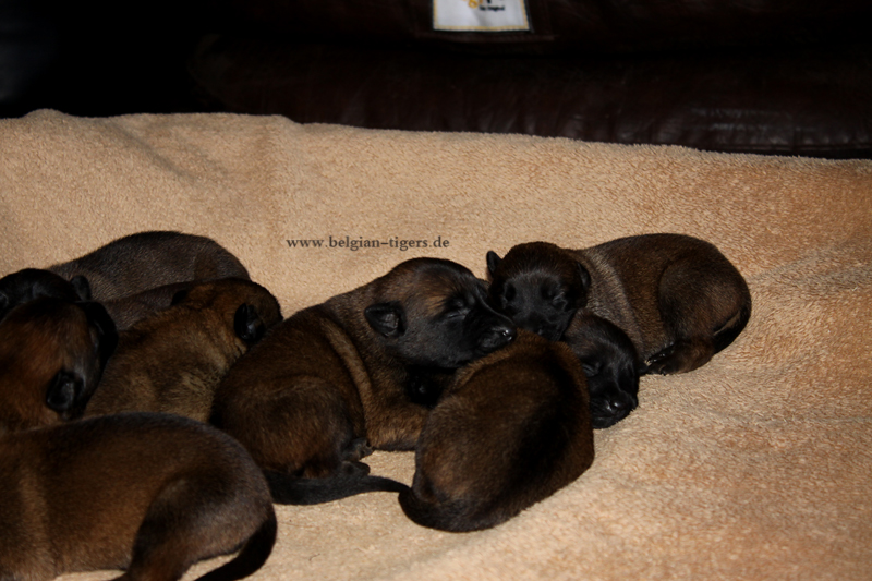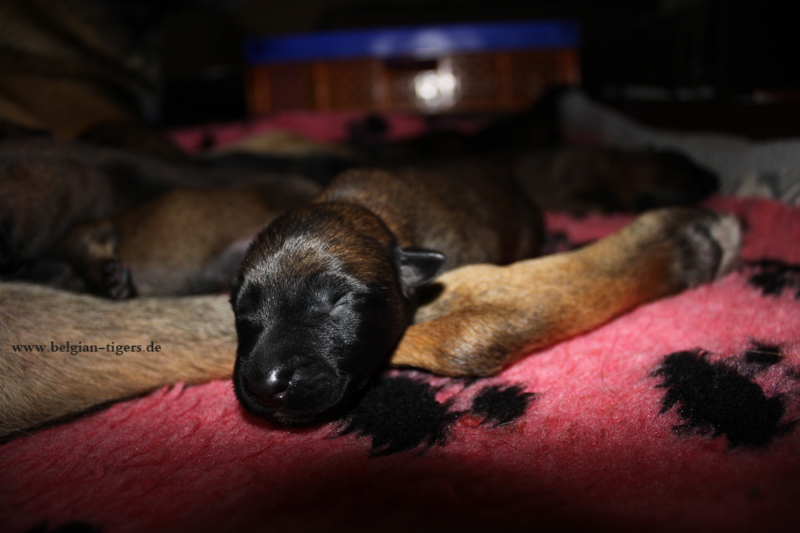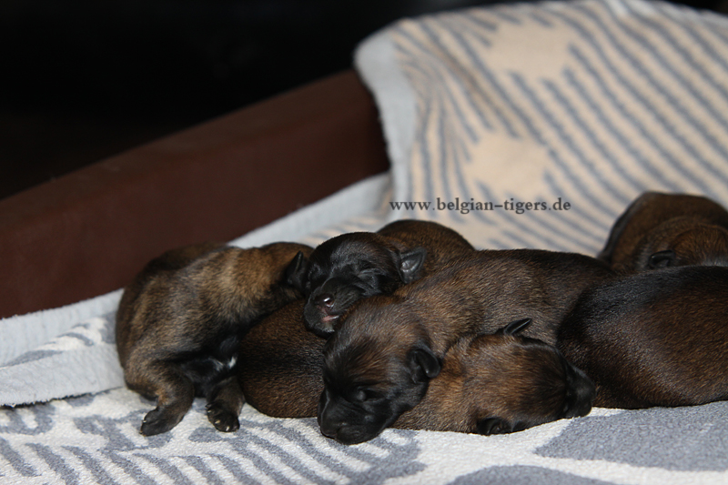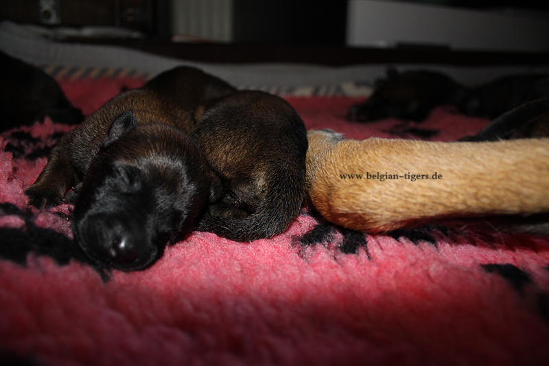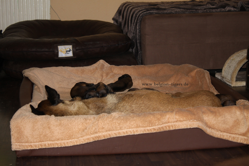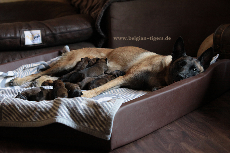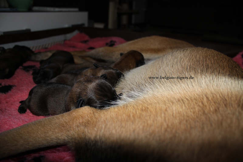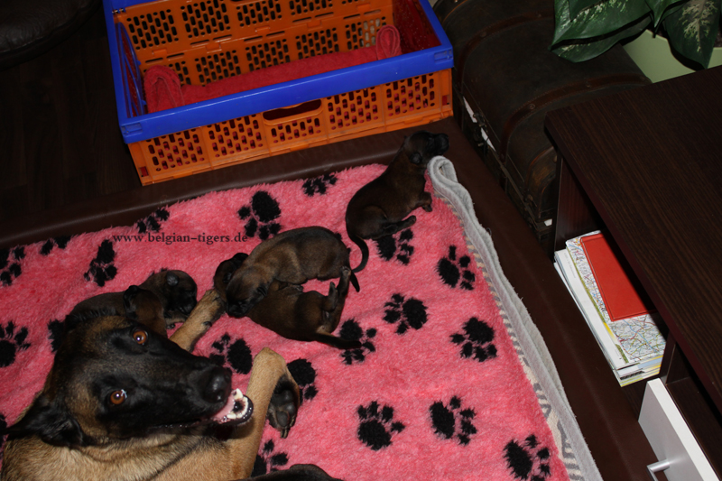 Nach einer Woche ist es hier noch völlig ruhig und entspannt. Gina macht ihre Aufgabe sehr gut und Milch scheint sie auch ausreichend zu haben. Im Moment möchte sie noch nicht auf der Couch liegen in den Pausen - lieber immer zwischen ihren Zwergen, auch wenn sie mal gerade nicht an ihr rumsaugen. Die Kleinen haben alle sehr schön zugenommen und lümmeln ganz entspannt in der Gegend rum - egal ob im Wurfraum oder in der Kudde mitten in der Stube..