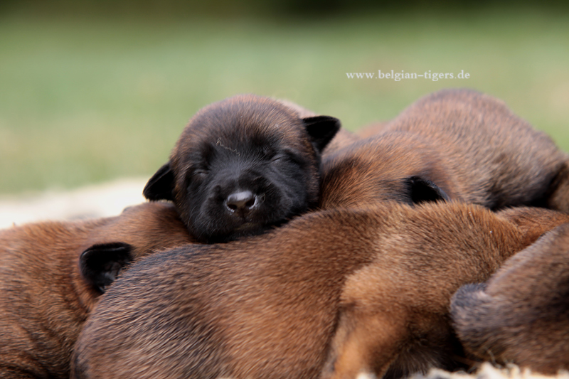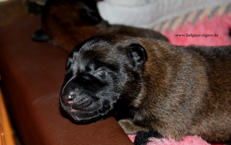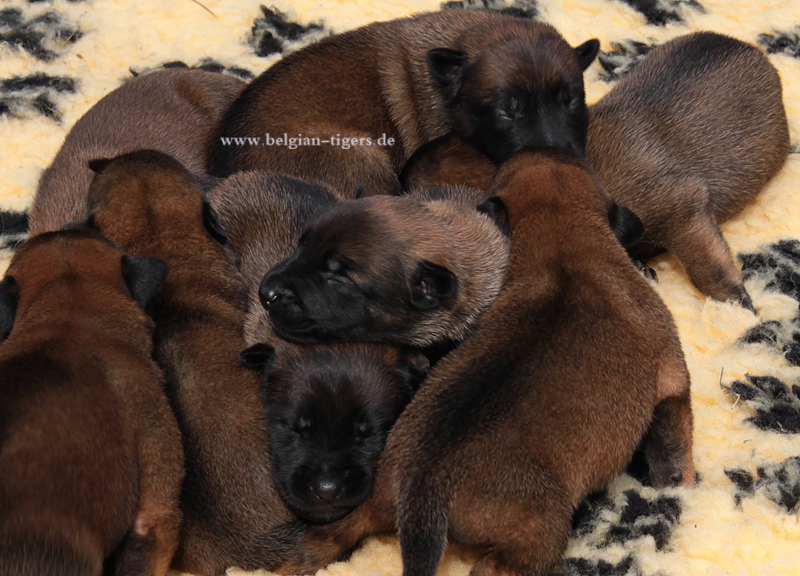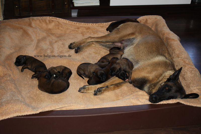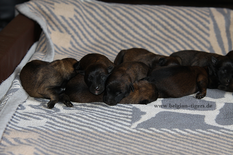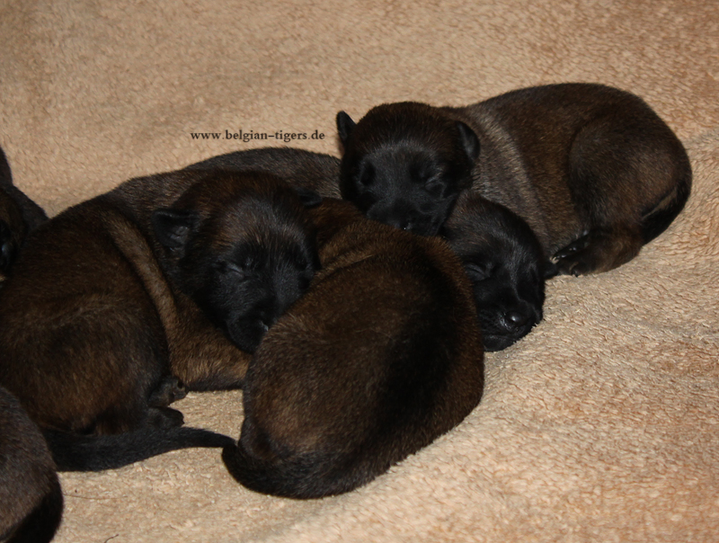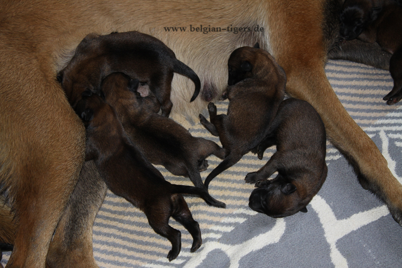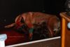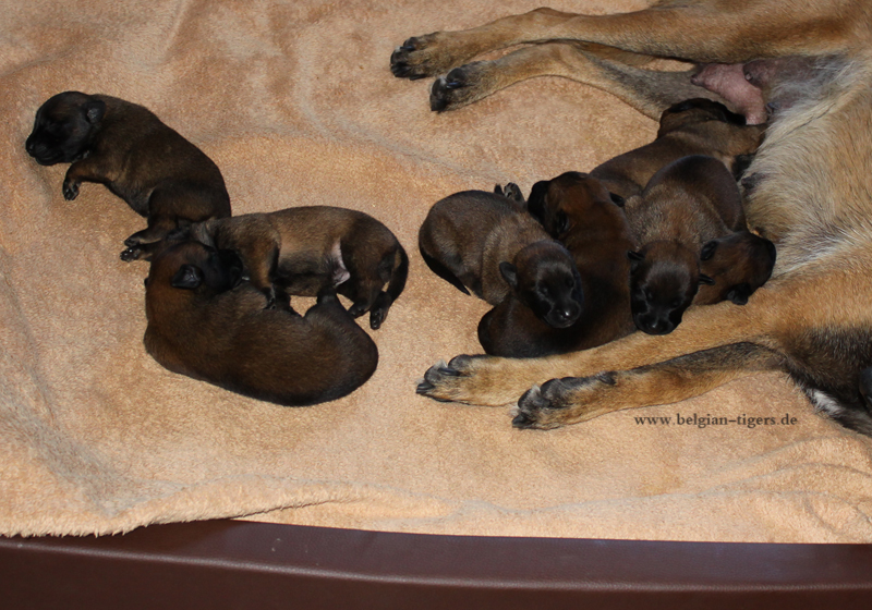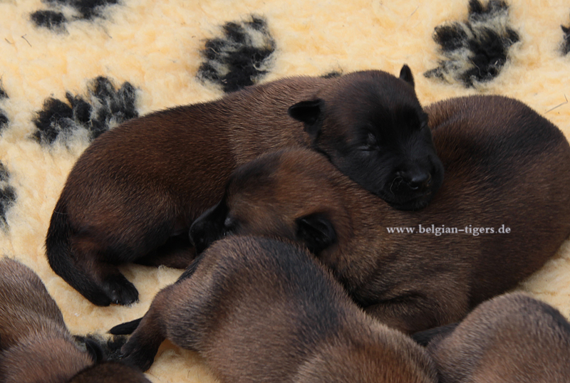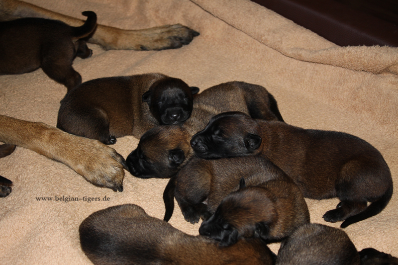 Nach einer Woche ist es hier noch völlig ruhig und entspannt. Gina macht ihre Aufgabe sehr gut und Milch scheint sie auch ausreichend zu haben. Im Moment möchte sie noch nicht auf der Couch liegen in den Pausen - lieber immer zwischen ihren Zwergen, auch wenn sie mal gerade nicht an ihr rumsaugen. Die Kleinen haben alle sehr schön zugenommen und lümmeln ganz entspannt in der Gegend rum - egal ob im Wurfraum oder in der Kudde mitten in der Stube..