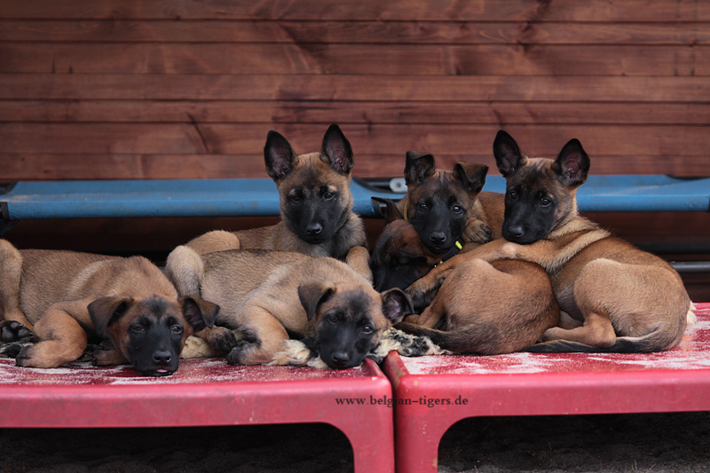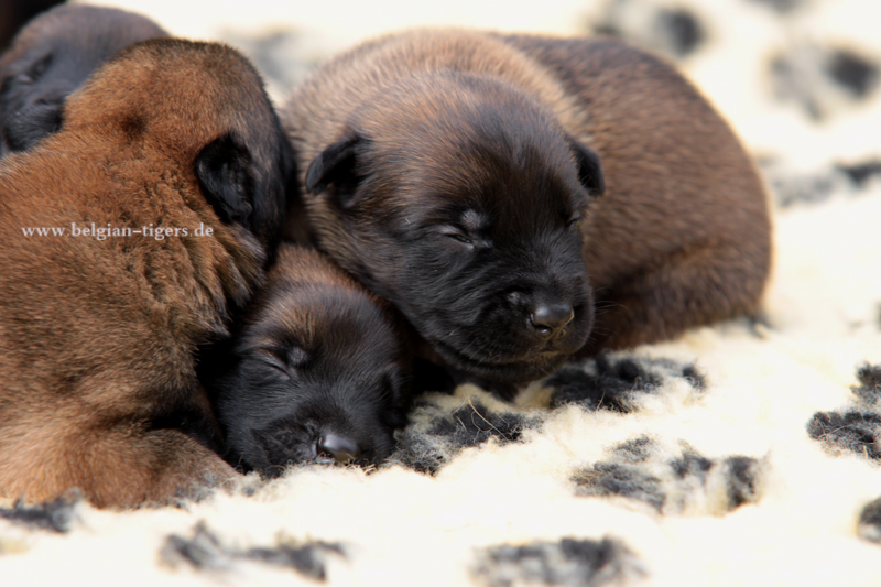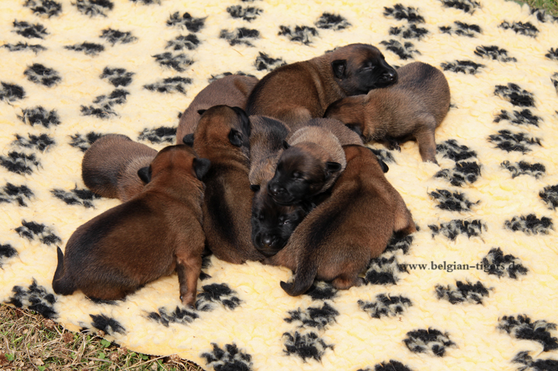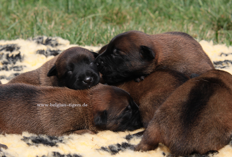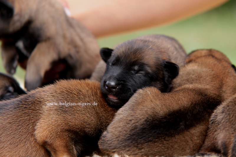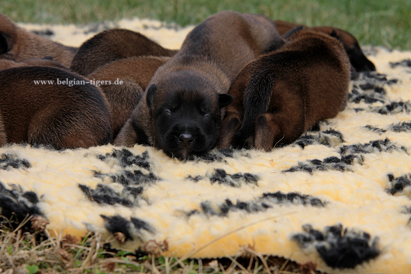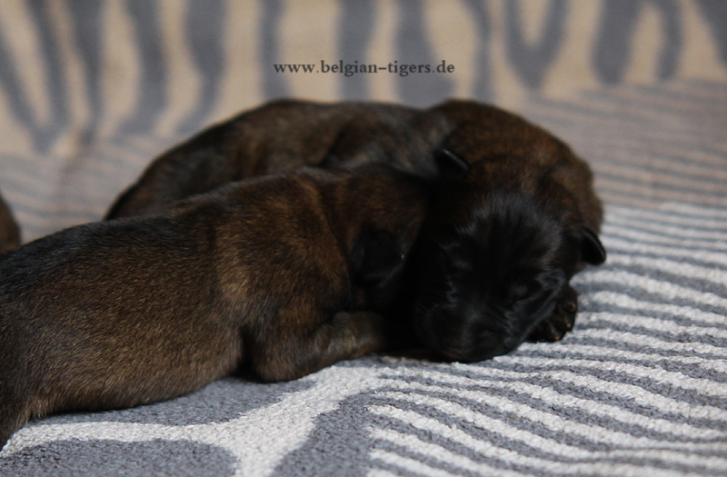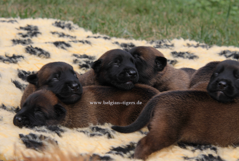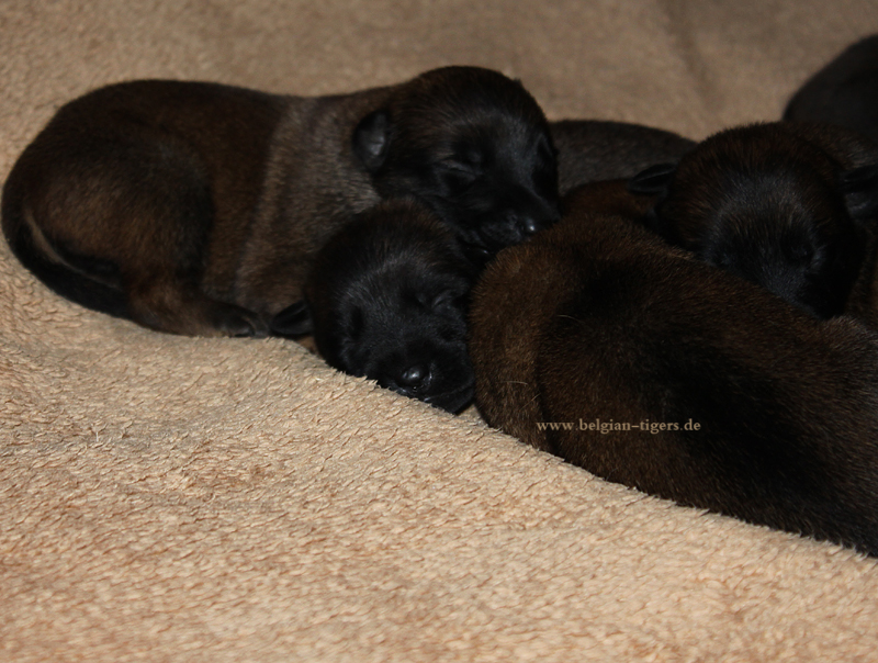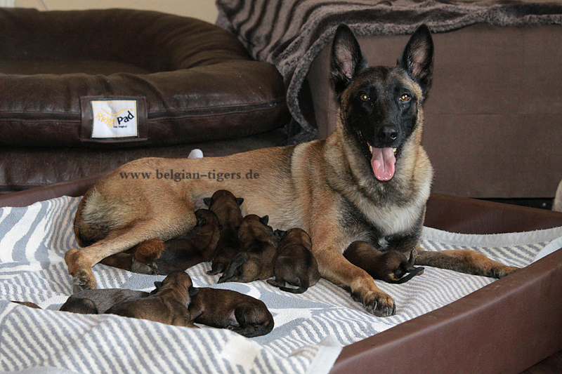 Nach einer Woche ist es hier noch völlig ruhig und entspannt. Gina macht ihre Aufgabe sehr gut und Milch scheint sie auch ausreichend zu haben. Im Moment möchte sie noch nicht auf der Couch liegen in den Pausen - lieber immer zwischen ihren Zwergen, auch wenn sie mal gerade nicht an ihr rumsaugen. Die Kleinen haben alle sehr schön zugenommen und lümmeln ganz entspannt in der Gegend rum - egal ob im Wurfraum oder in der Kudde mitten in der Stube..