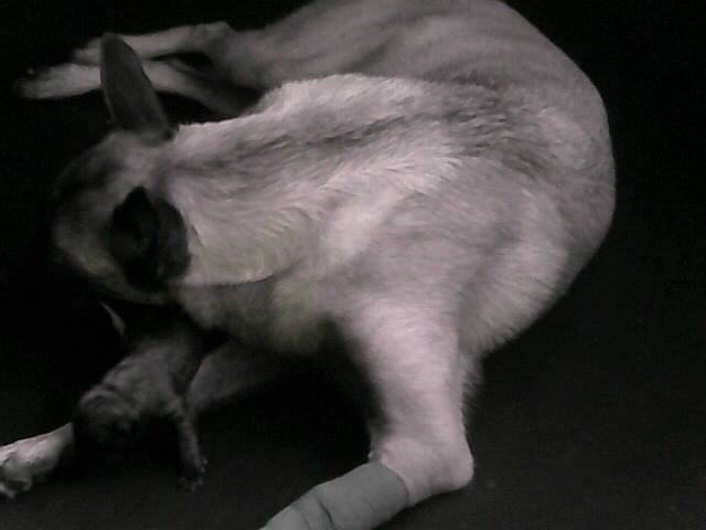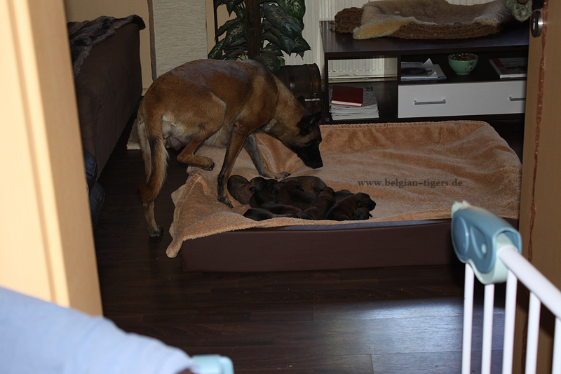- aber noch gestern früh, waren wir der Verzweiflung nah. Alles begann vor 7 Tagen, als Gina ganz vorschriftsmäßig am 60.Tragetag damit begann in der Nacht recht unruhig zu werden und ein schickes Nest zu bauen in ihrer Wurfkiste, in der wir ihr ein paar alte Handtücher reingegeben haben. Auch musste sie in dieser Nacht 4 mal raus um *ganz dringend * 3 Tropfen auf die Wiese zu bringen. Noch in dieser Nacht habe ich dann mal ihre Temperatur gemessen und siehe da, sie war abgesunken auf 37,5°C von normalen 38,5°C - bedeutete für uns, Gina hat bereits Senkwehen und bereitet sich somit schon mal auf eine baldige Geburt vor.