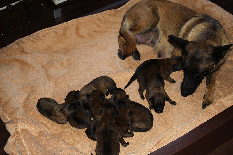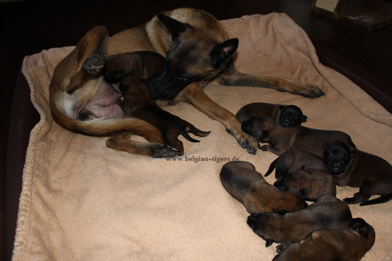 Von da ab verlief die komplette Geburt wie aus dem Lehrbuch, Gina hat im 10 Minutentakt einen Welpen nach dem anderen geworfen, nach dem 6ten Welpen gab es kleines Verschnaufpäuschen mit etwas Traubenzucher. Ihr Verhalten war sehr instinktsicher und schien gut durchdacht. Wir konnten aus der Ferne zugucken und unsere Hilfe wurde nicht benötigt.