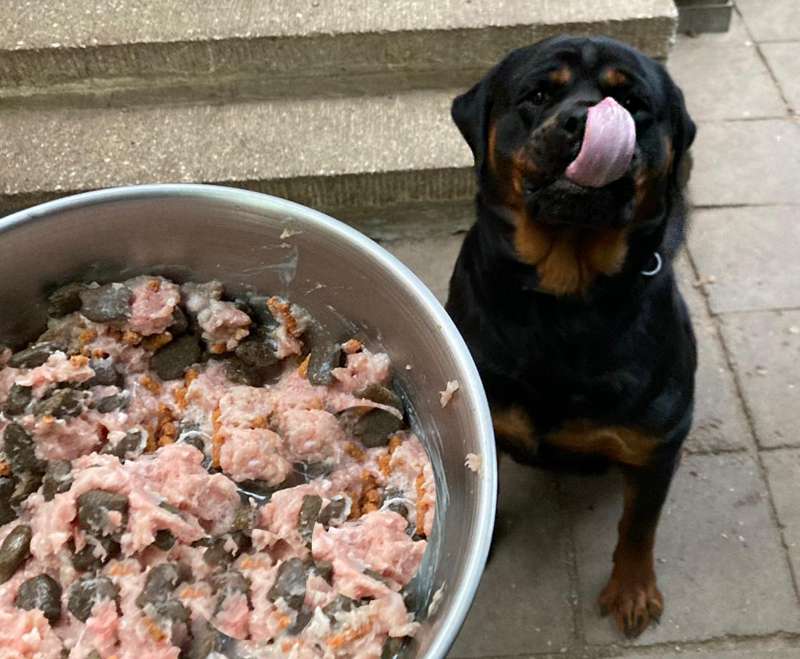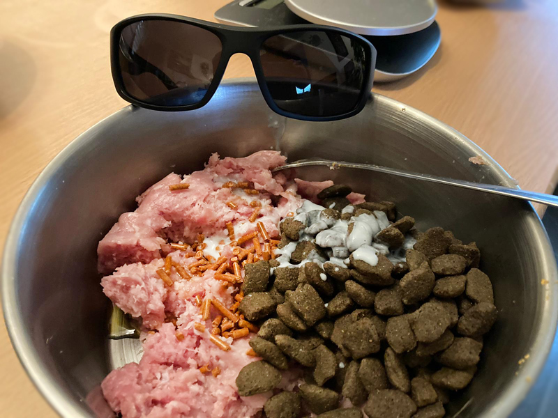 gemischt mit gewolftem Putenmagerfleisch, Möhrenpellets, Lachsöl und ein Blub Buttermilch.