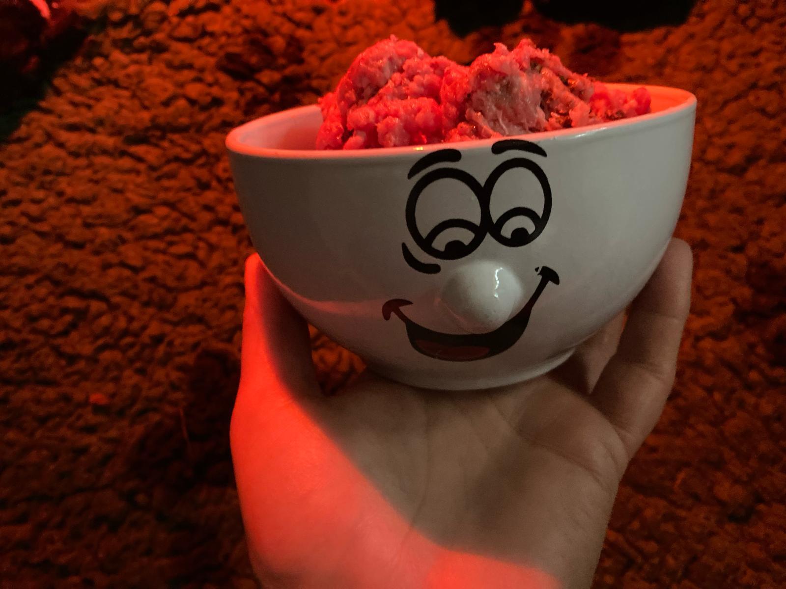 Gestern habe ich das erste Mal ein bisschen gewolftes Rindfleisch gefüttert.