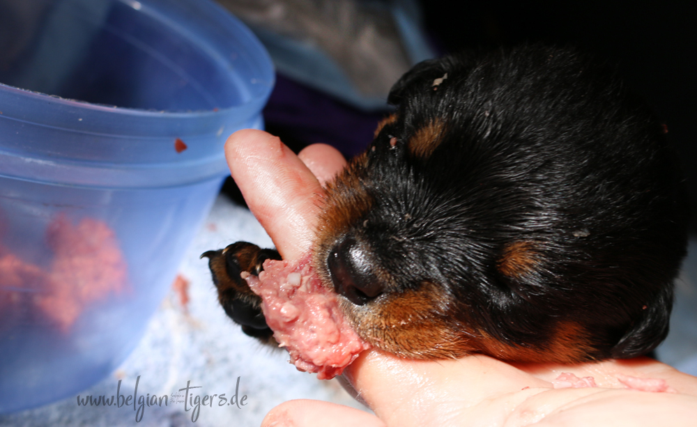 Mittlerweile futtern die kleinen Tiger 1000g am Tag, jeweils 250g am Morgen 250g am Nachmittag und 500g am Abend.