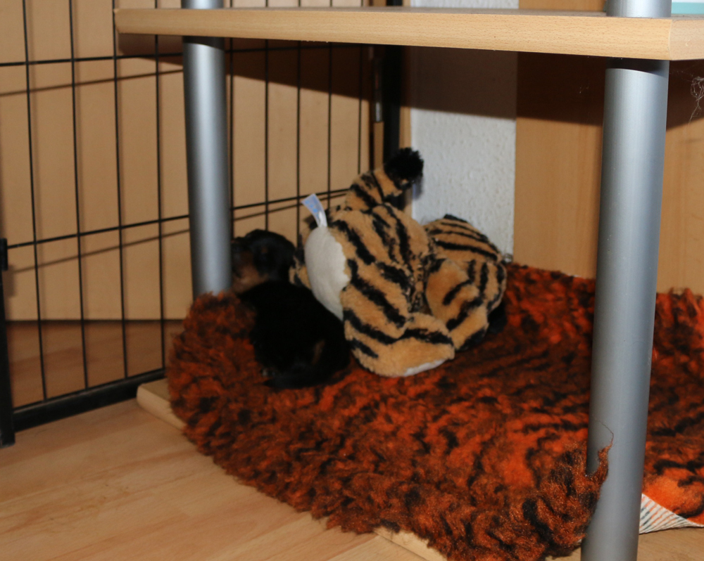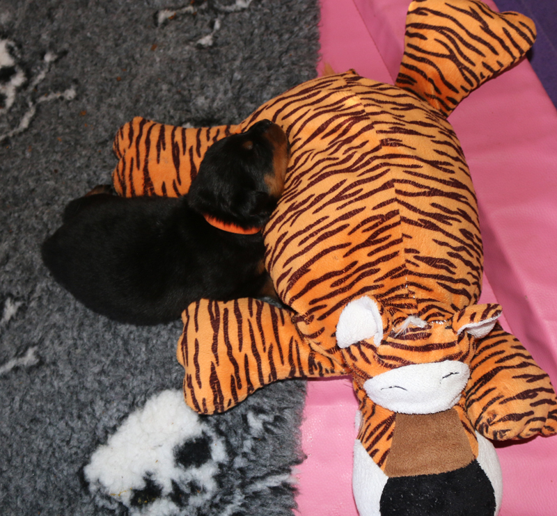 Die Babys sind jedoch oben im Welpenzimmer und sie ist unten im Wurfzimmer und bekommt immer zwei/ drei Tiger zum abnuckeln, damit sich nicht auch noch ein Milchstau bildet und damit sie nicht so einsam ist.