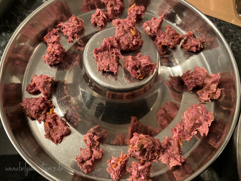 Rinderhack vom Fleischer um die Ecke, Möhrenpellets , ein paar Kugeln Welpentrockenfutter =>Belcando GF Puppy, chinesische Kräuter für die Verdauung und ein Tropfen Leinöl. Alles was fest ist, wird mit der Kaffeemühle zu Pulver gemahlen dann schön in die Hackmasse geknetet.
