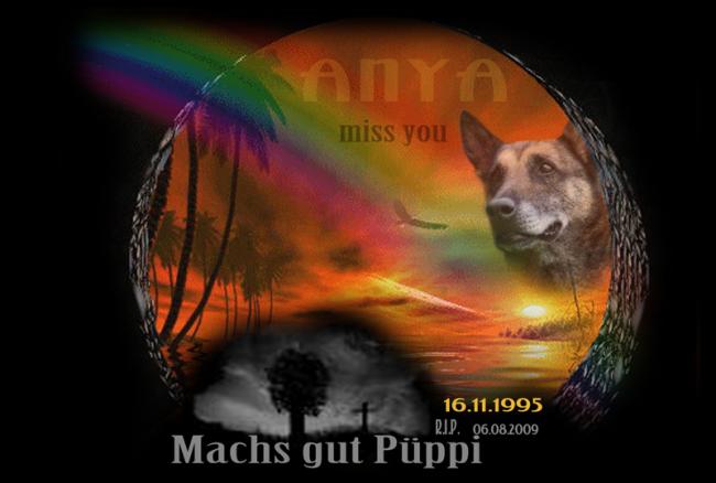 Wurftag 16.11.1995 | HD: A | ZB: V1 | VPG3/ IPO3 | DMC ZTP Anya ist knapp 14 Jahre alt geworden♥ Anya ist am 6.August 2009 über die Regenbrücke gegangen. Sie hinterläßt eine große Lücke in unseren Herzen:-( Anya ist die Mutter unseres B, F, G und H Wurfes von den kleinen Helden |