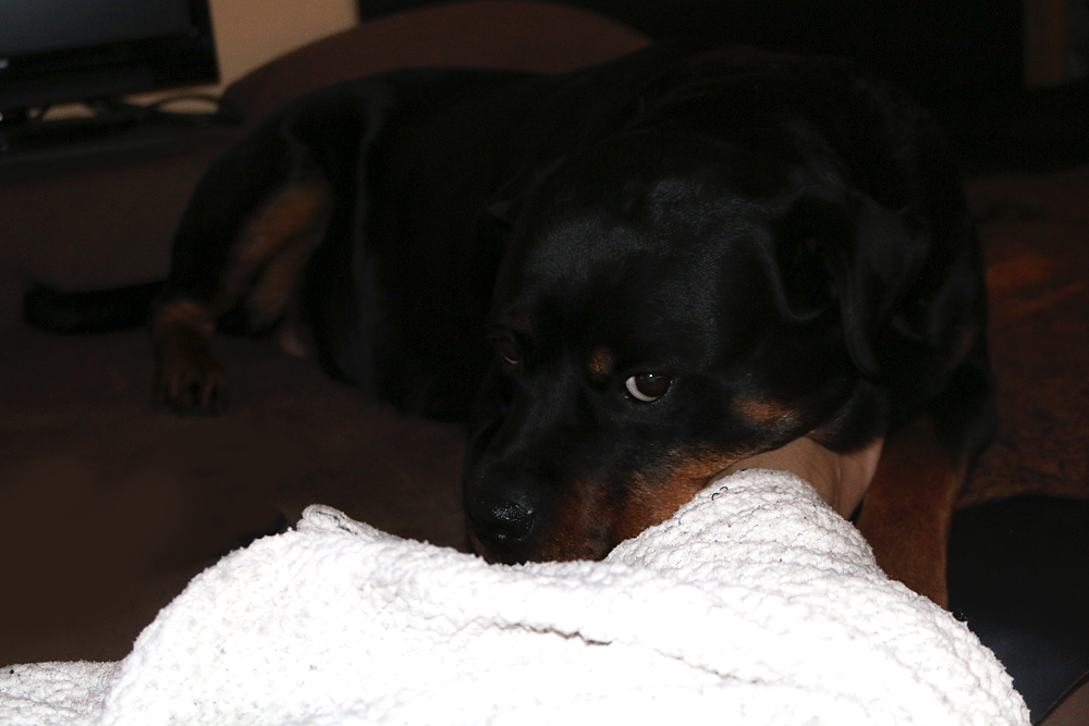 Über den Tag verteilt hat sie immer wieder kurze Hechelphasen, in denen sie dann auch ordentlich die Decken knuselt.