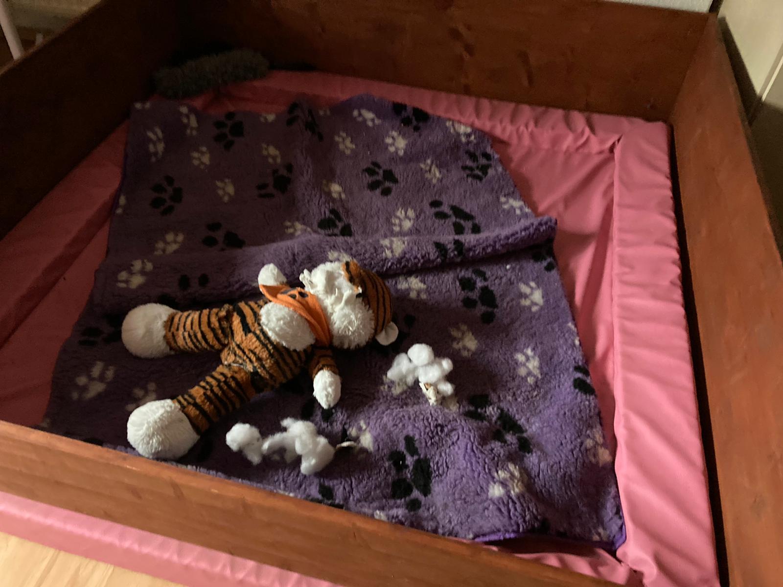 Gestern ist sie sogar aus ihrer Welpenresidenz ausgebrochen und hat sich in der Futterküche über den getrockneten Pansen hergemacht. Sie hat sich natürlich nicht nur satt gefressen, sie hat auch noch einen kleinen Vorrat mit hoch genommen und unter den Decken versteckt.
