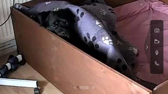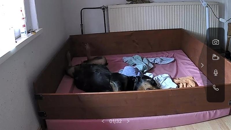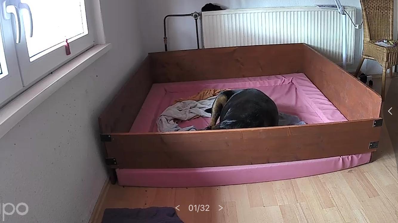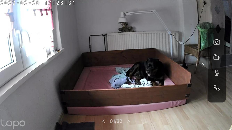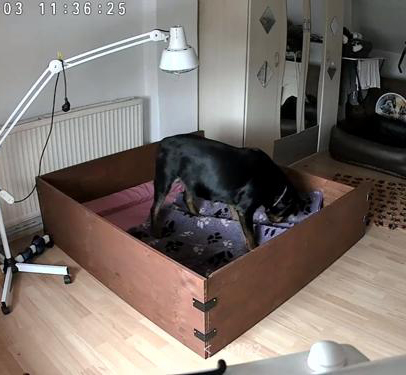 Was bei ihr ja immer zu einem gewissen Unmut führt. Aber da sie mit ihren Welpen lieber etwas abseits des Rudels ist, muss sie nun wohl oder übel schon mal WURFKISTENPROBELIEGEN. Zu allem Übel ist unsere Ücam jetzt auch noch kaputt, also sind wir anfangs blind. Da ihr Wurfzimmer aber oben ist, hört man sie wütend stampfen. Mal sehen was sie sich einfällen lässt