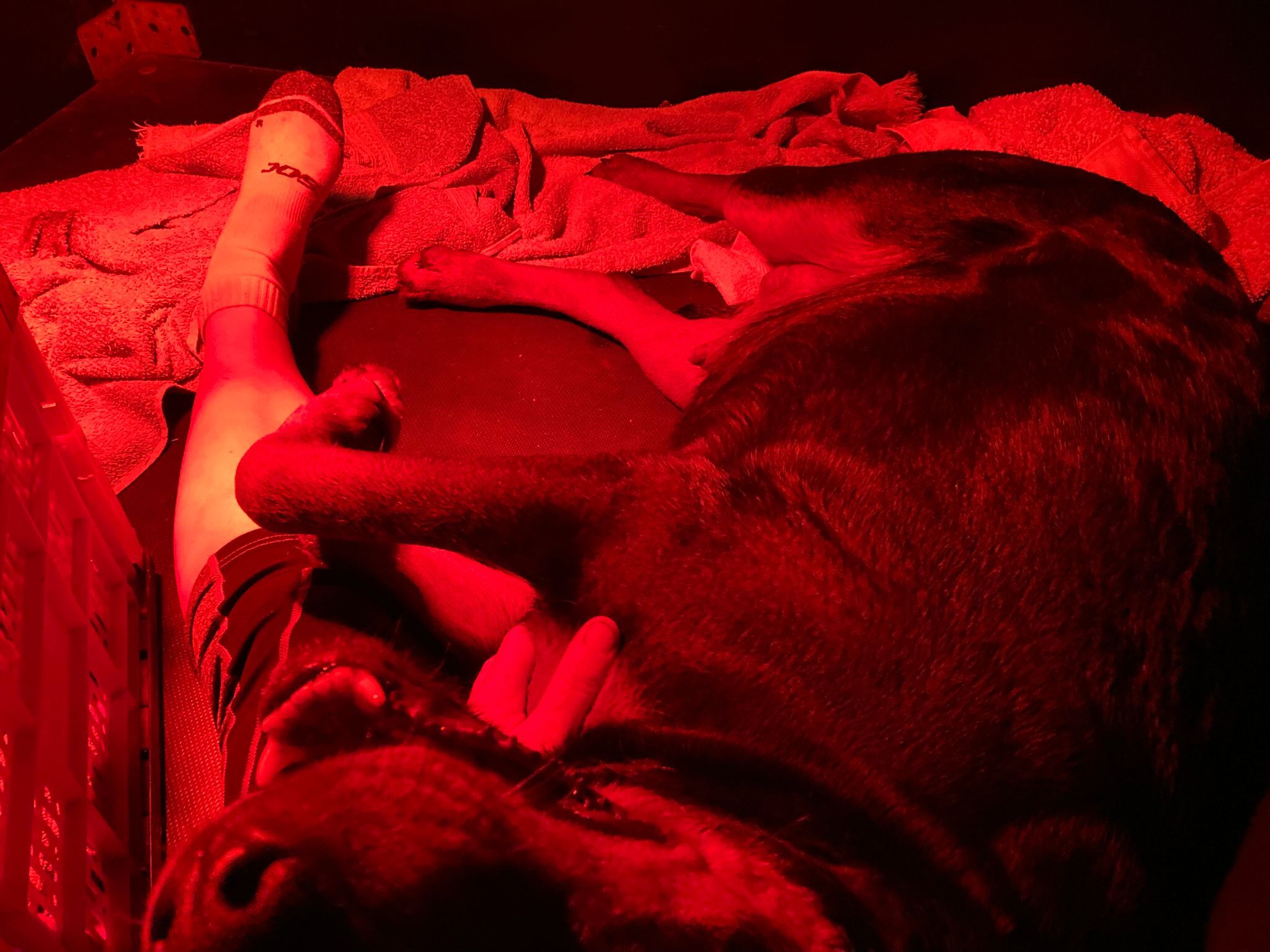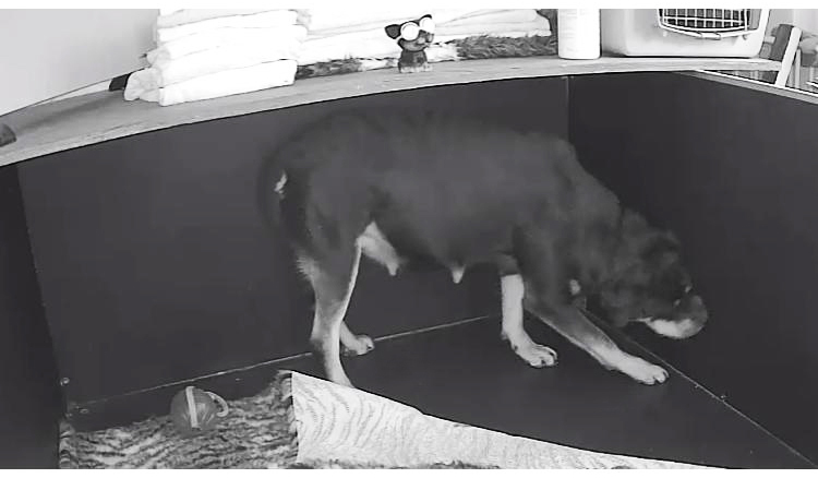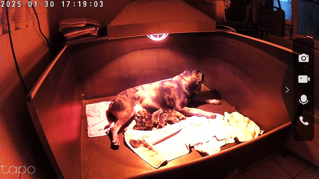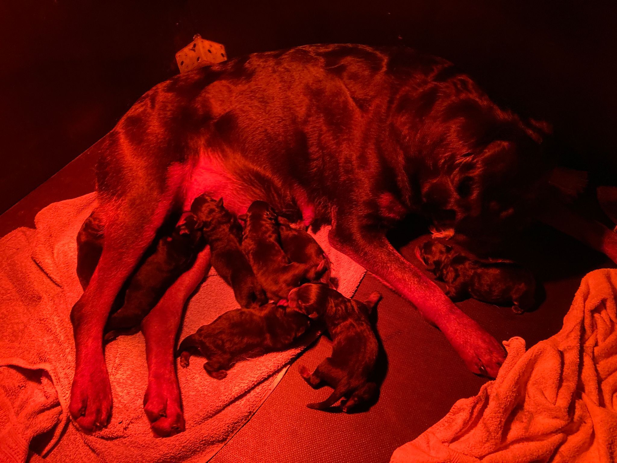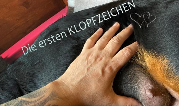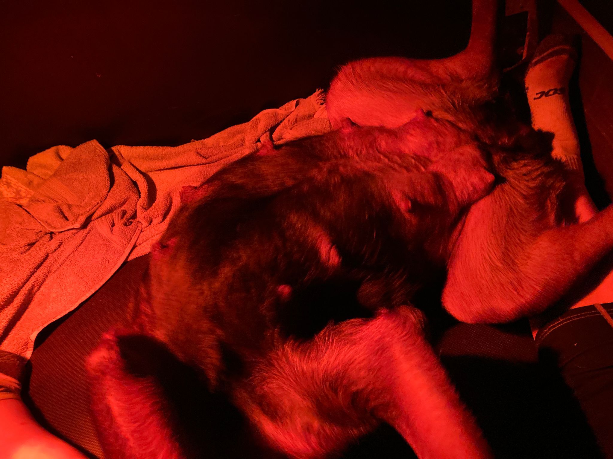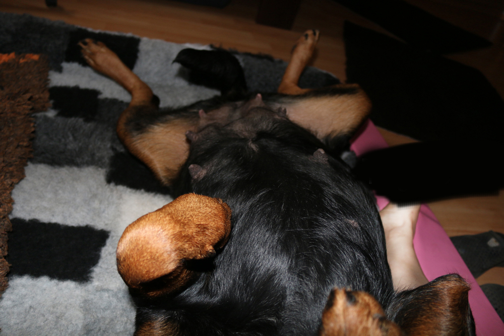 Wenn es dann richtig zur Sache geht kommt es aber auch raus. Während der Geburt gibt es bei uns keine Decken, damit kein Welpe drunter gerät.