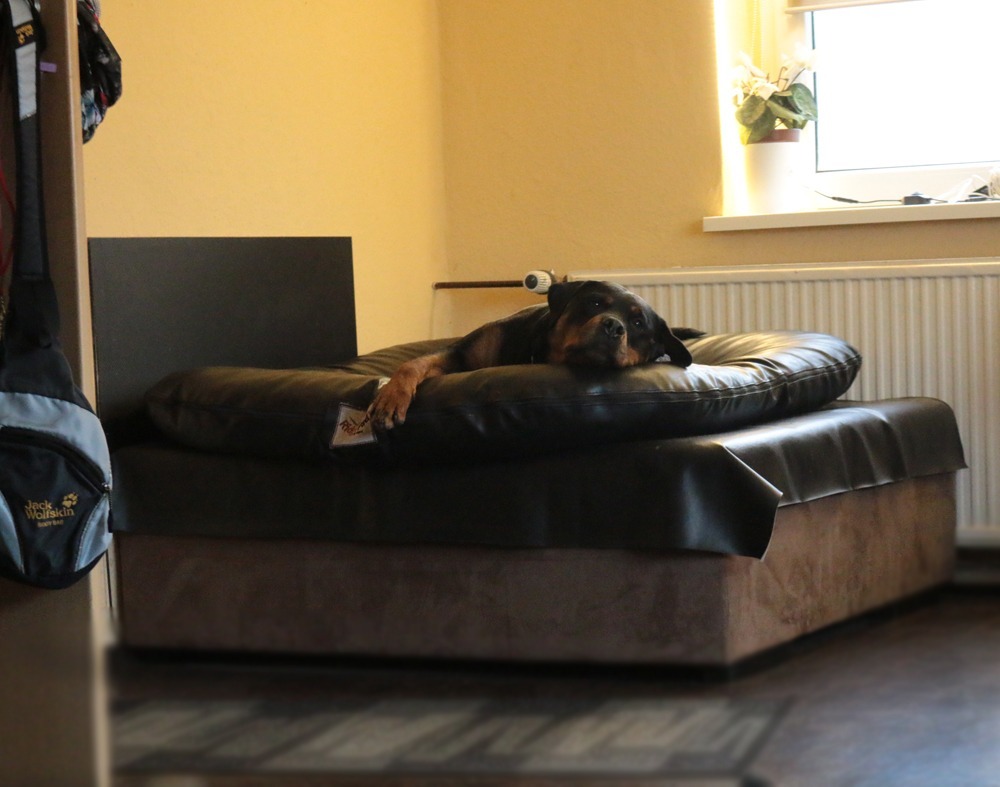Wegen der Kratzerei habe ich heute morgen die dicke Ledermatte rausgenommen und das große Vedbed haben wir durch ein kleineres ersetzt.