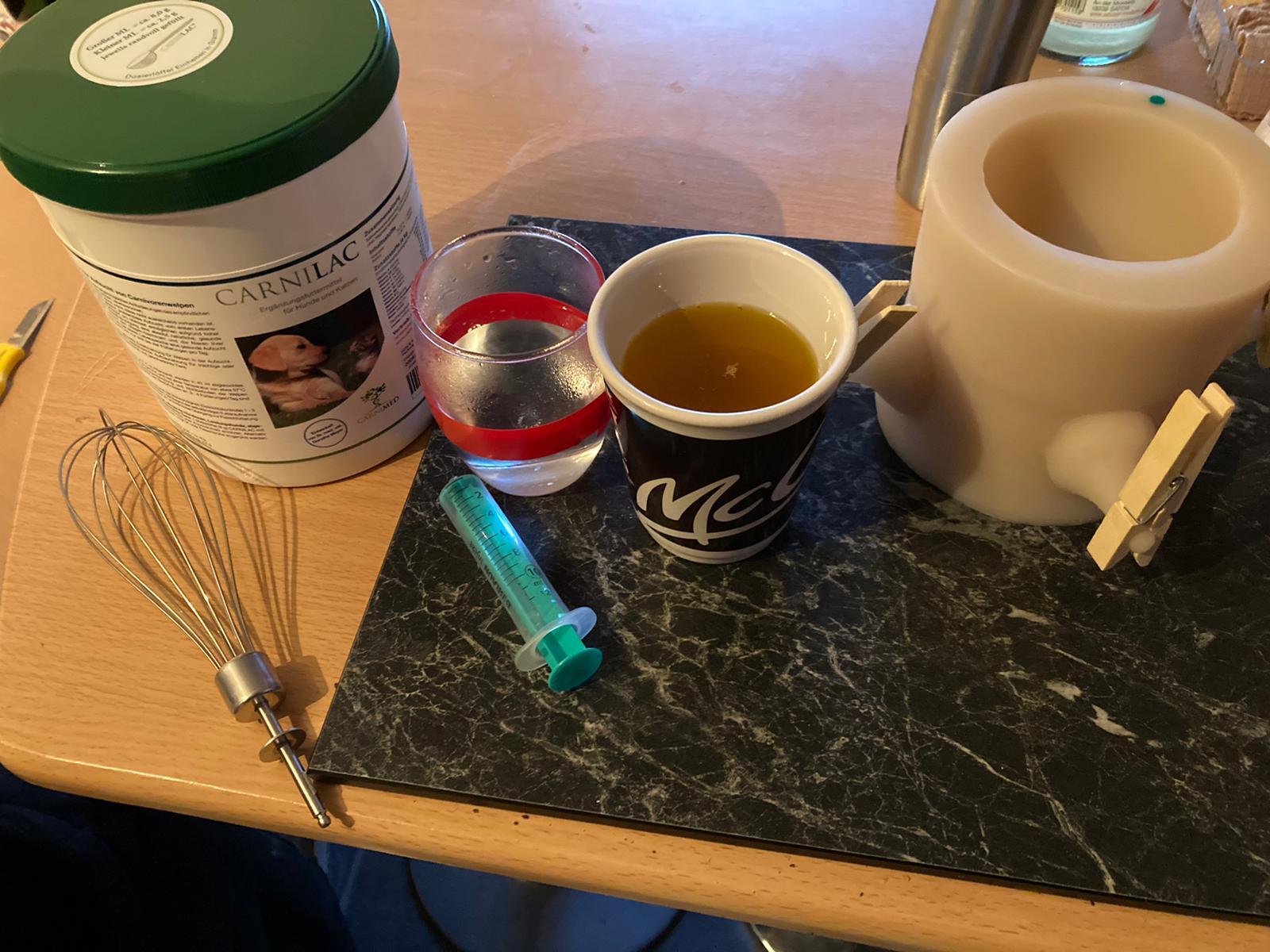 Wir brauchen also: eine gute Welpenmilch, Pflanzen- oder Leinöl, eine kleine Plastikspritze,