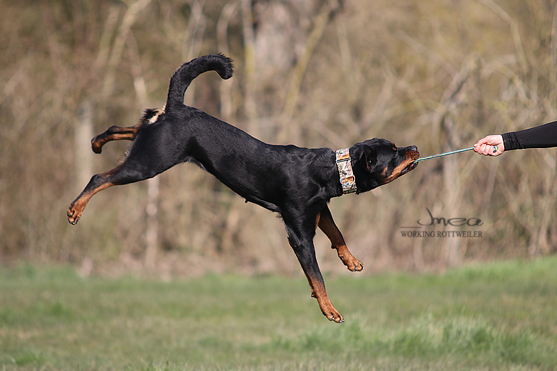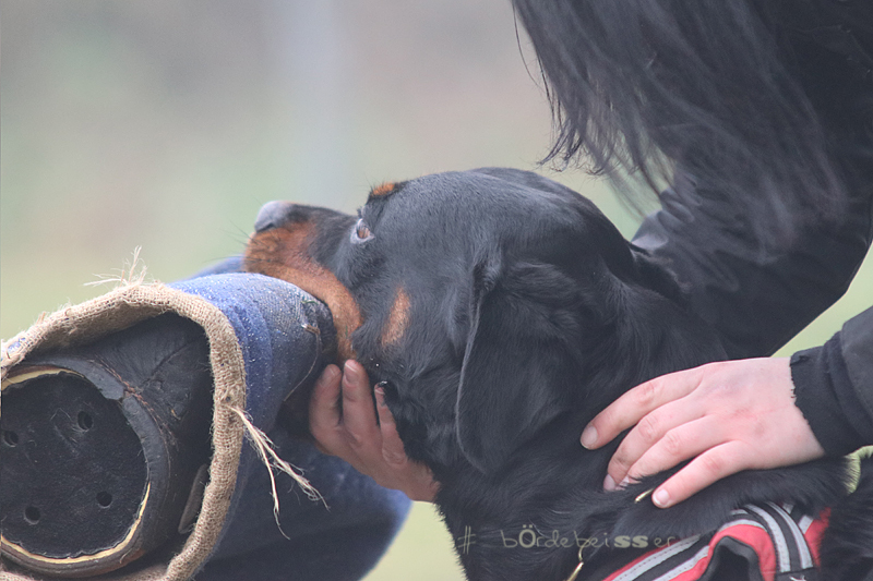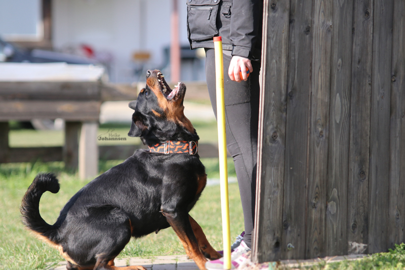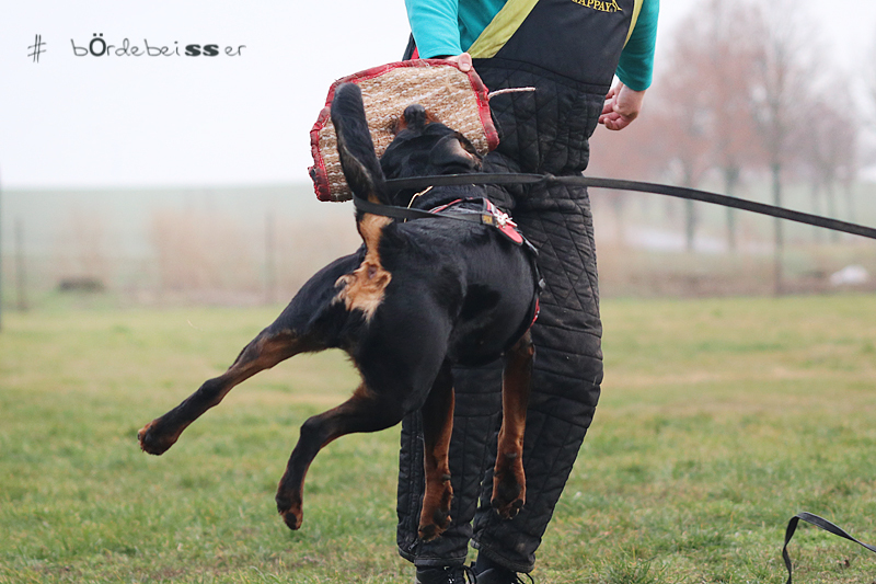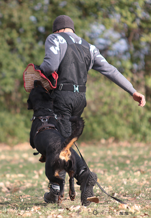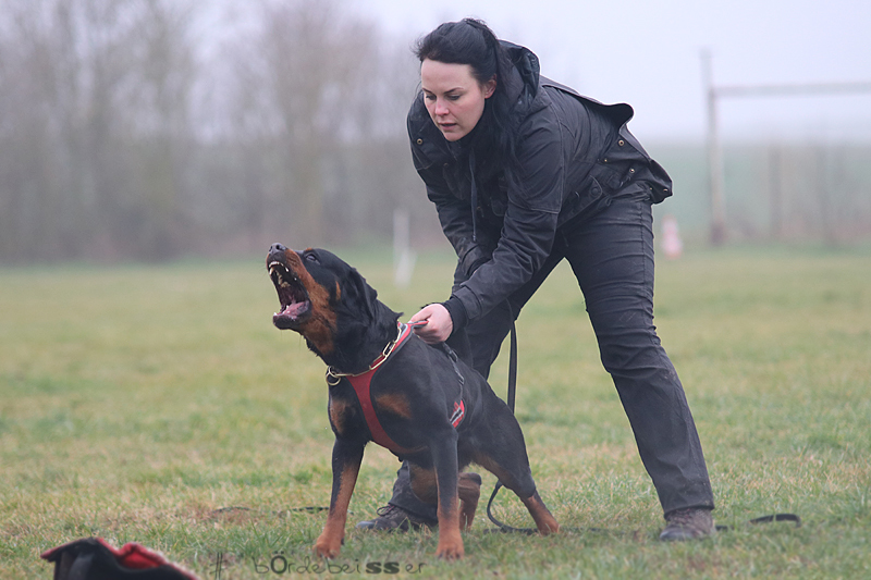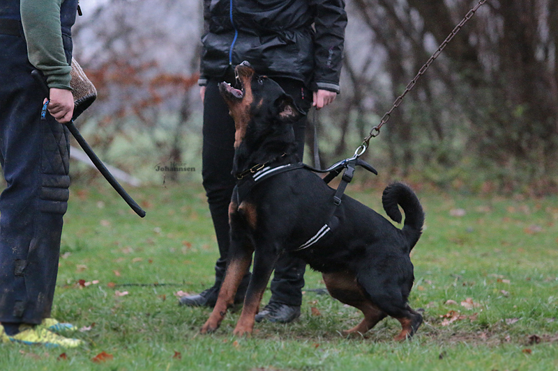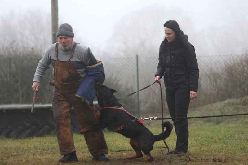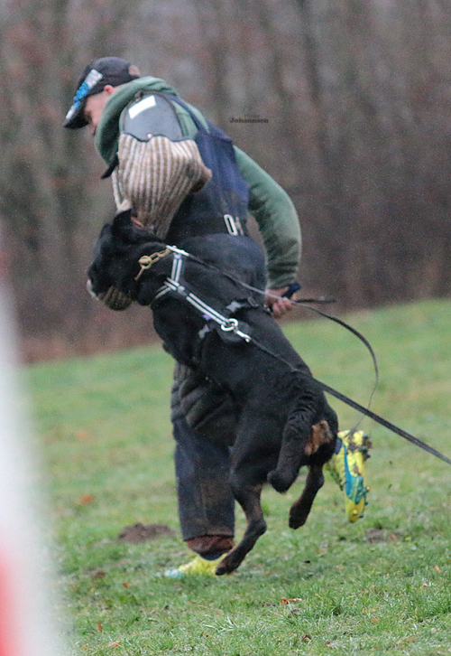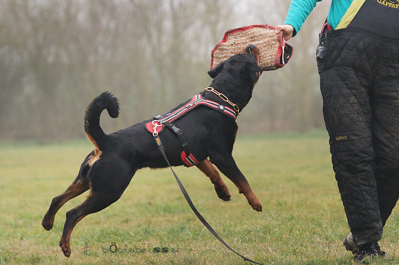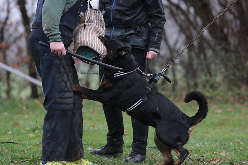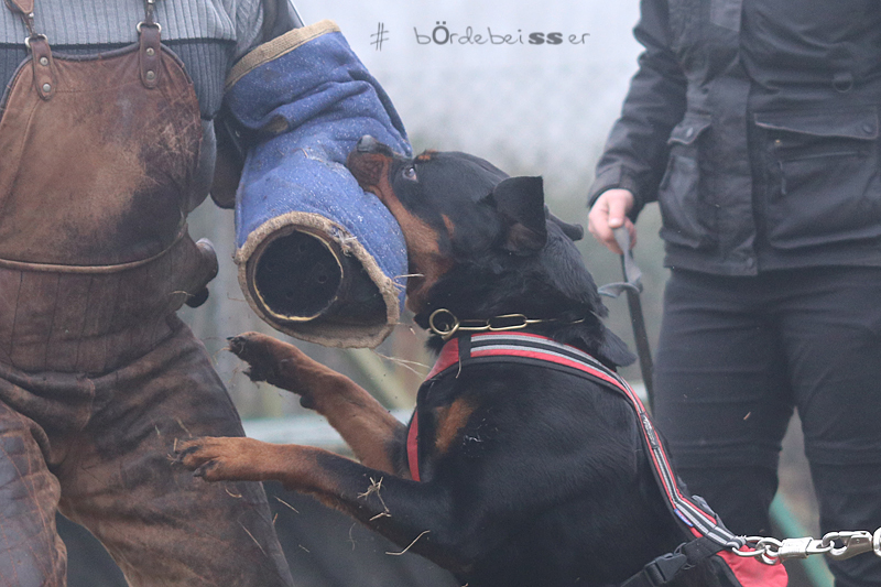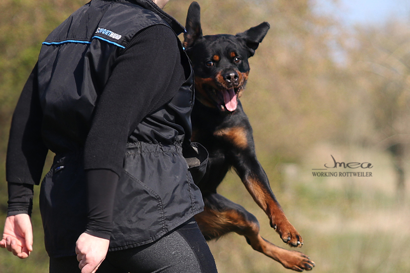 Im Schutzdienst zeigt sie ein gutes Griffverhalten und eine tolle Anbissgeschwindigkeit und bleibt auch in hohen Triebbereichen regelbar.