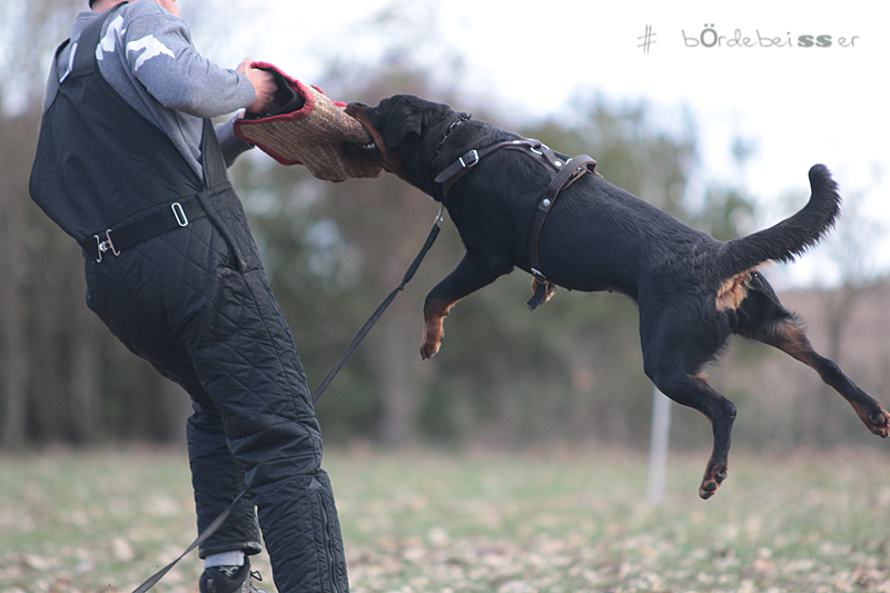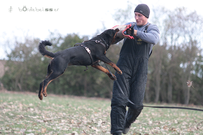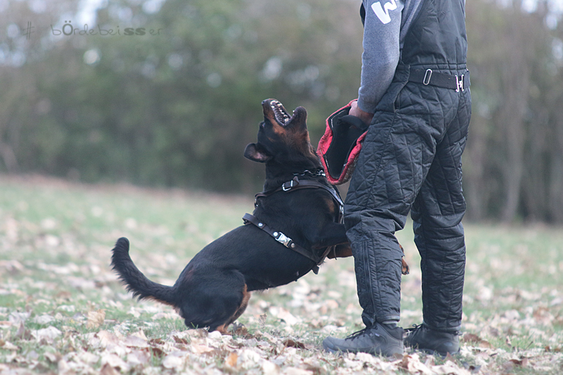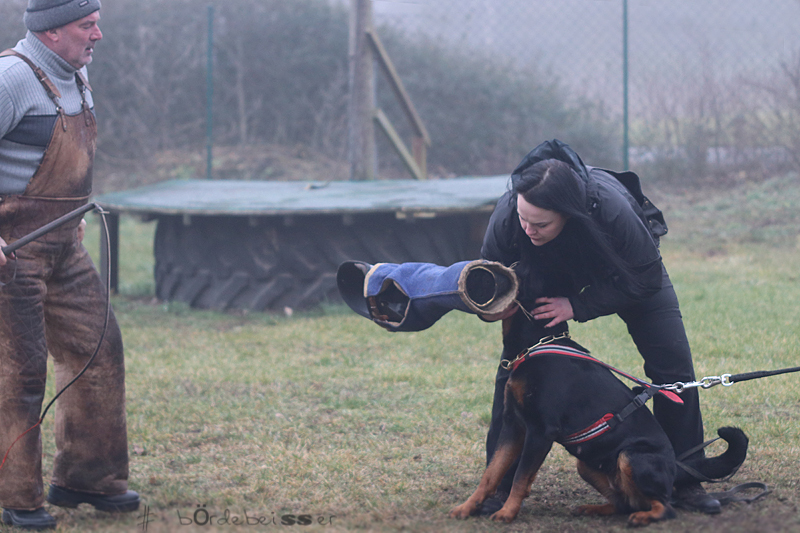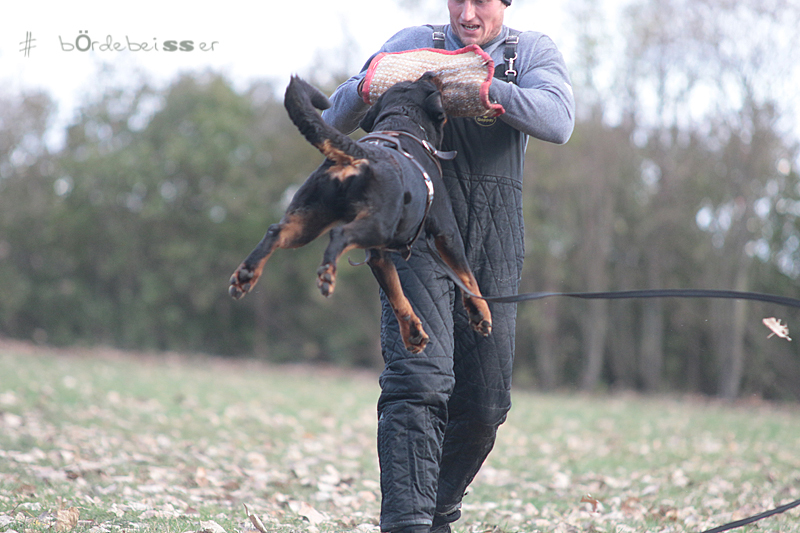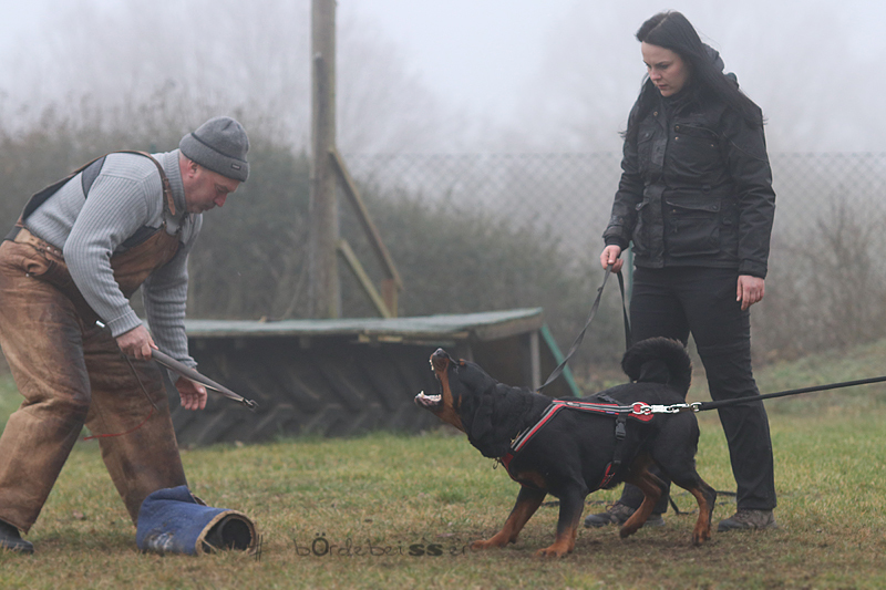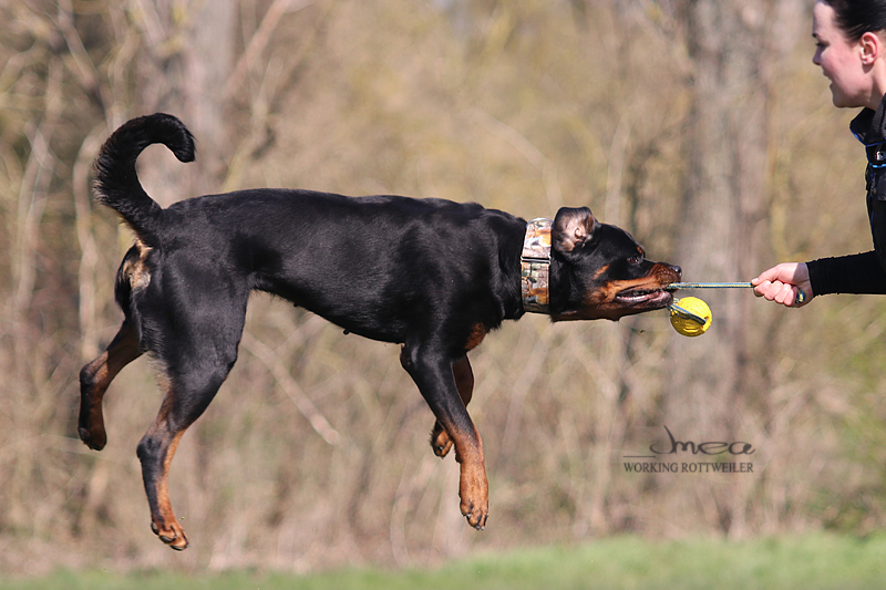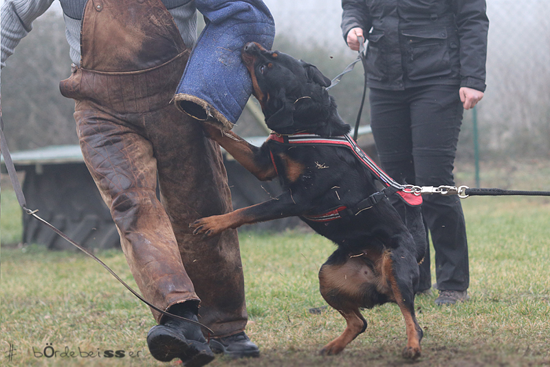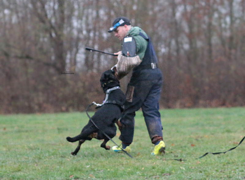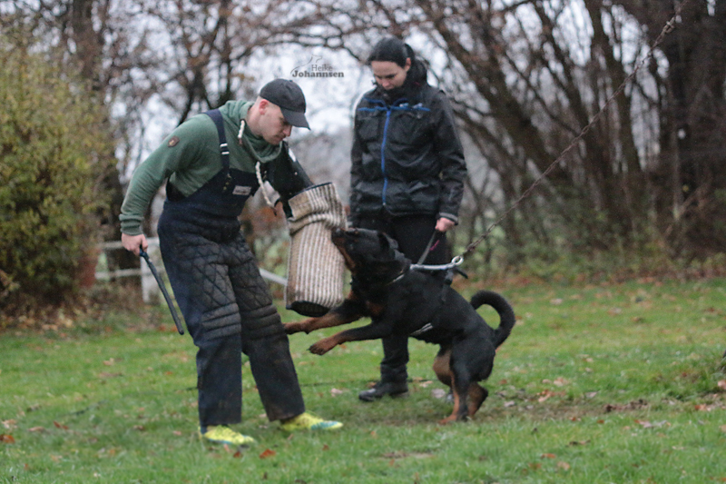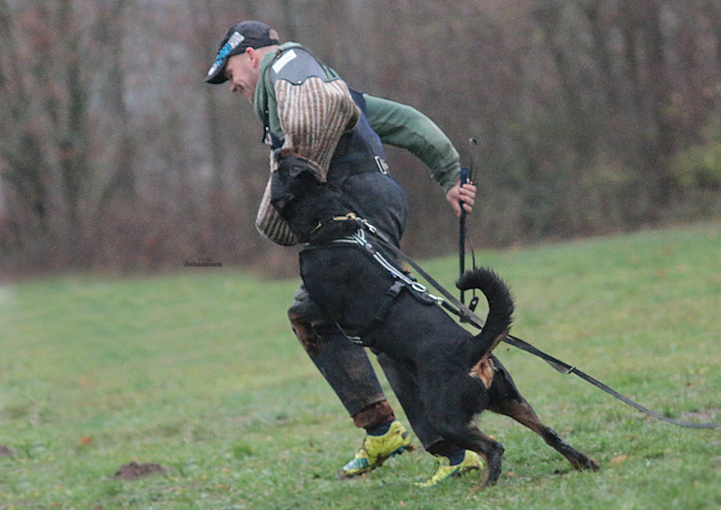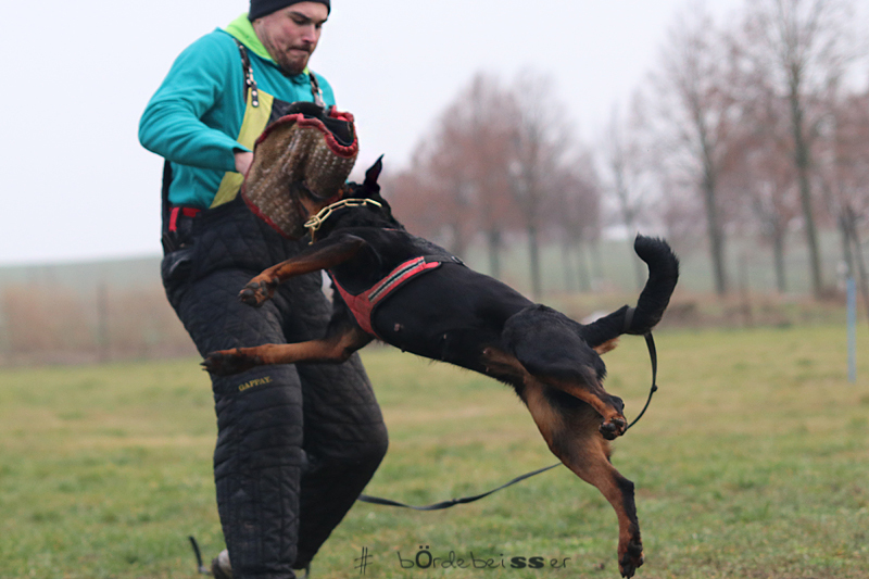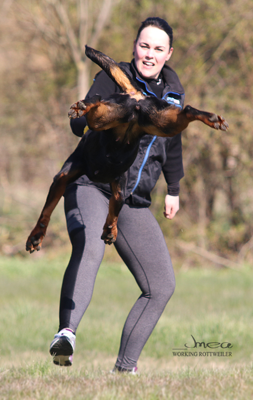 Im Schutzdienst zeigt sie ein gutes Griffverhalten und eine tolle Anbissgeschwindigkeit und bleibt auch in hohen Triebbereichen regelbar.