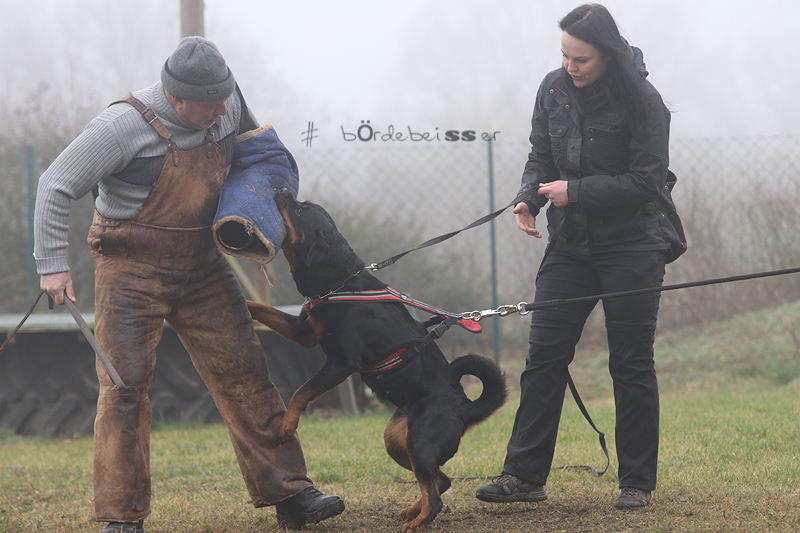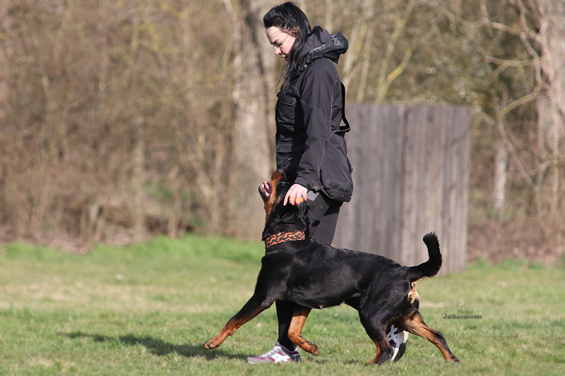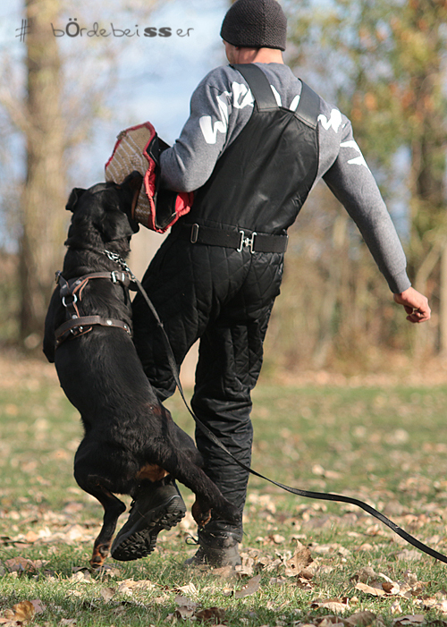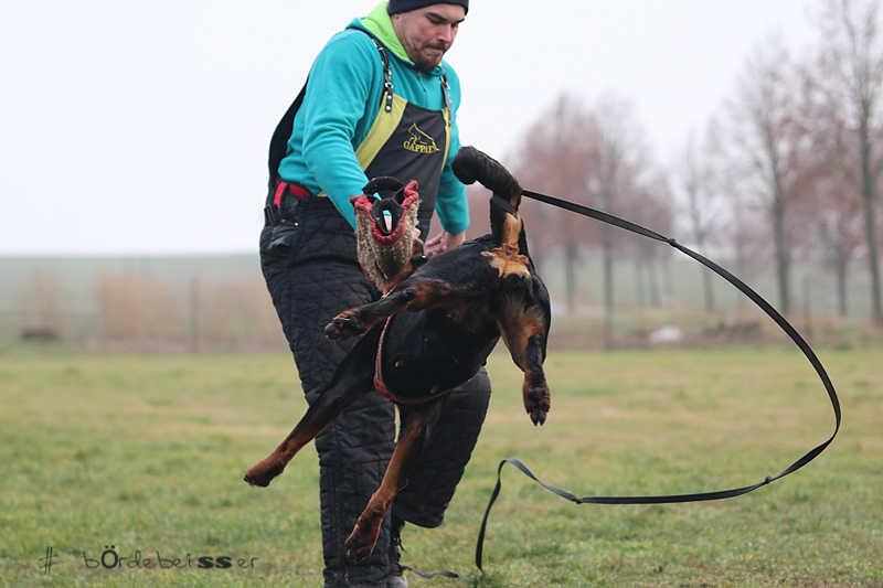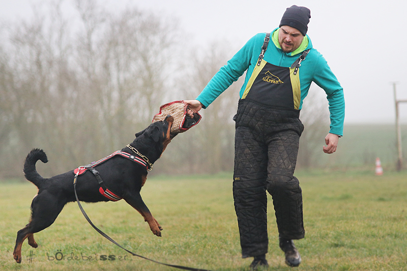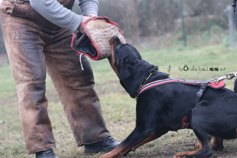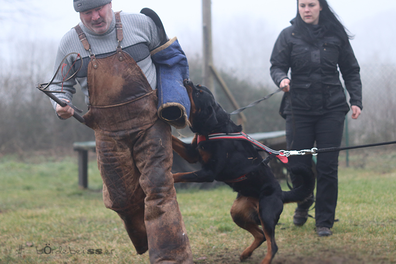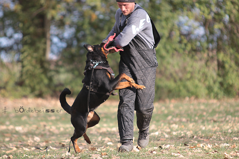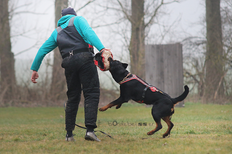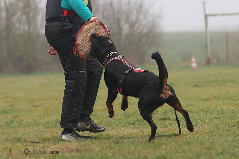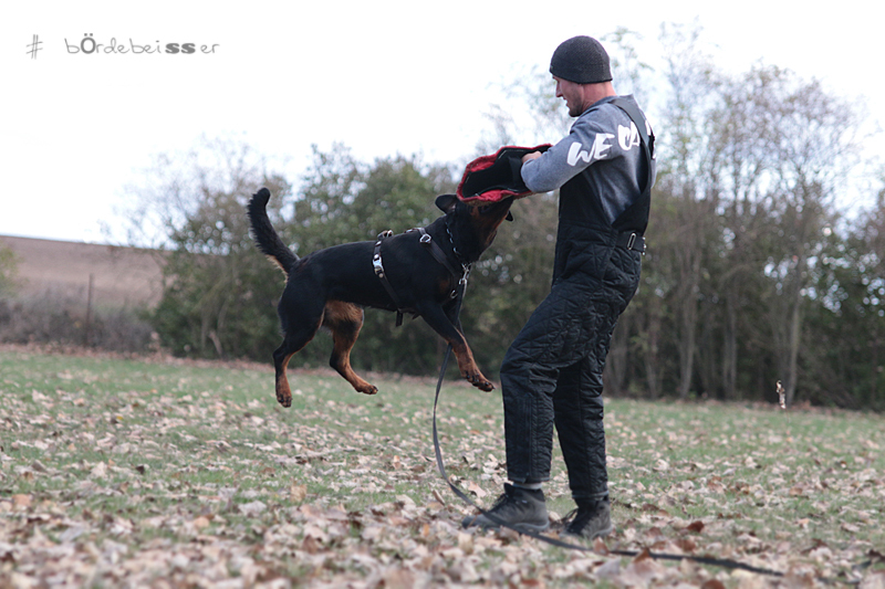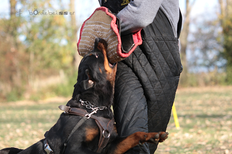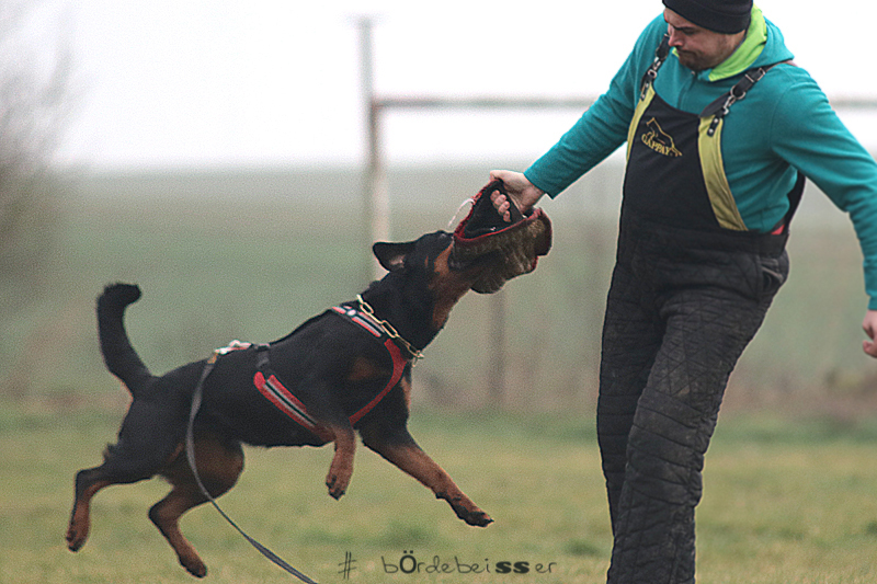 Im Schutzdienst zeigt sie ein gutes Griffverhalten und eine tolle Anbissgeschwindigkeit und bleibt auch in hohen Triebbereichen regelbar.