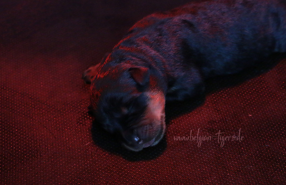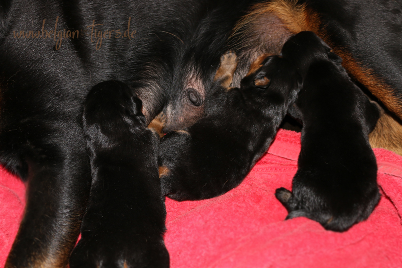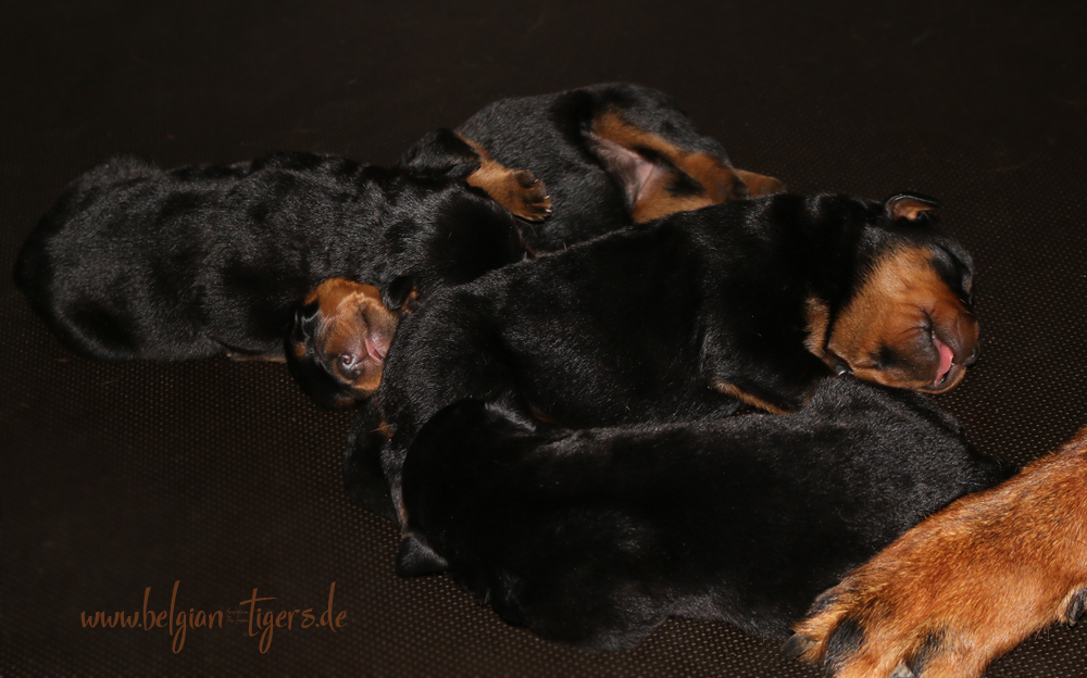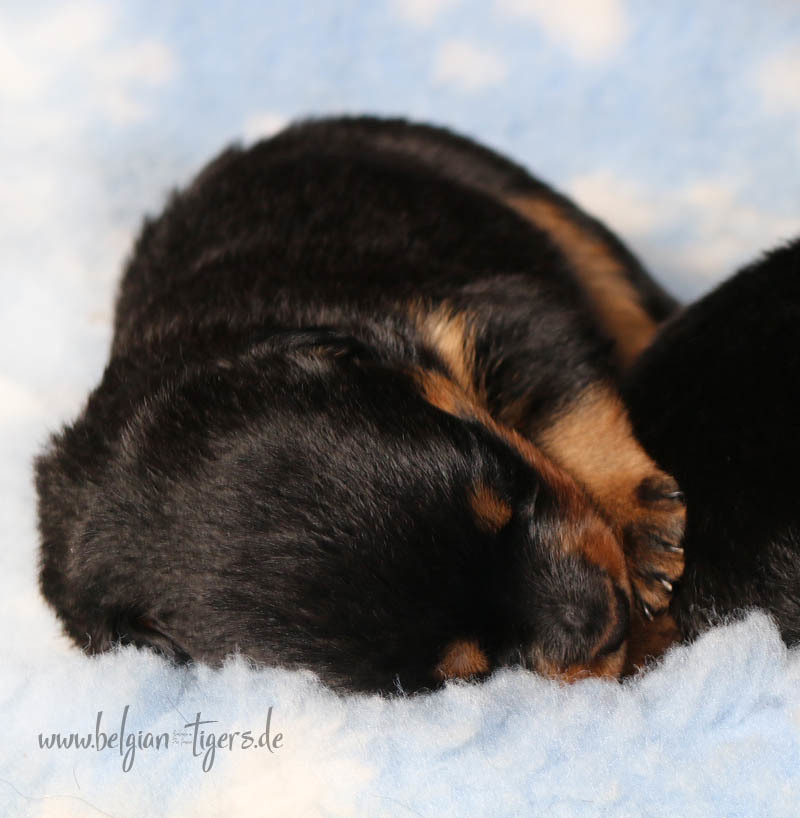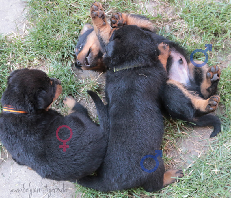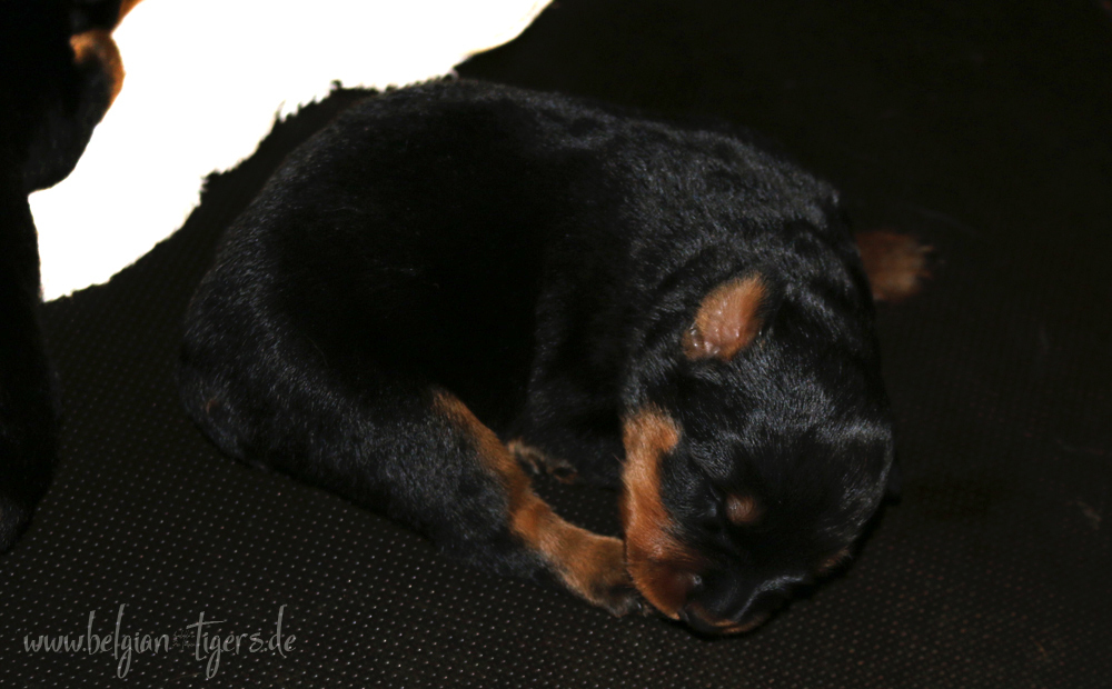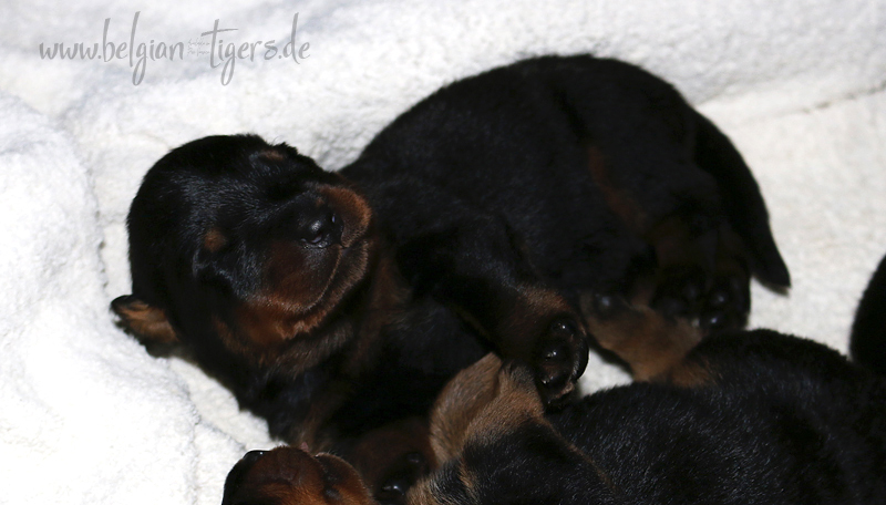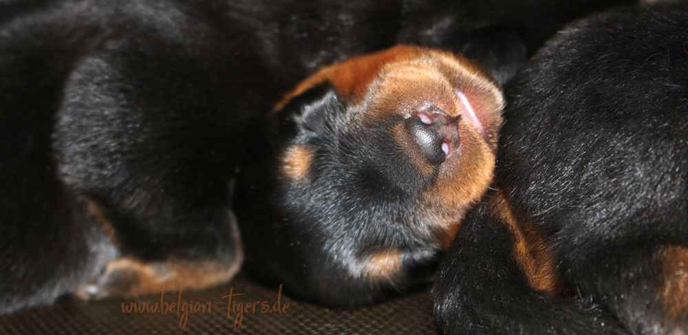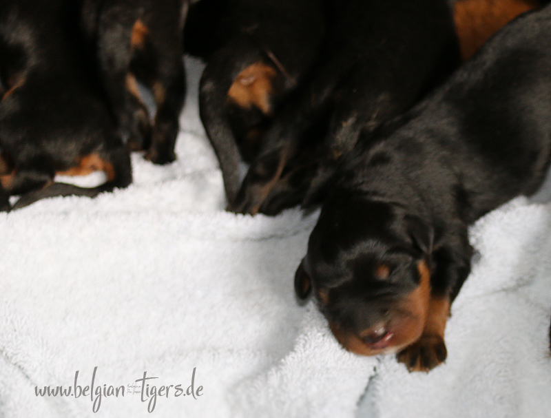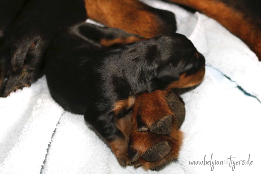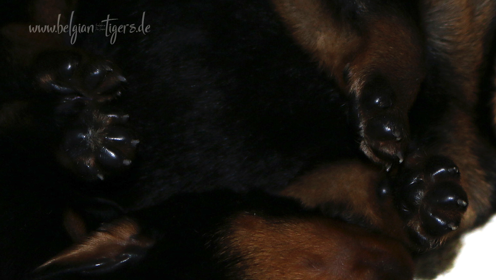 Ansonsten ist auch alles bestens. Bei den Rüden haben wir auf Anhieb je zwei kleine Murmeln entdeckt und alle Welpen haben ein ordentliches Scherengebiss und, auch wie bei Imeas letztem Wurf, haben wir keinen Nabelbruch. Fehlerfrei sind wir trotzdem nicht wegen unserem kleinen Bürzelchen, aber gut, damit kann man leben.