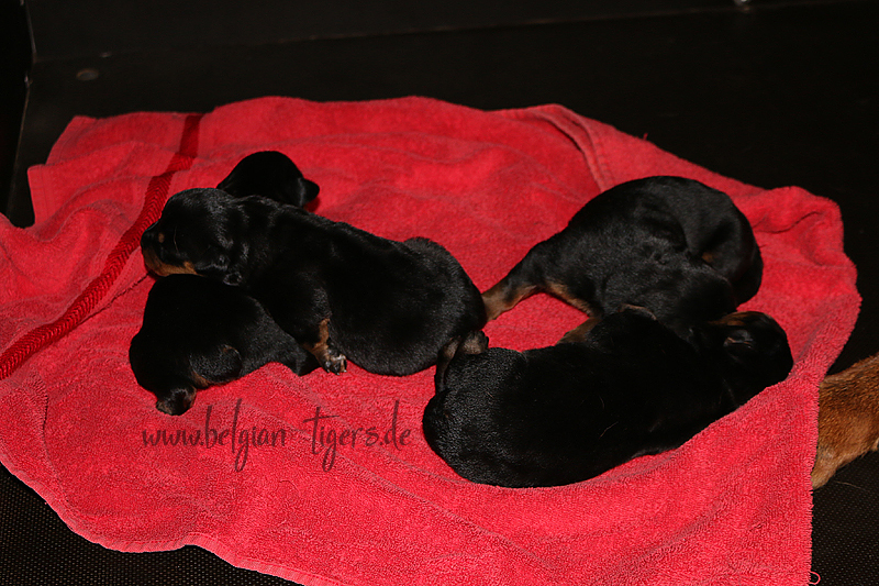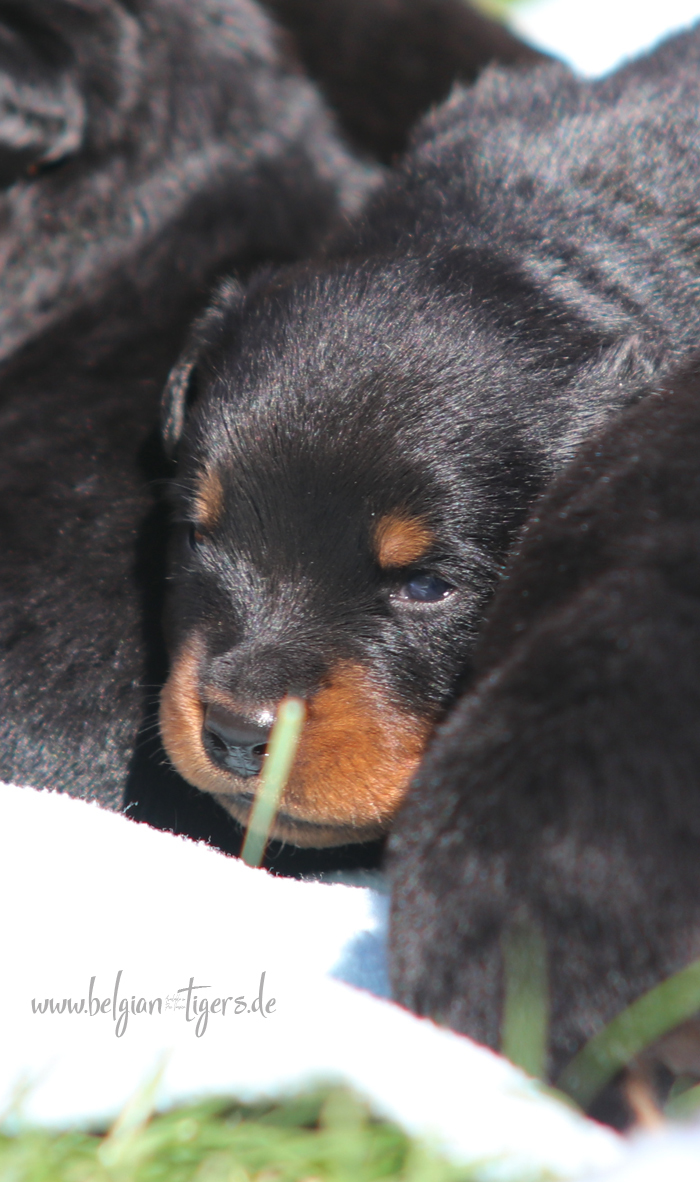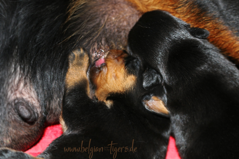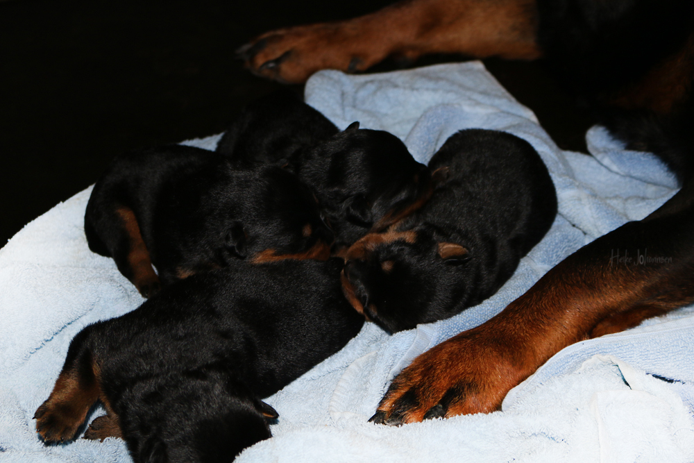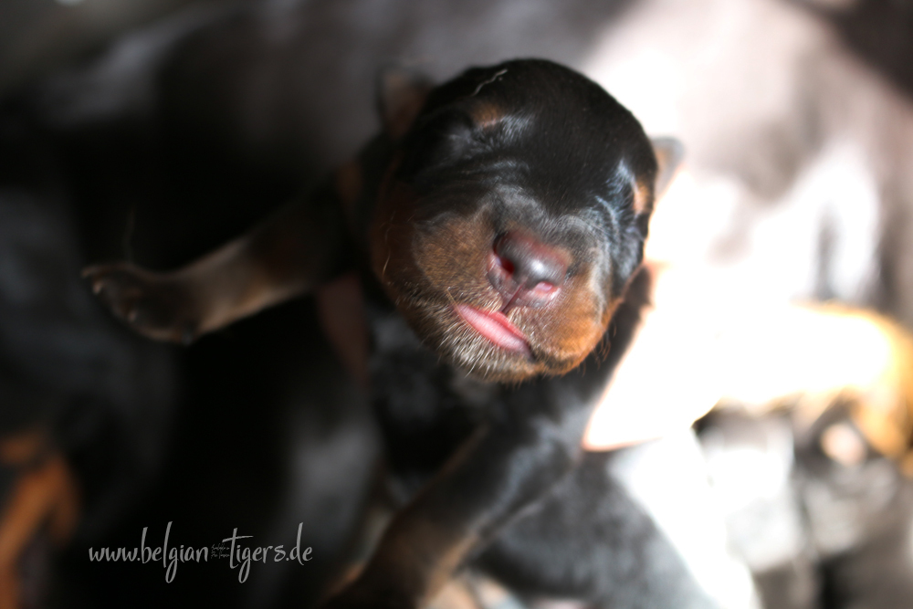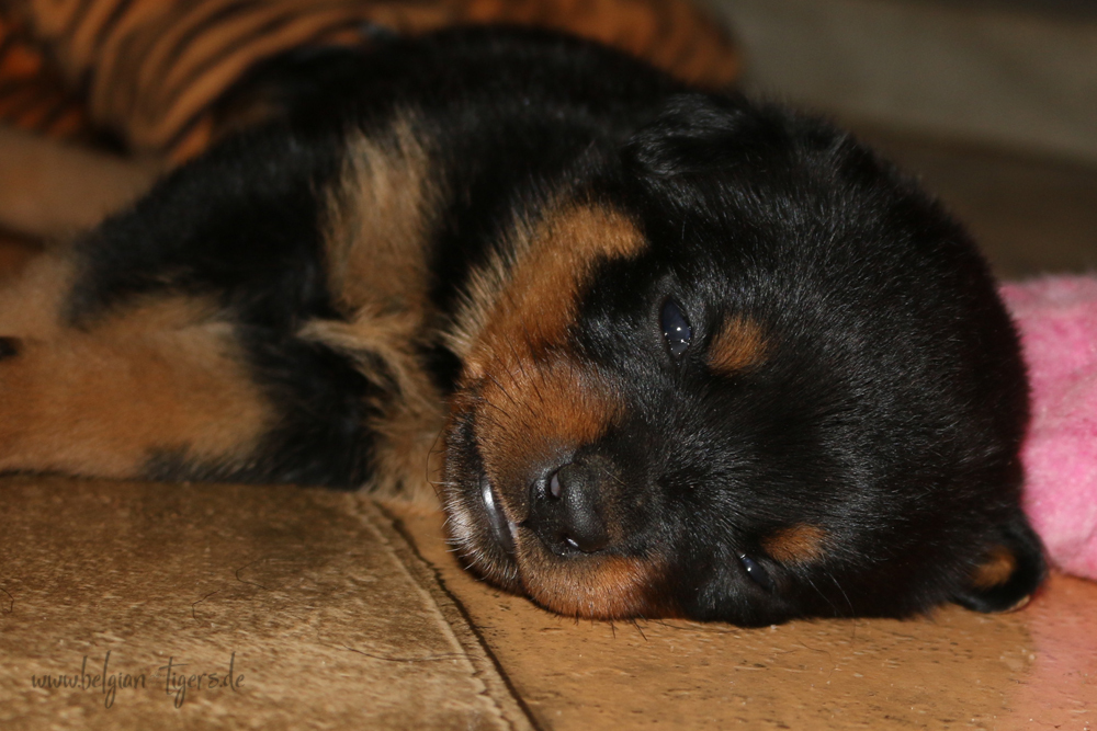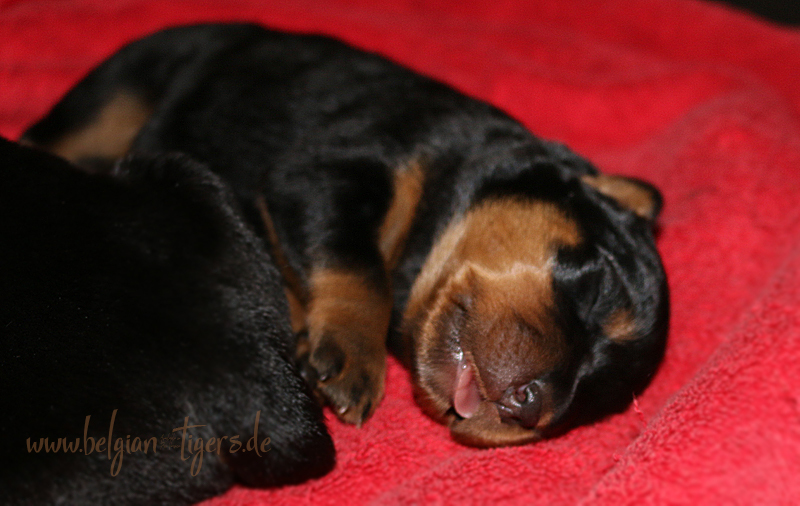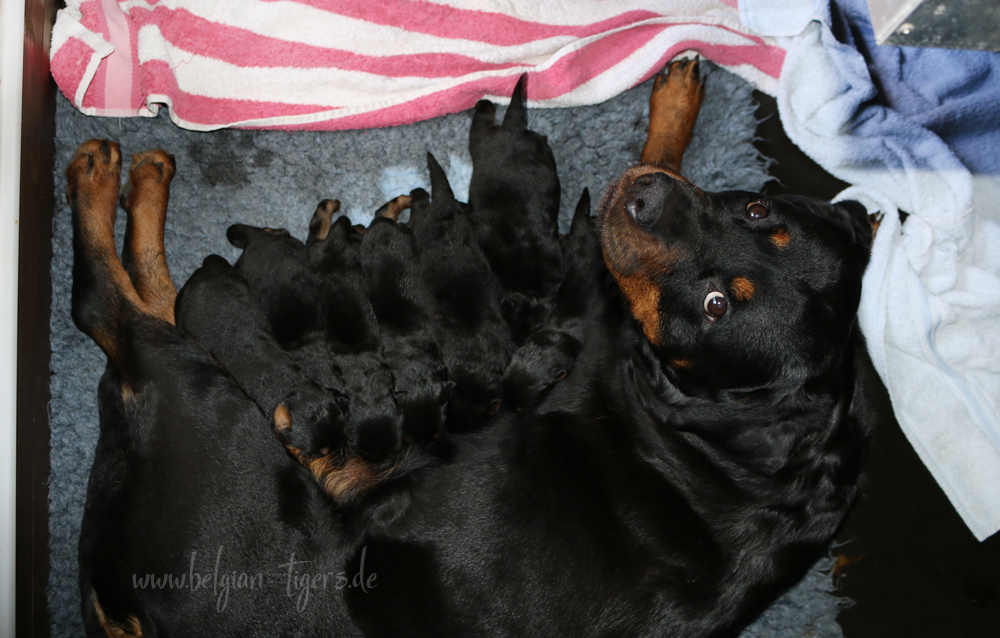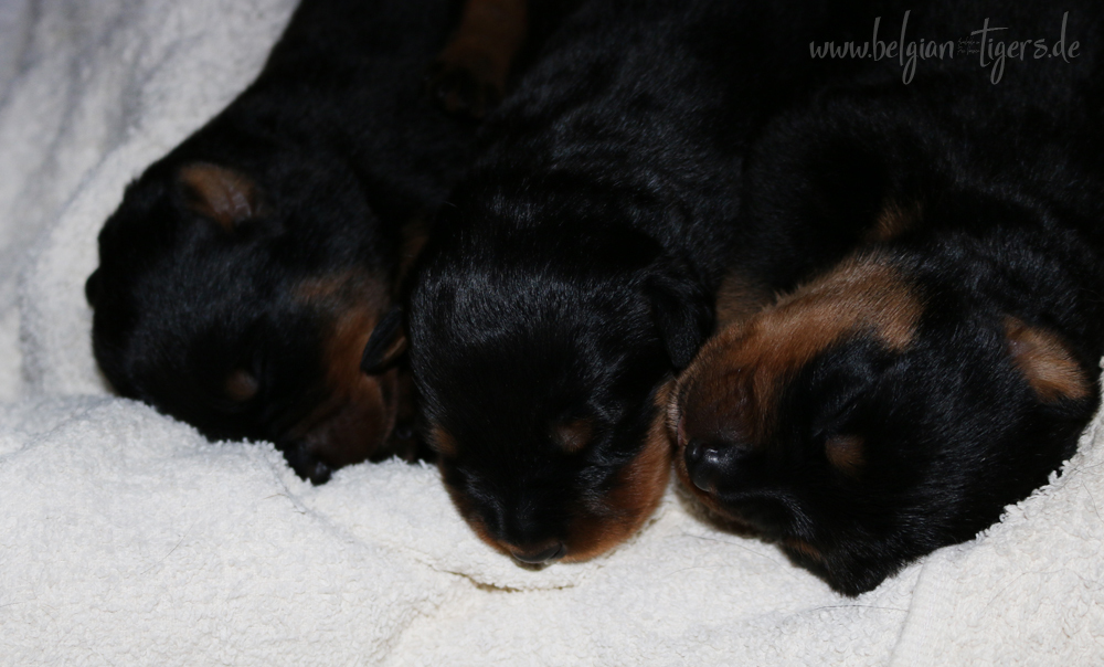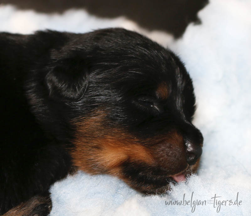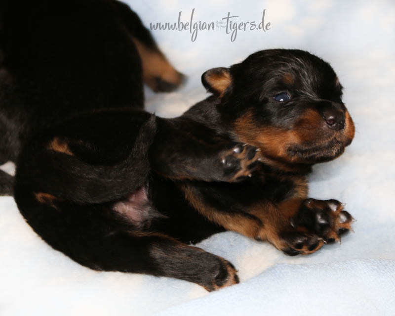 Ansonsten ist auch alles bestens. Bei den Rüden haben wir auf Anhieb je zwei kleine Murmeln entdeckt und alle Welpen haben ein ordentliches Scherengebiss und, auch wie bei Imeas letztem Wurf, haben wir keinen Nabelbruch. Fehlerfrei sind wir trotzdem nicht wegen unserem kleinen Bürzelchen, aber gut, damit kann man leben.