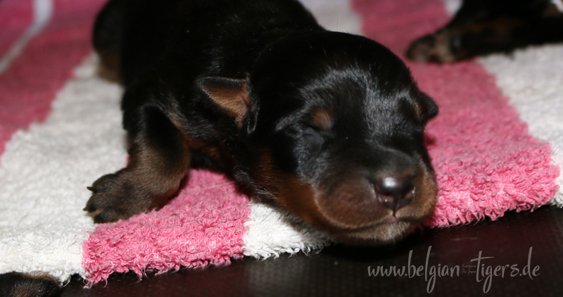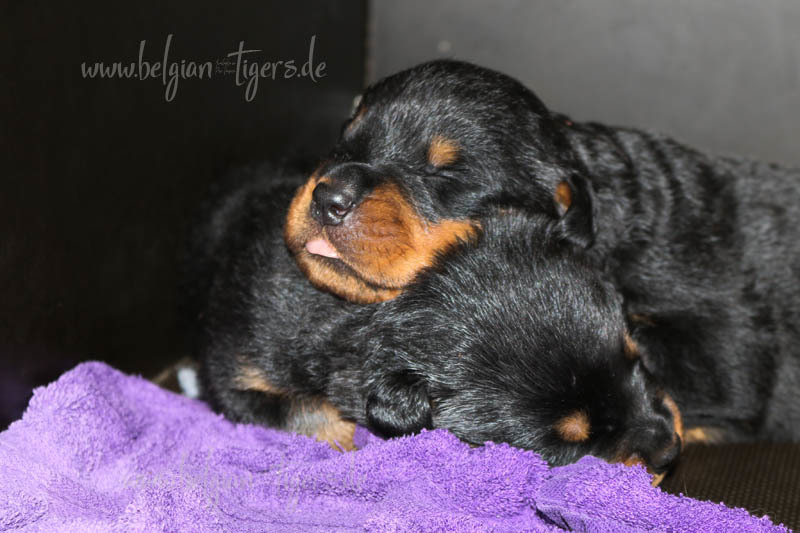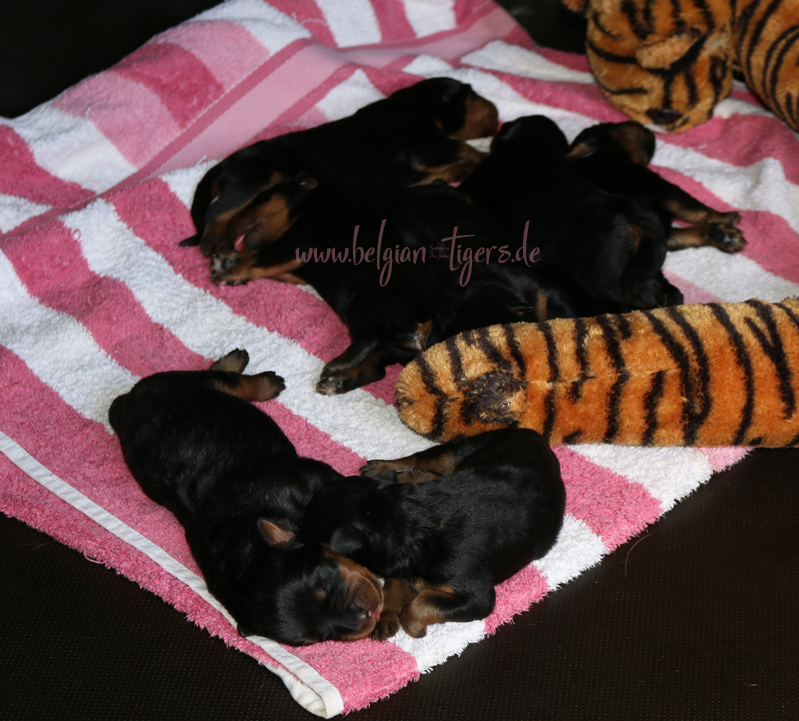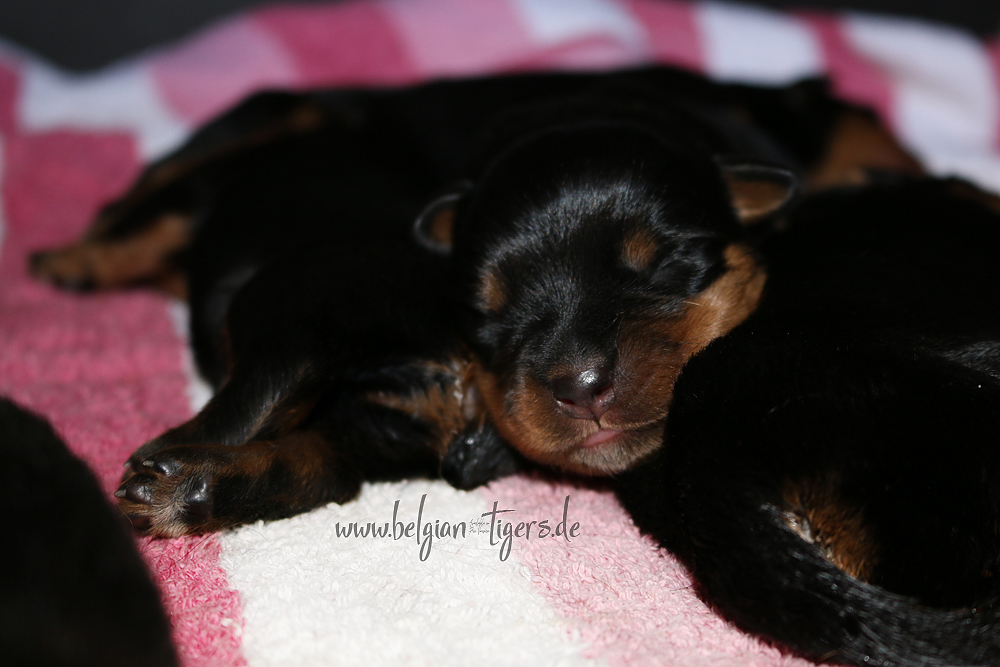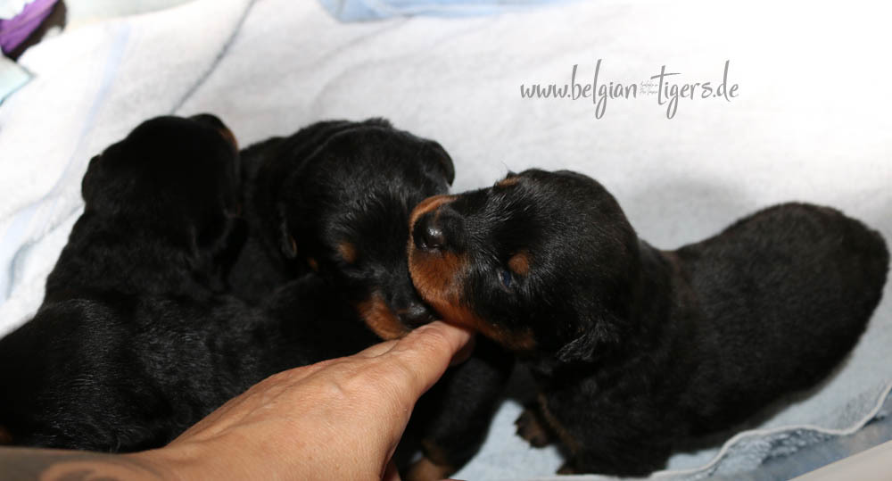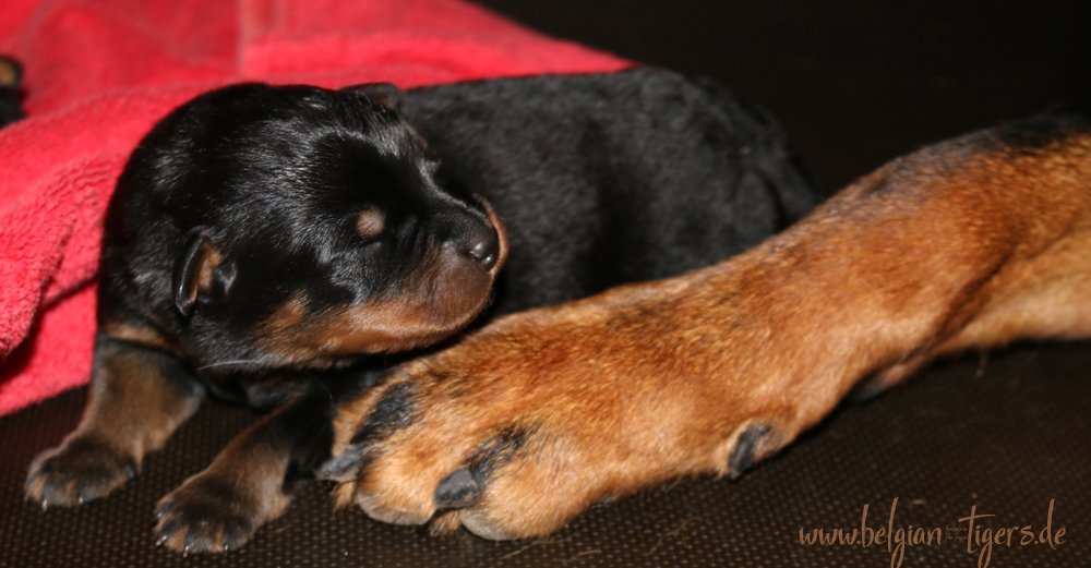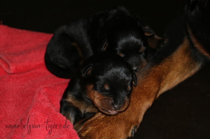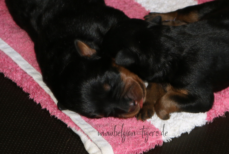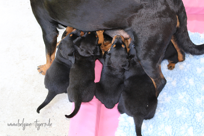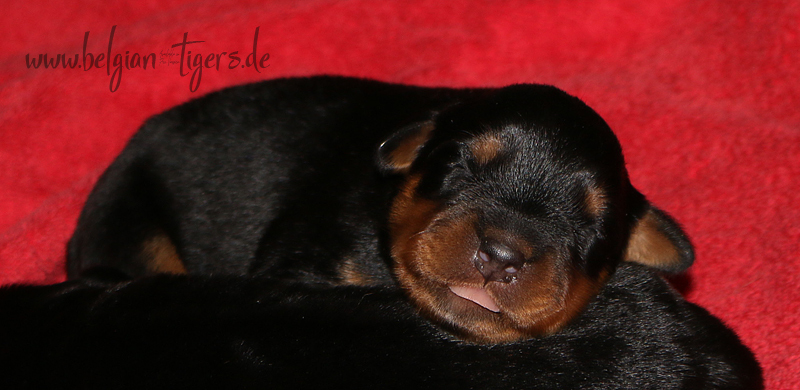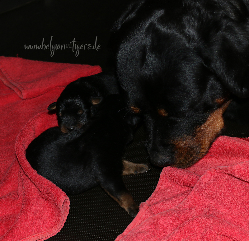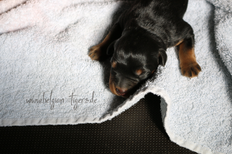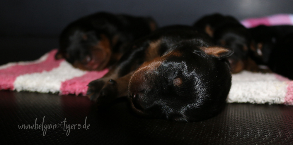 Ansonsten ist auch alles bestens. Bei den Rüden haben wir auf Anhieb je zwei kleine Murmeln entdeckt und alle Welpen haben ein ordentliches Scherengebiss und, auch wie bei Imeas letztem Wurf, haben wir keinen Nabelbruch. Fehlerfrei sind wir trotzdem nicht wegen unserem kleinen Bürzelchen, aber gut, damit kann man leben.