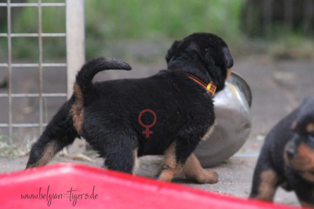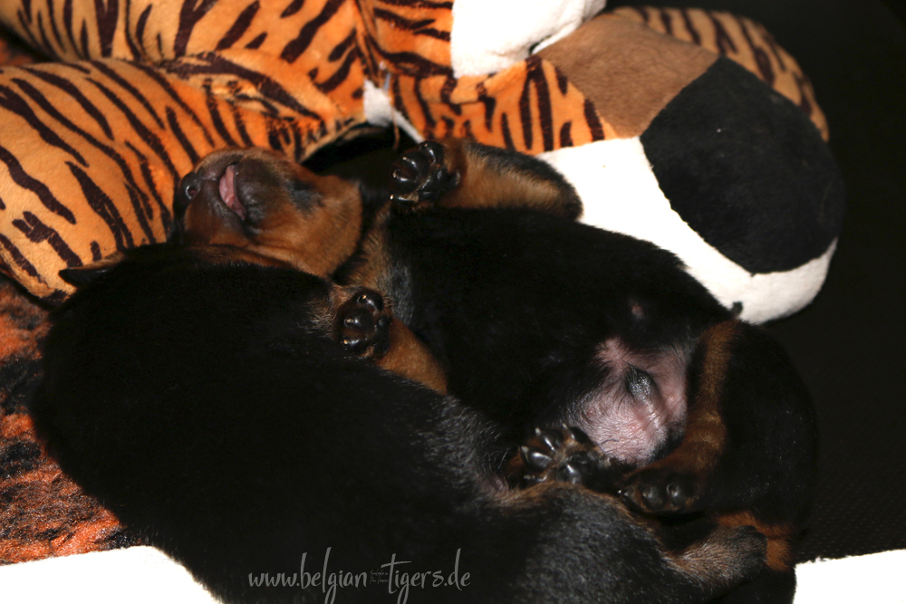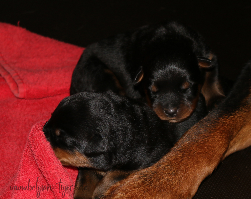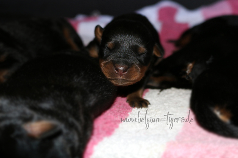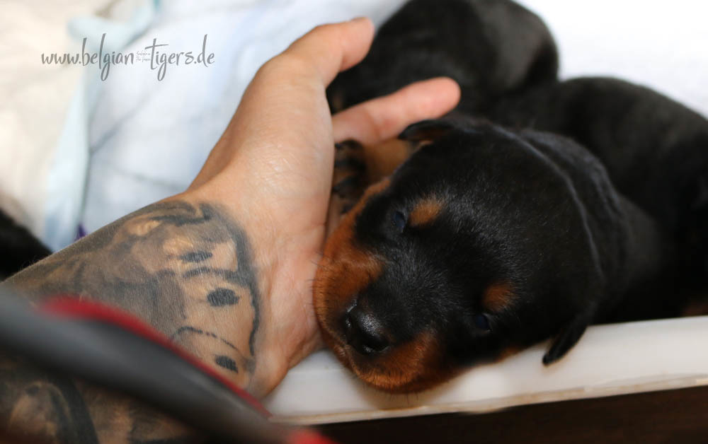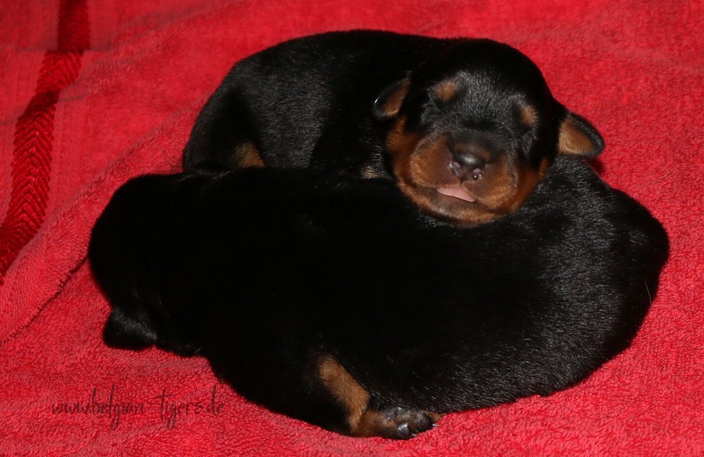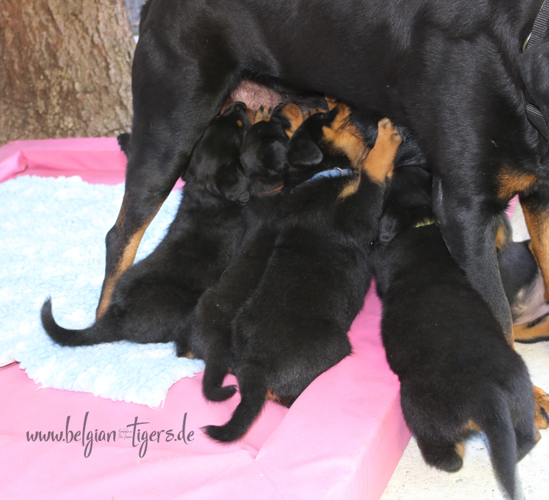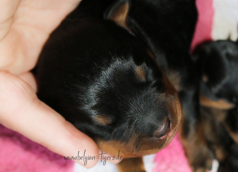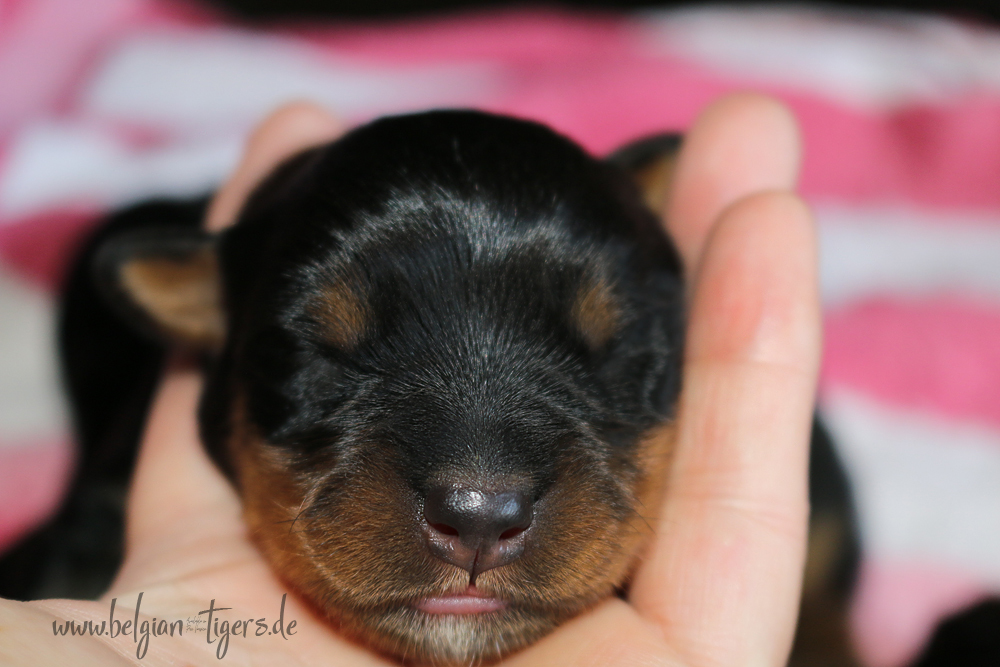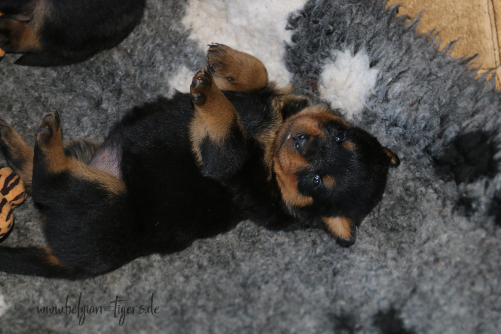Ansonsten ist auch alles bestens. Bei den Rüden haben wir auf Anhieb je zwei kleine Murmeln entdeckt und alle Welpen haben ein ordentliches Scherengebiss und, auch wie bei Imeas letztem Wurf, haben wir keinen Nabelbruch. Fehlerfrei sind wir trotzdem nicht wegen unserem kleinen Bürzelchen, aber gut, damit kann man leben.