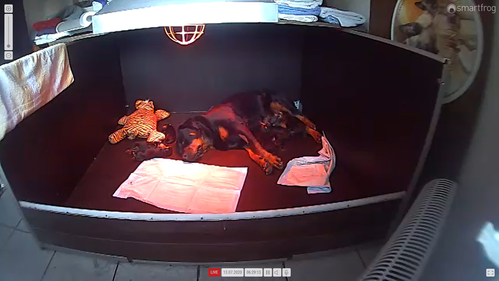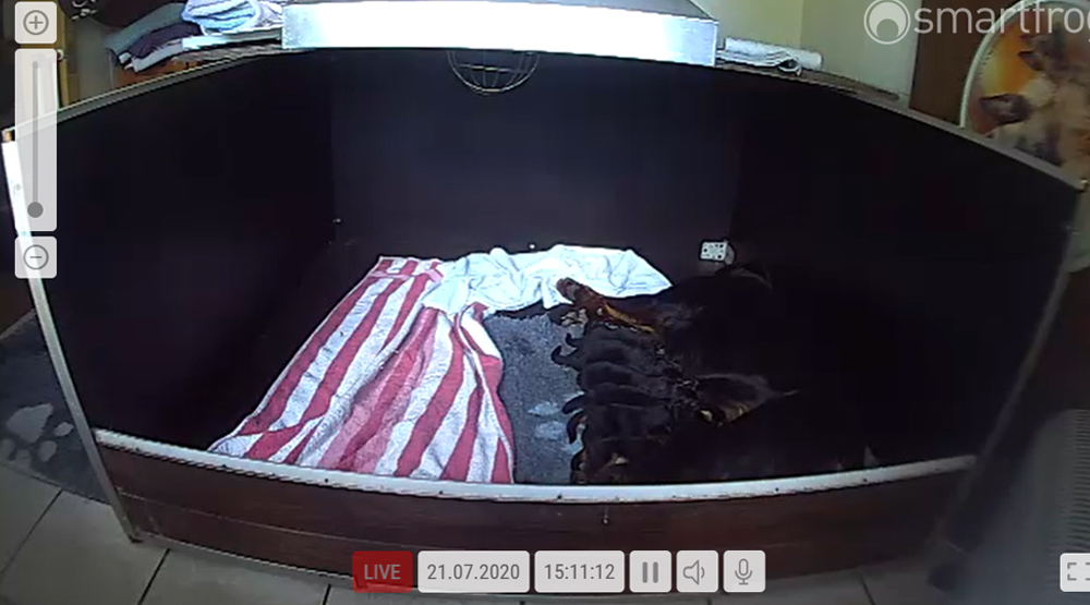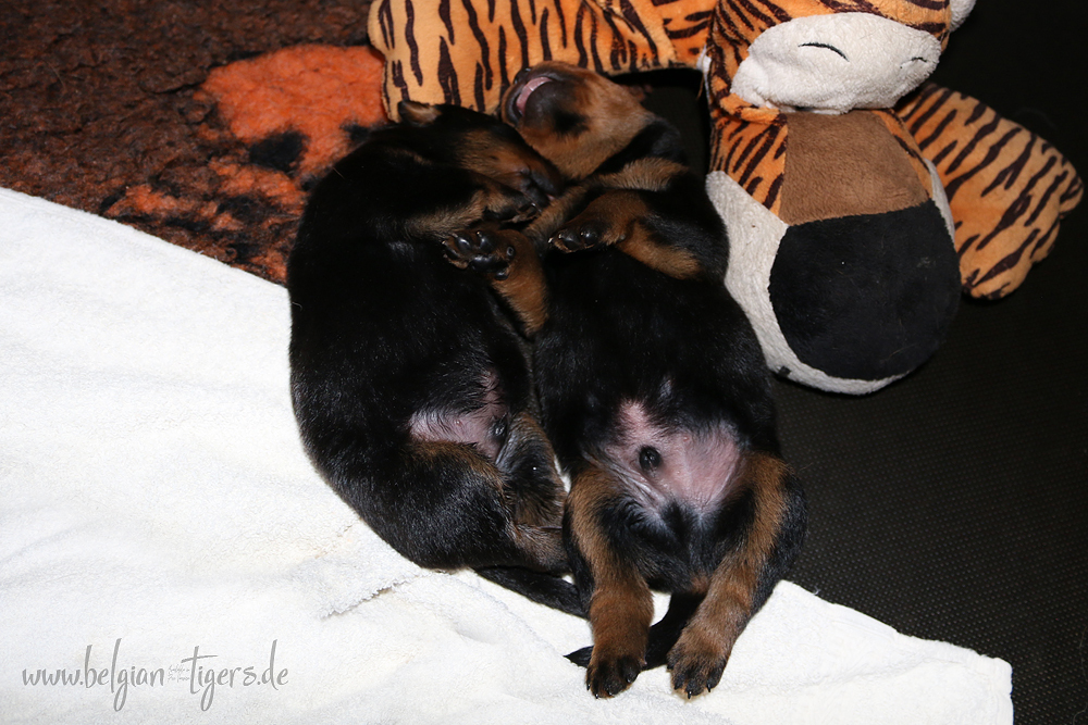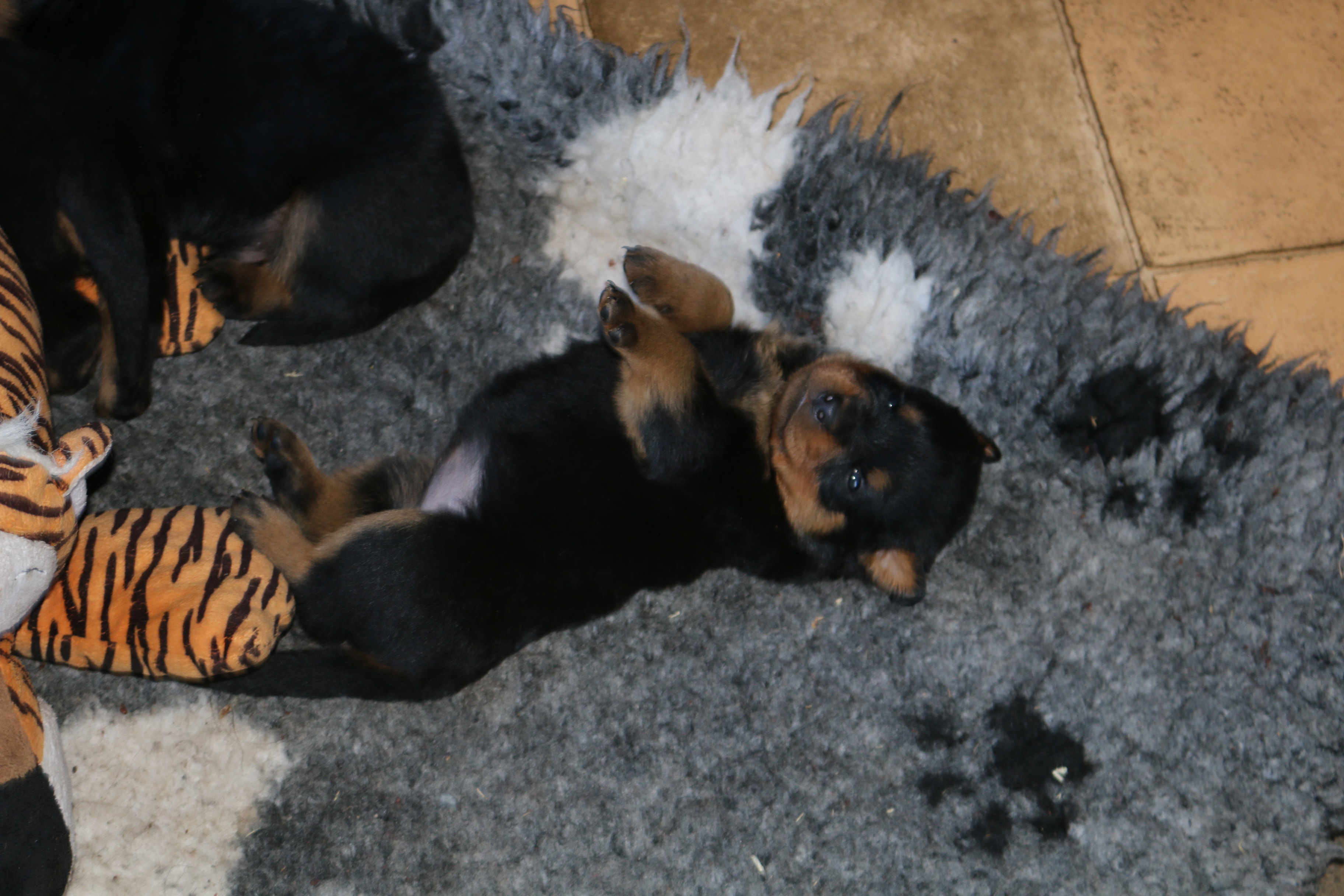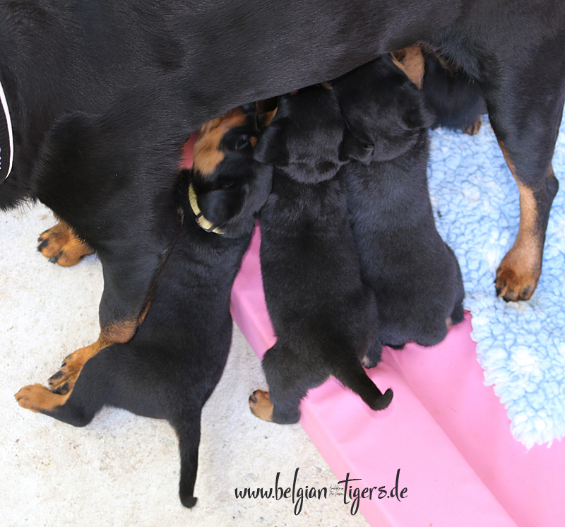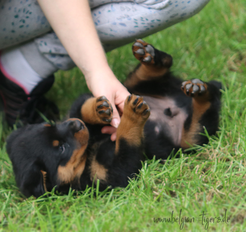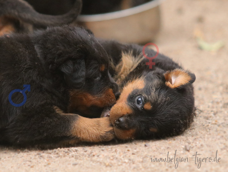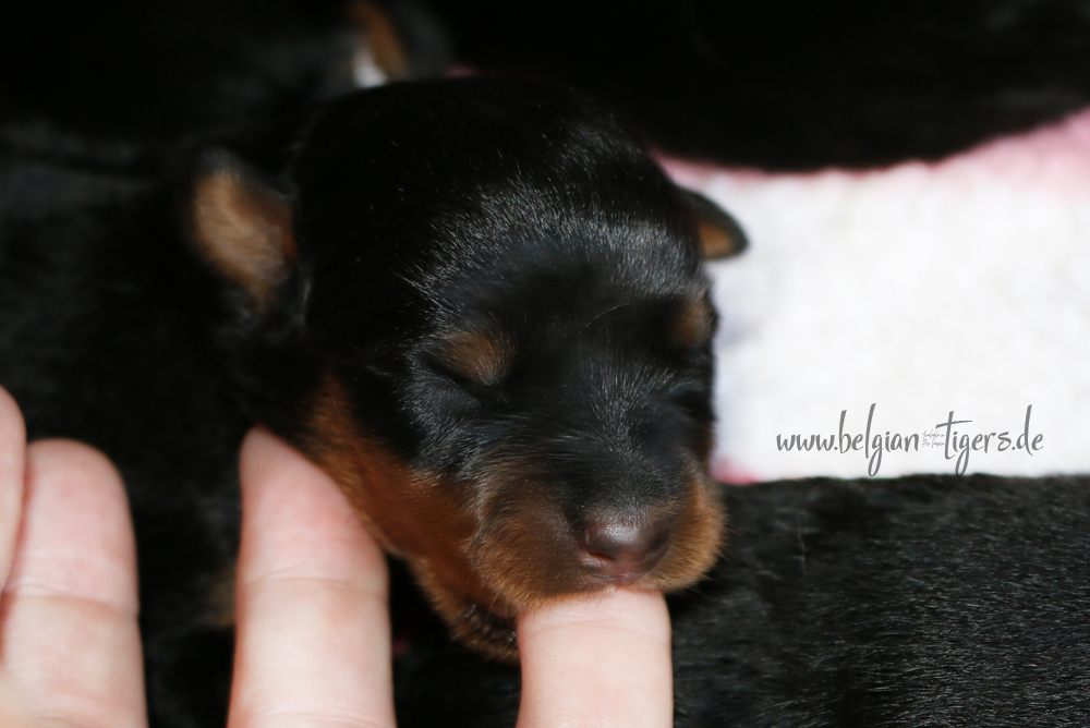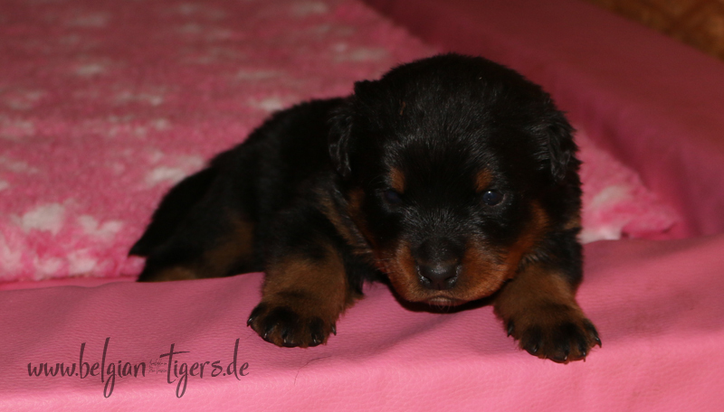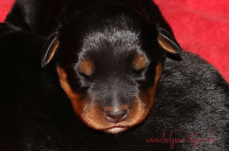 Ansonsten ist auch alles bestens. Bei den Rüden haben wir auf Anhieb je zwei kleine Murmeln entdeckt und alle Welpen haben ein ordentliches Scherengebiss und, auch wie bei Imeas letztem Wurf, haben wir keinen Nabelbruch. Fehlerfrei sind wir trotzdem nicht wegen unserem kleinen Bürzelchen, aber gut, damit kann man leben.