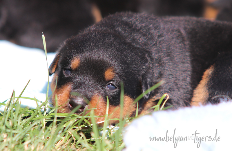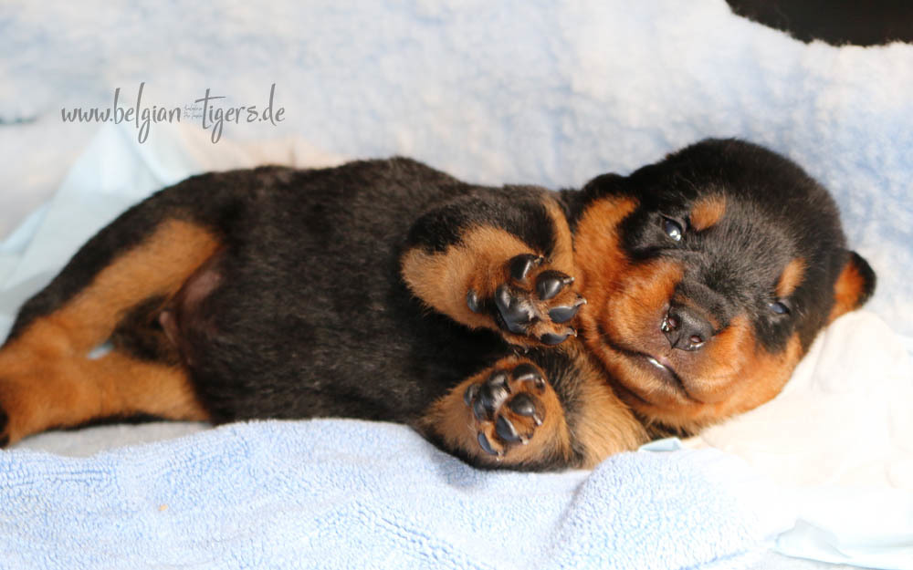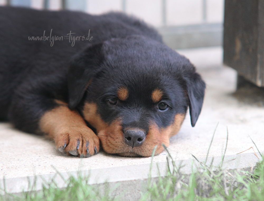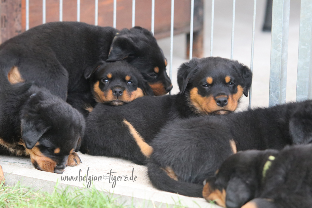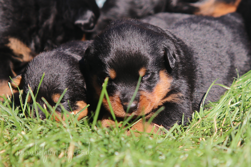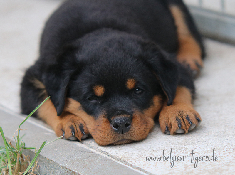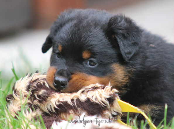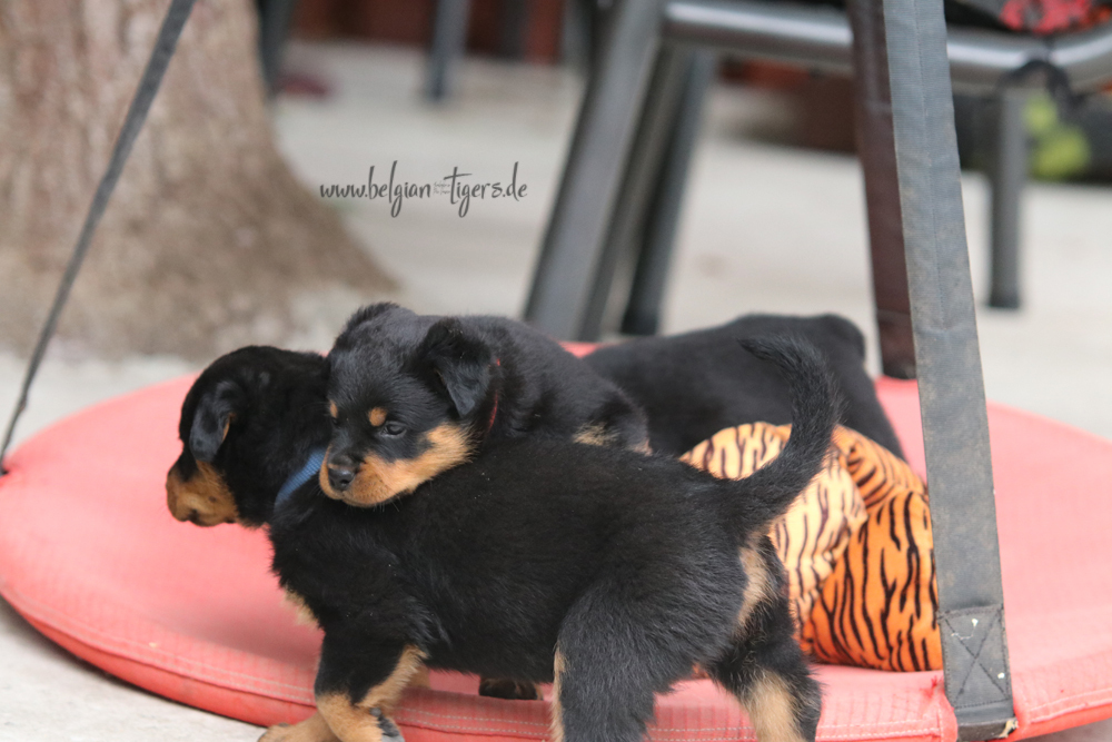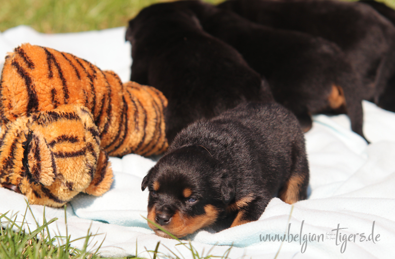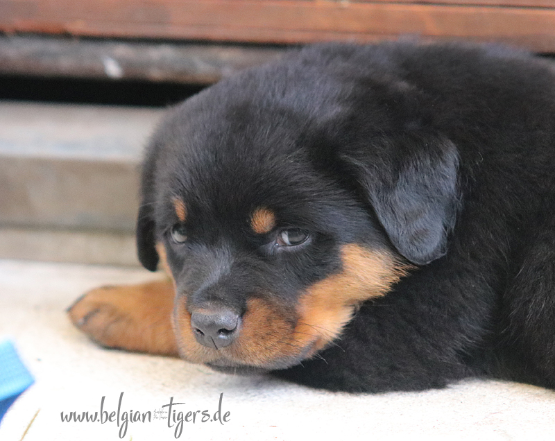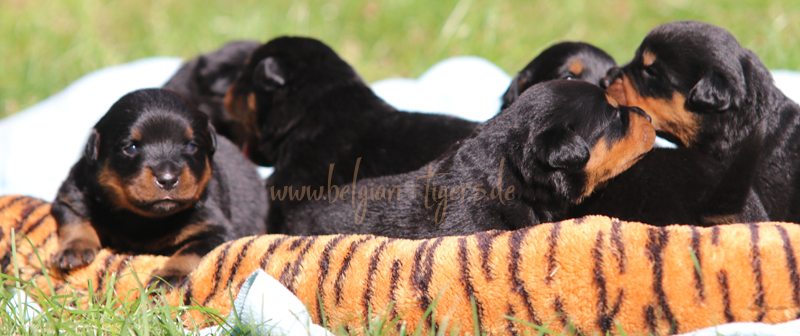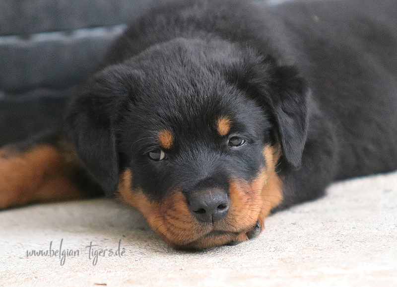 Jetzt ists amtlich - unsere kleinen Tiger dürfen ab Samstag offiziell ausziehen :-) Unser Zuchtwart hat das GO gegeben - alle Welpen haben das Mindestgewicht, mehr als erreicht - sogar unsere Minirotte Caycee. Wer hätte das gedacht. Unser Anführer Coolhead hat es auf 7 kg gebracht und *das kleine Caycee* bringt stolze 5,1 Kilo