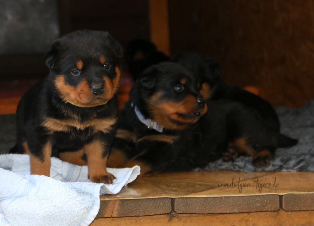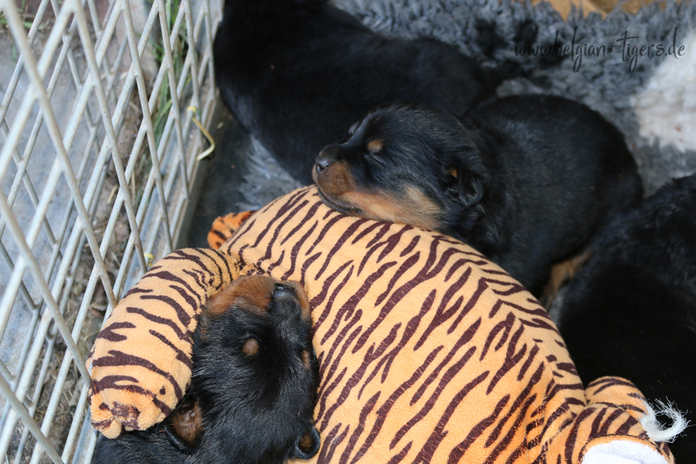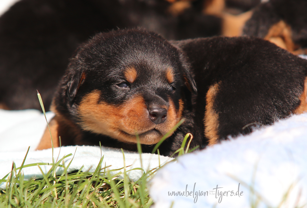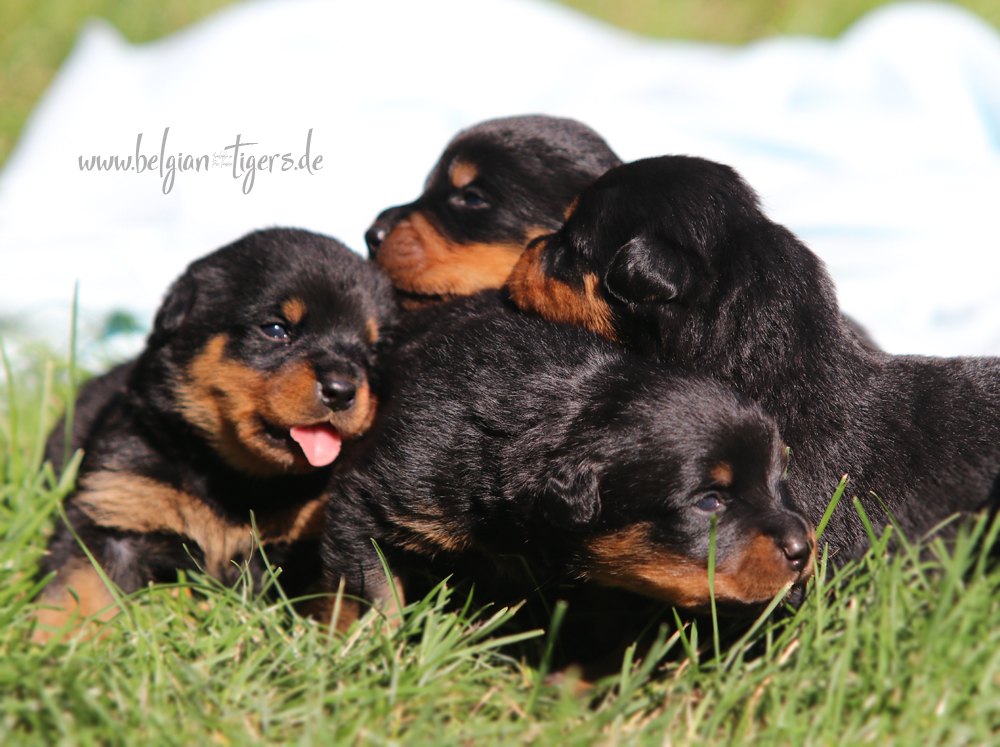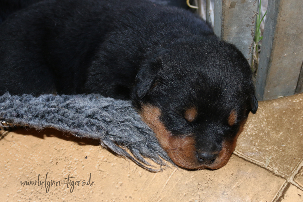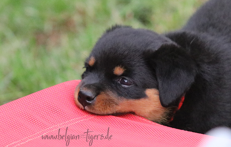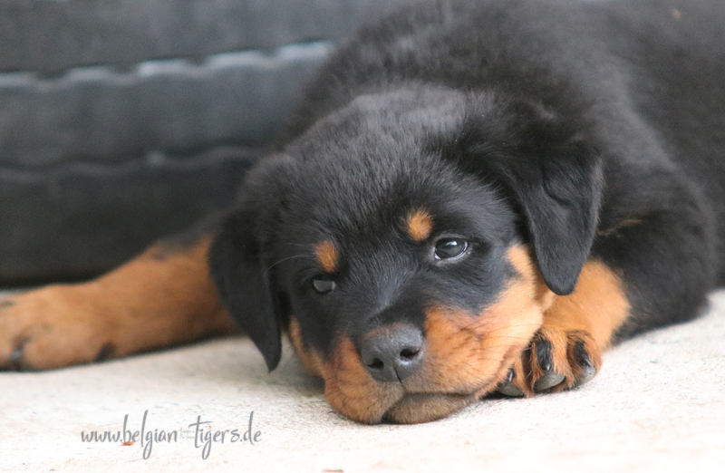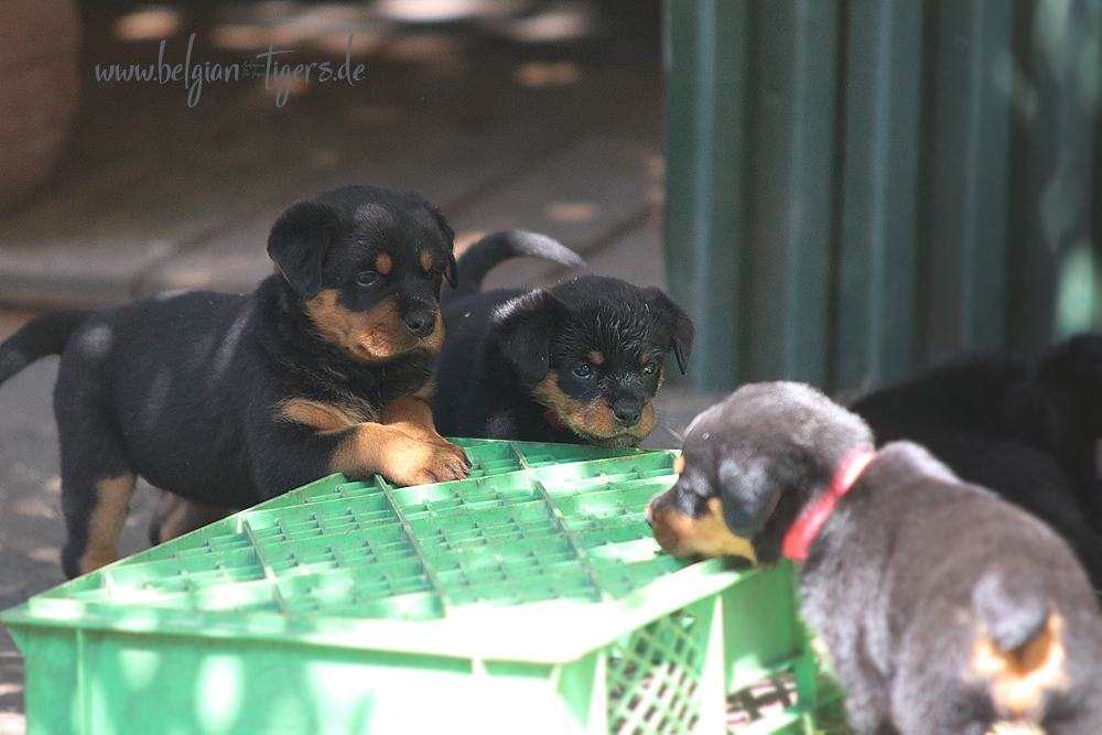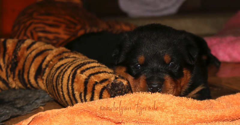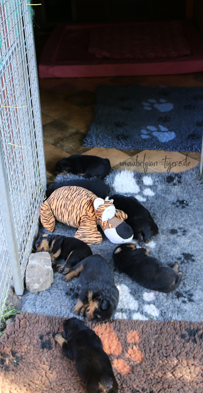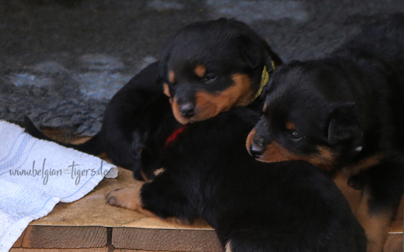 Jetzt ists amtlich - unsere kleinen Tiger dürfen ab Samstag offiziell ausziehen :-) Unser Zuchtwart hat das GO gegeben - alle Welpen haben das Mindestgewicht, mehr als erreicht - sogar unsere Minirotte Caycee. Wer hätte das gedacht. Unser Anführer Coolhead hat es auf 7 kg gebracht und *das kleine Caycee* bringt stolze 5,1 Kilo