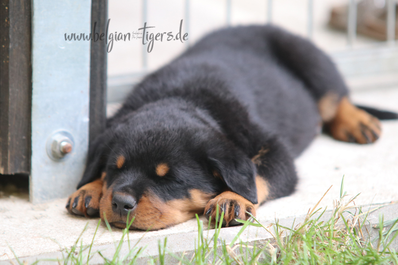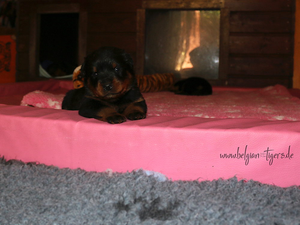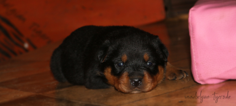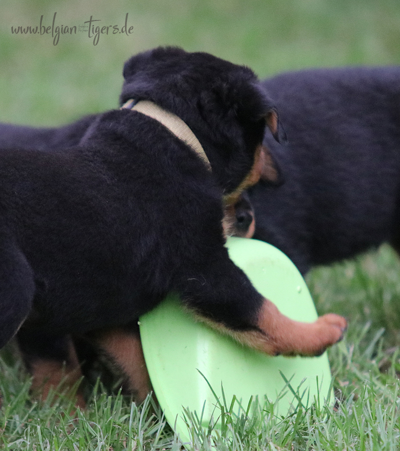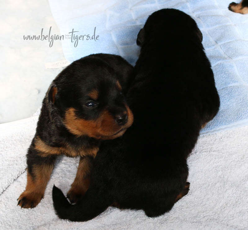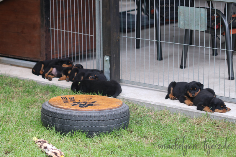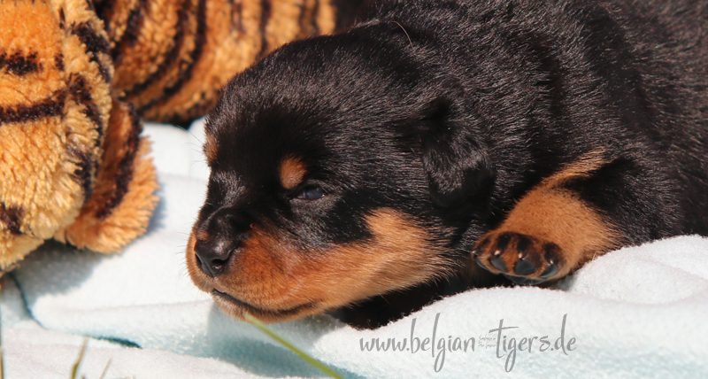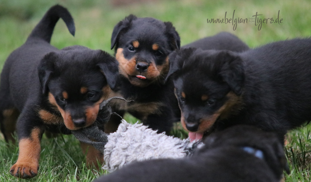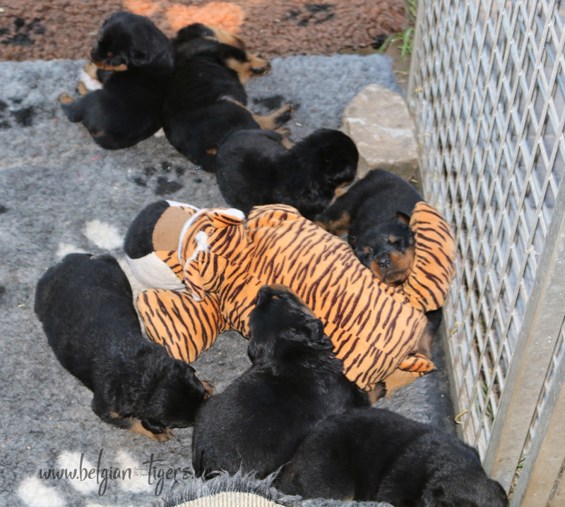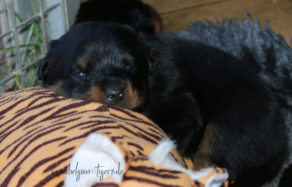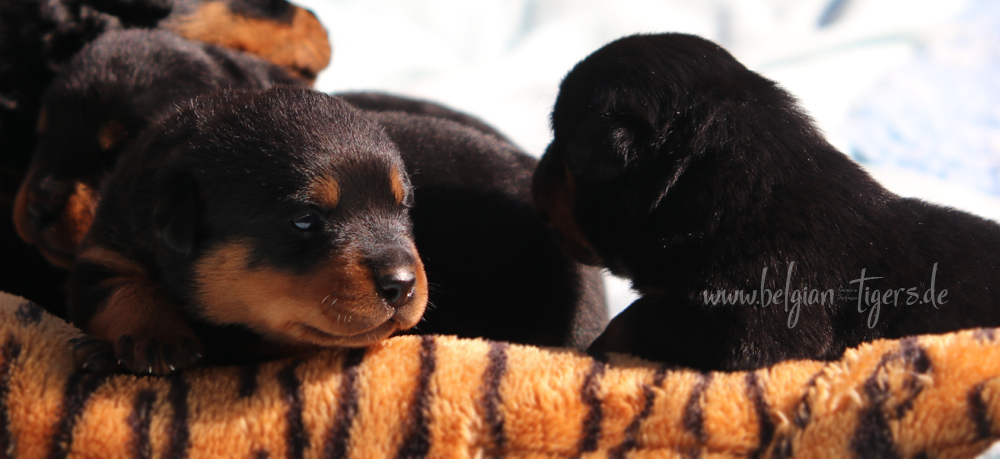 Jetzt ists amtlich - unsere kleinen Tiger dürfen ab Samstag offiziell ausziehen :-) Unser Zuchtwart hat das GO gegeben - alle Welpen haben das Mindestgewicht, mehr als erreicht - sogar unsere Minirotte Caycee. Wer hätte das gedacht. Unser Anführer Coolhead hat es auf 7 kg gebracht und *das kleine Caycee* bringt stolze 5,1 Kilo