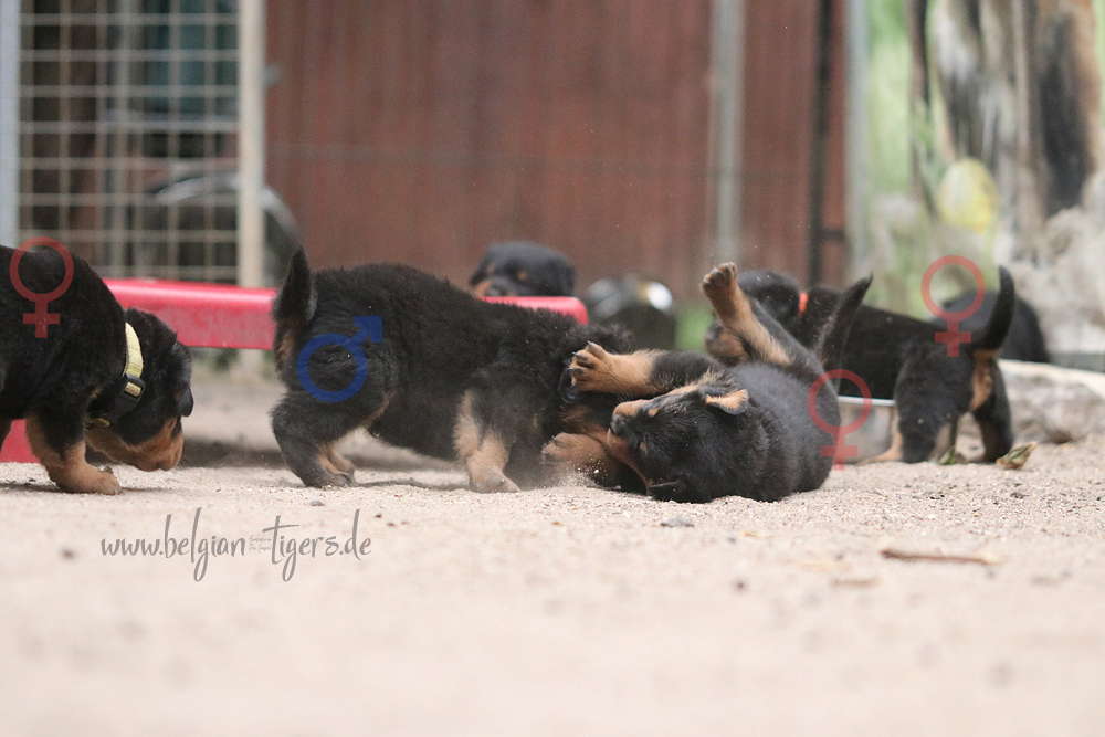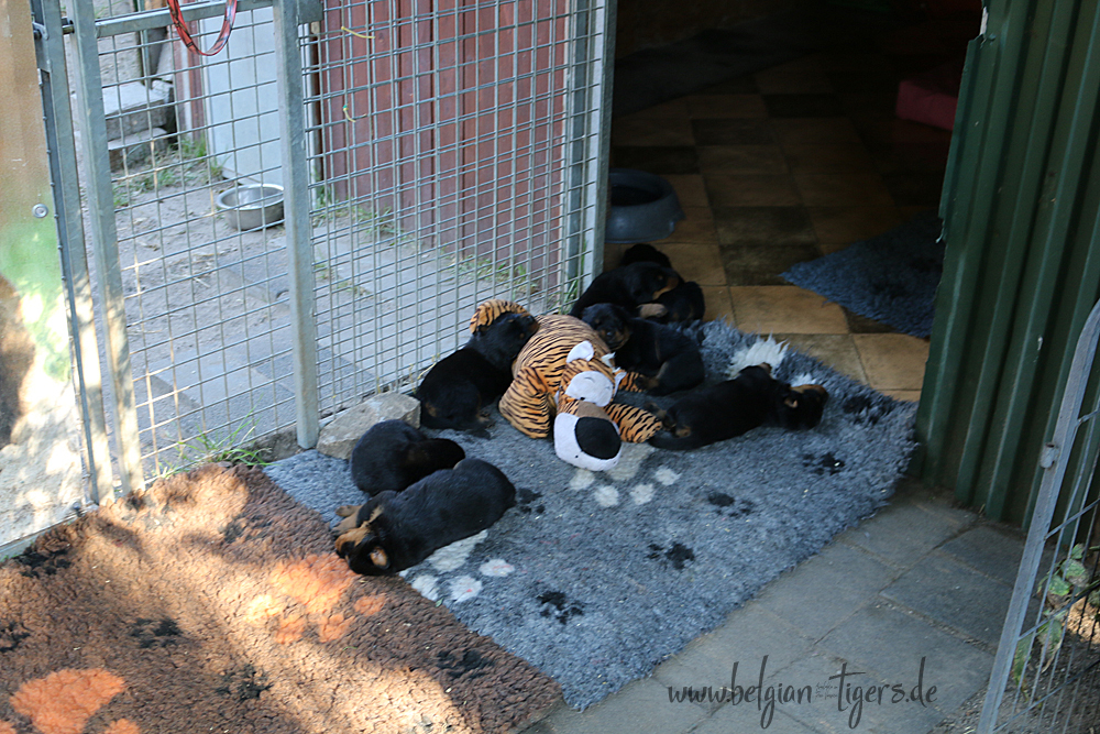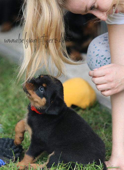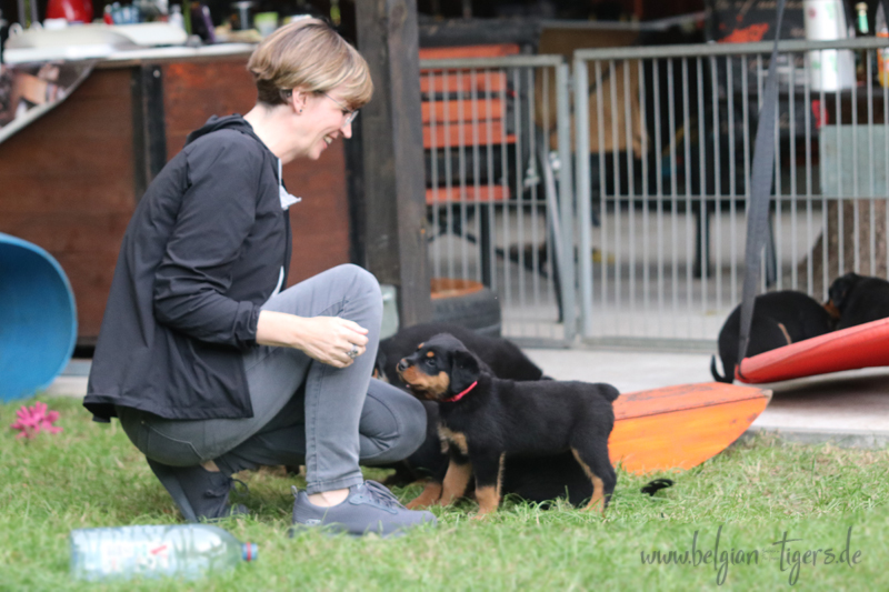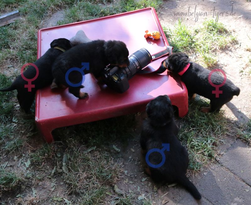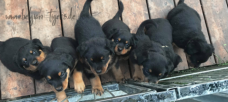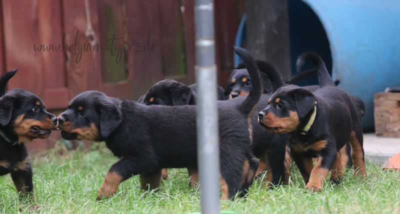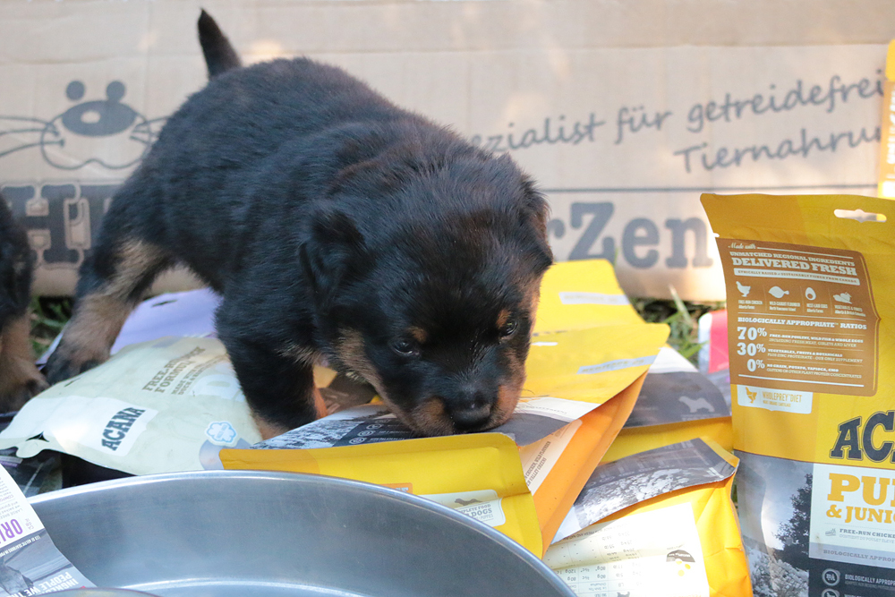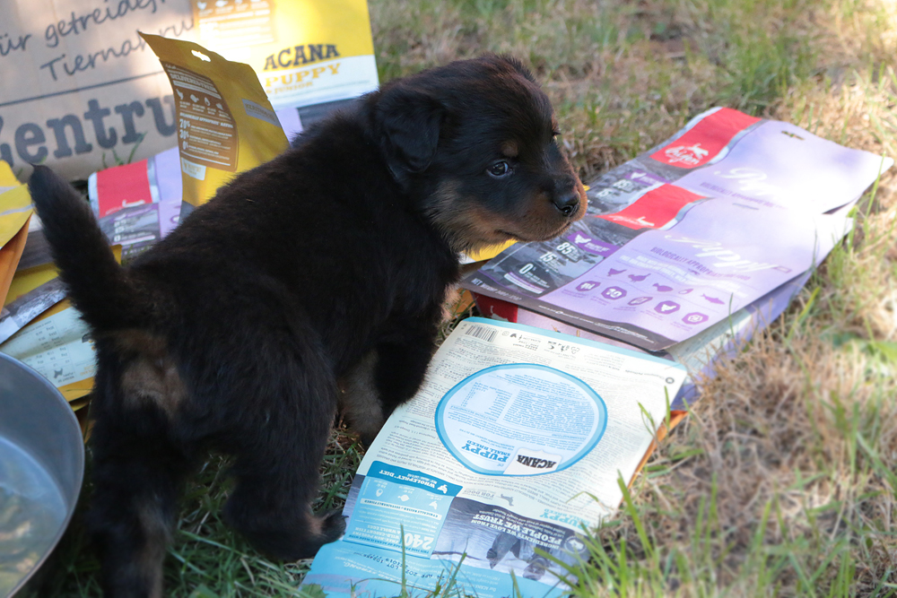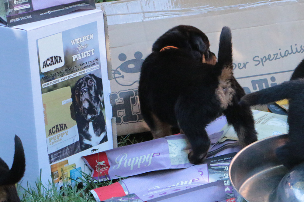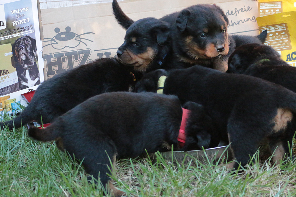 Bei uns hier war ganz schön Trubel in den letzten Wochen, aber nun ist wieder Ruhe - alle neuen Besitzer waren hier - manche sogar 2 oder 3 mal. Alle Welpen zeigen sich mega gut, sie sind schön freundlich und offen, sie sind mutig und sie können extrem lauten Kinderlärm ab. Was will man mehr. Dazu kommt, das die Zwerge sehr gut und schnell fressen, sie habe eine hammergute Verdauung und sie geben sich richtig viel Mühe um an ihr Futter zu kommen. Die besten Voraussetzungen für die spätere Ausbildung :-)
