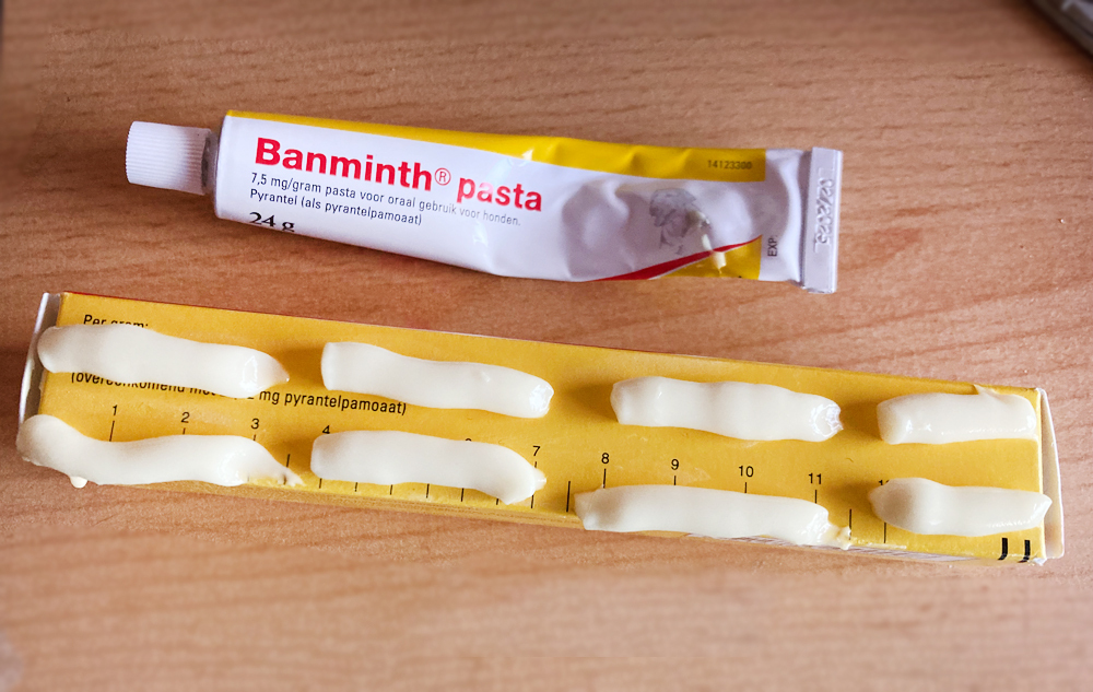 Wir entwurmen beim ersten Mal mit Banminth Paste - da hält sich der Ekel noch in Grenzen. Dasha bekommt Milbemax.
