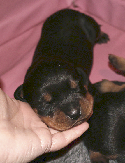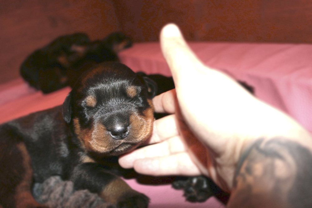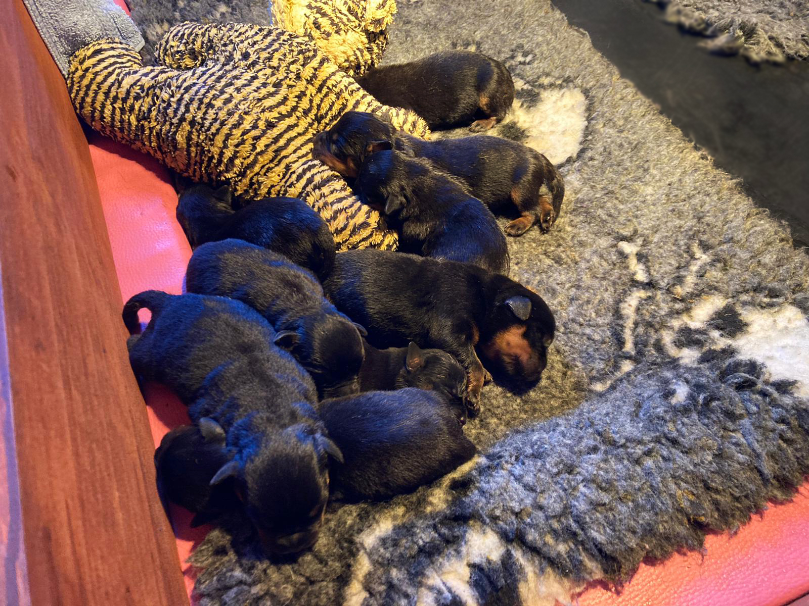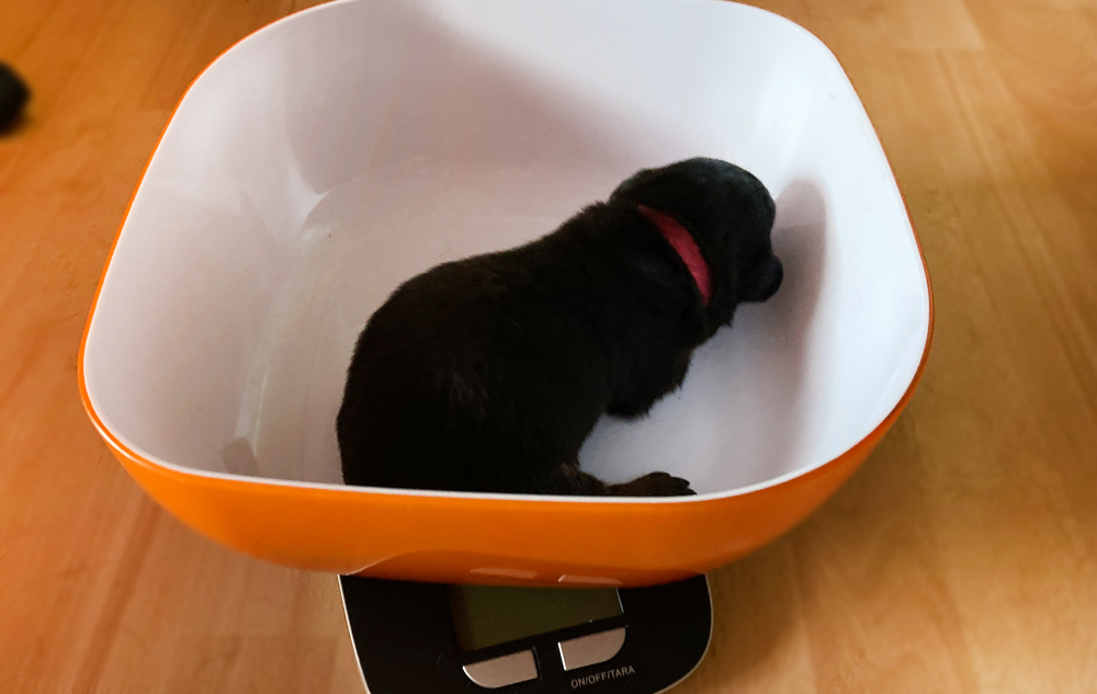 Die Welpen sind anfangs in rasant kurzen Abgeständn geboren. Nach dem 7.Welpen hat sie ein Stündchen Pause gemacht und danach purzelte der Rest. Ich habe sie weitestgehend in Ruhe gelassen, sie hatte aber auch nichts dagegen, dass ich ihre Babys begutachtet und gewogen habe.
