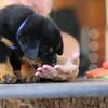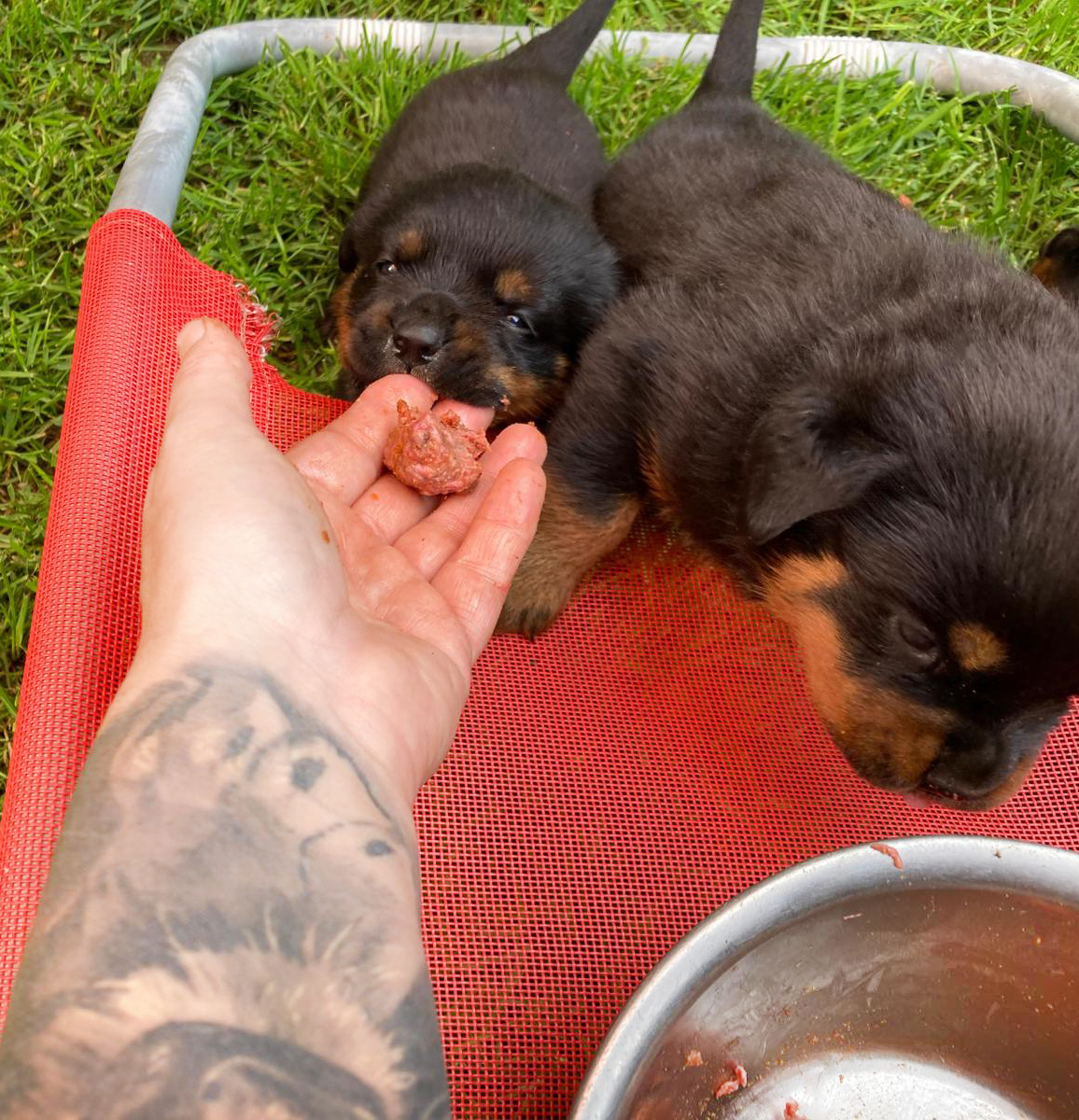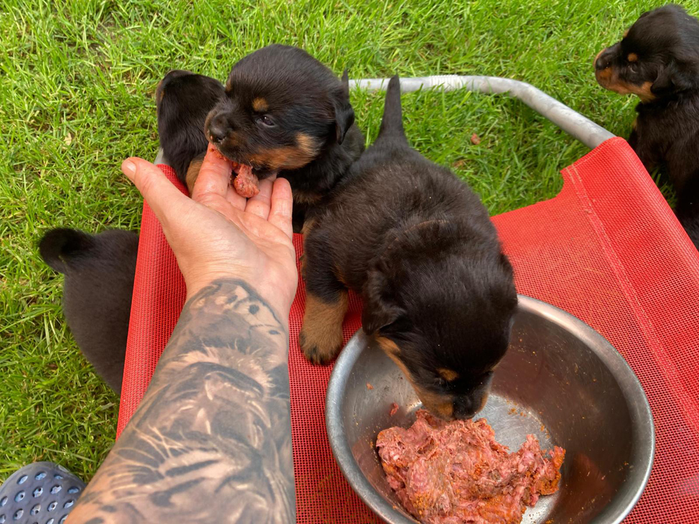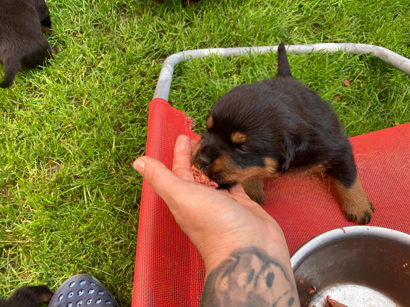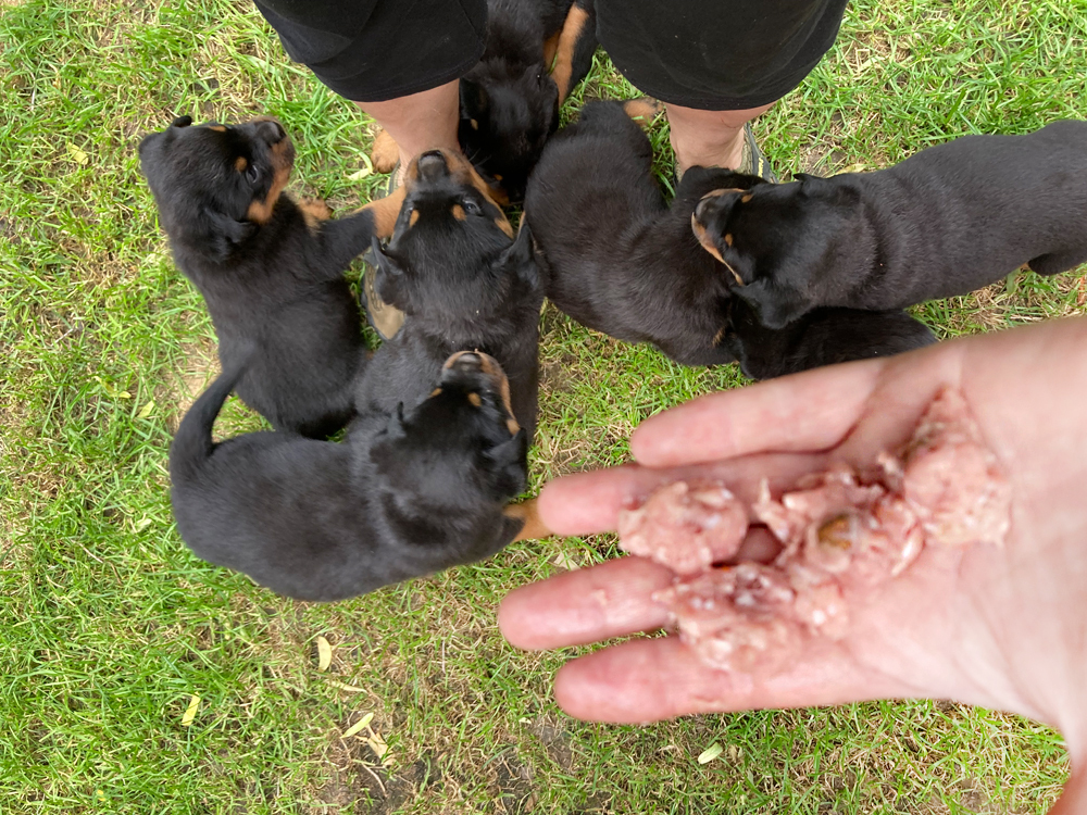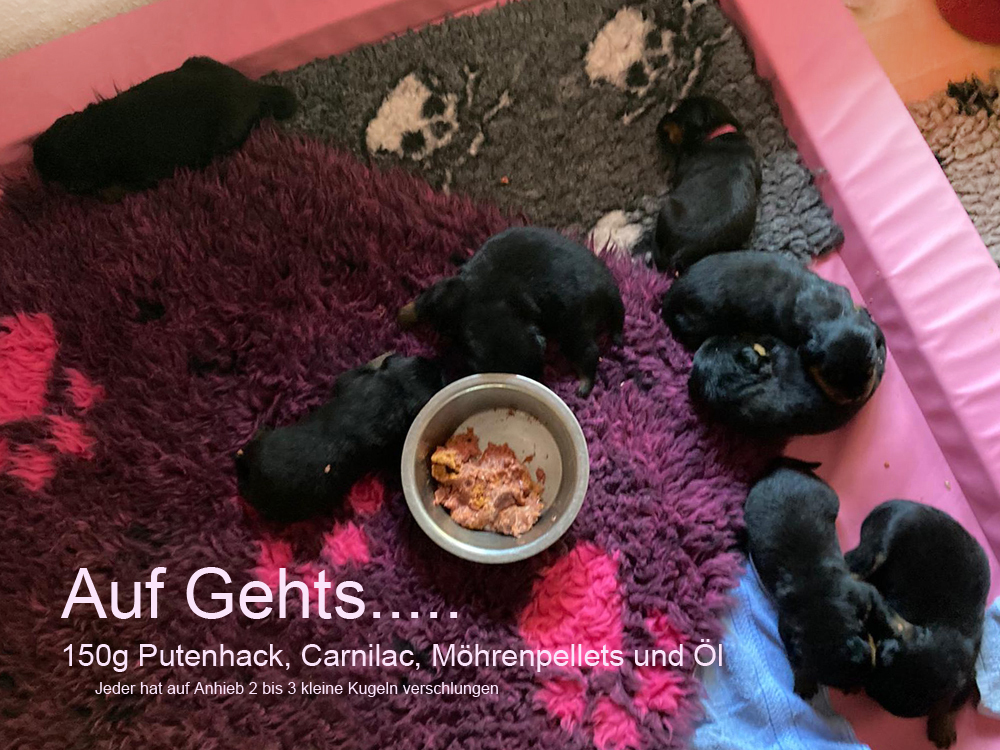Bei uns gibt es keinen Welpenbrei -> hier geht s direkt mit feingewolftem Fleisch los.