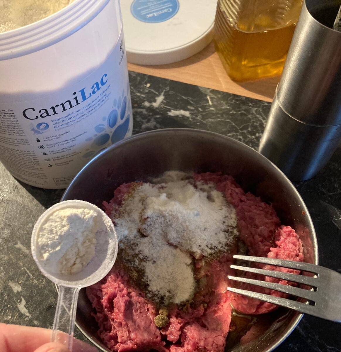 Nun hatte ich noch ein paar große Dosen Carnilac (Welpenmilch) mit kurzem MHD (Nov.2023) übrig, die eigentlich von der Firma Carnimed ausgetauscht werden sollten.