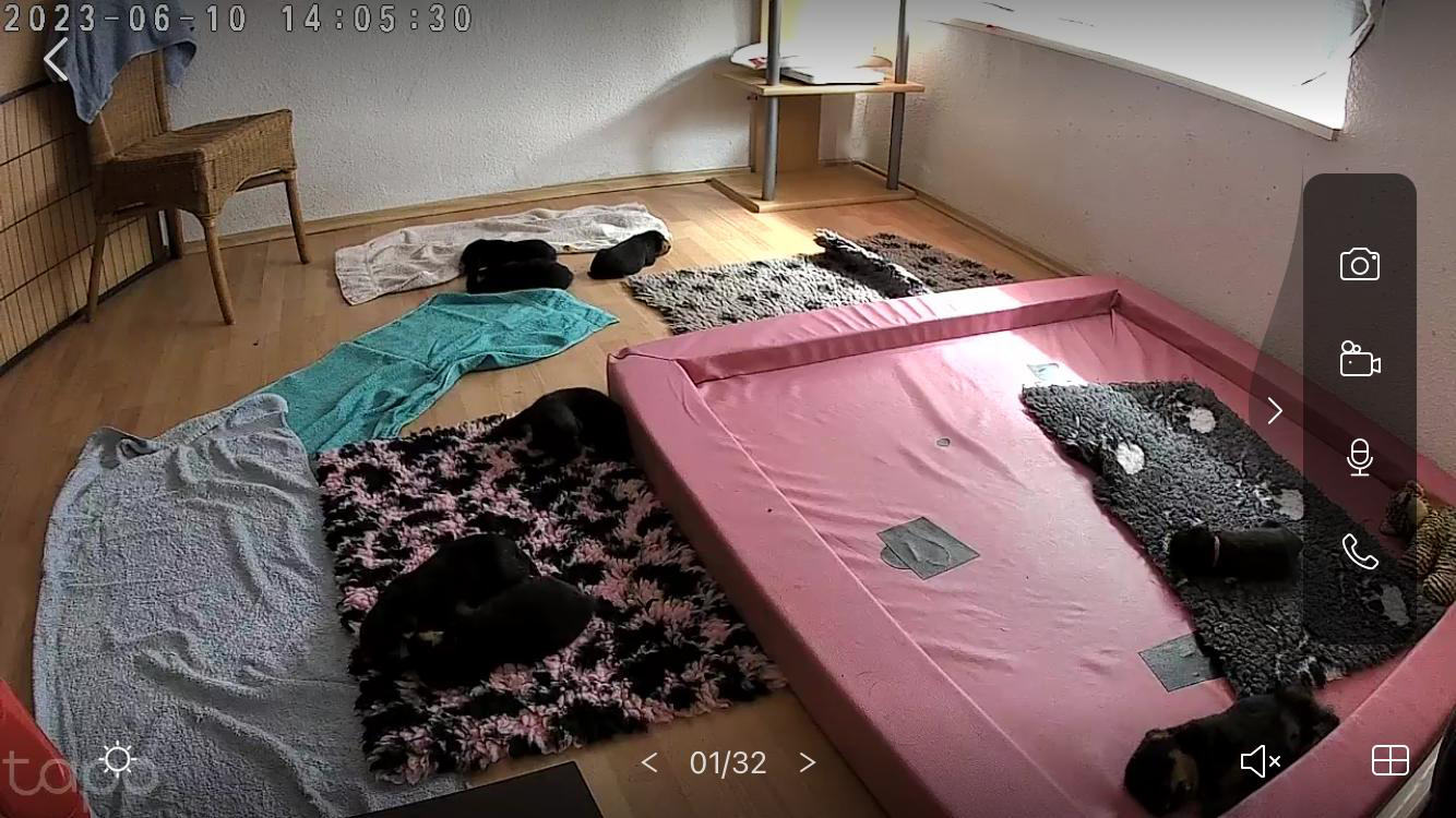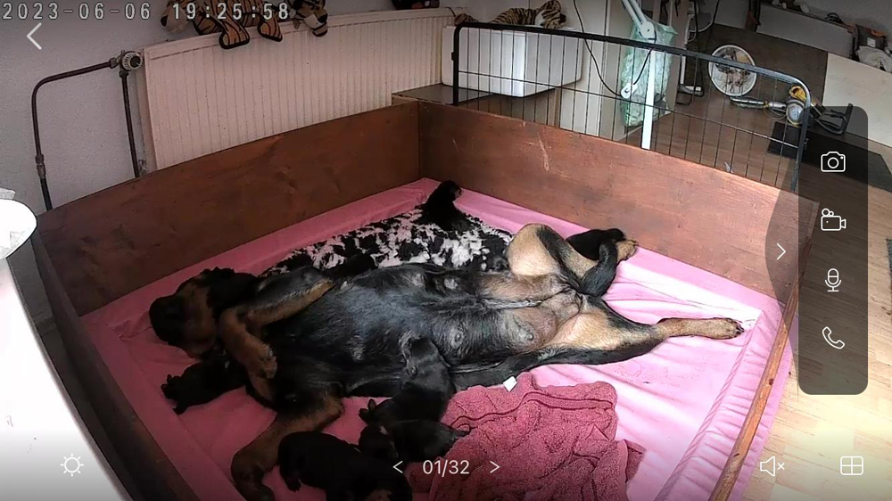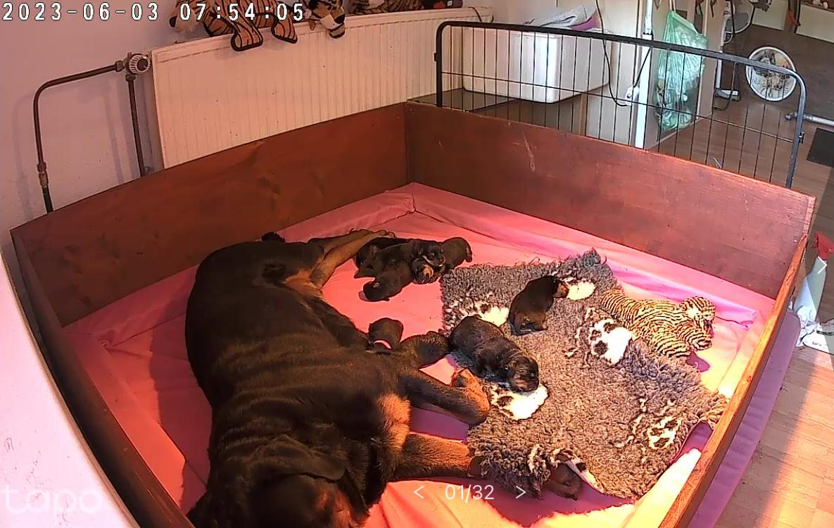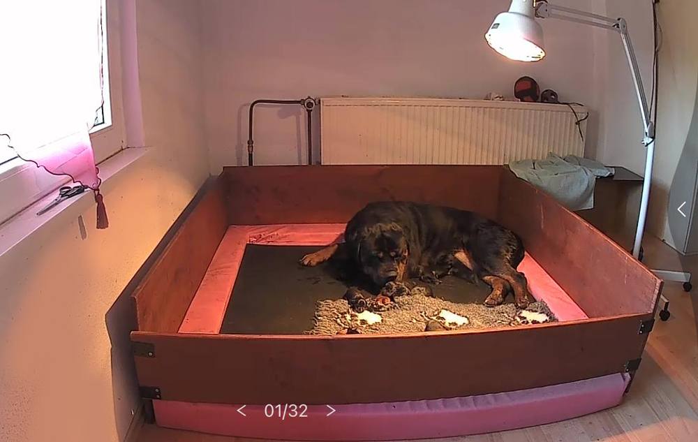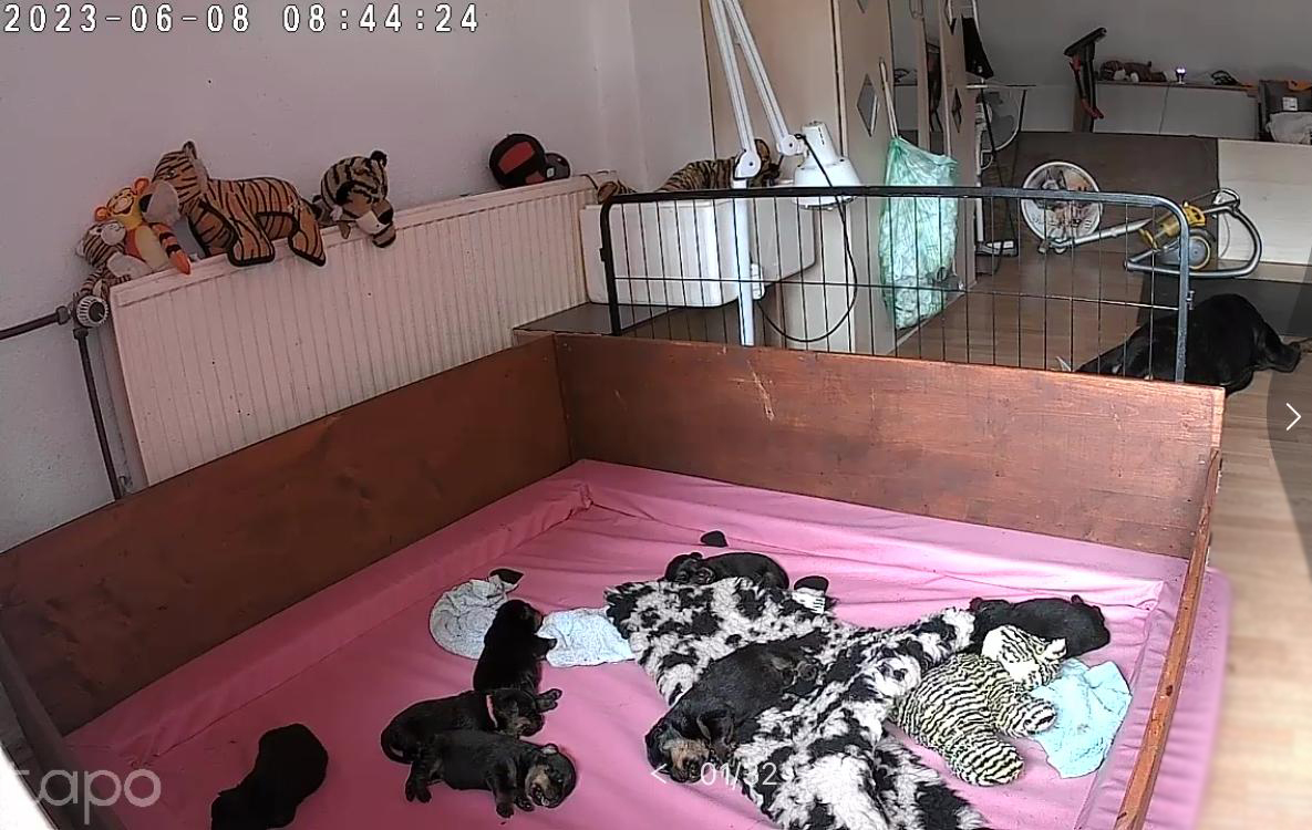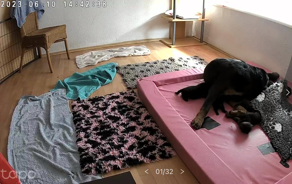 Bei so vielen Welpen sieht man nicht, wenn ein Welpen steckenbleibt. Sie krauchen ja z.Teil alle mal unters Gesäuge um an die hinteren Zitzen zu kommen. Wir pendeln jetzt also zwischen Büro, Stube und Schlafzimmer.