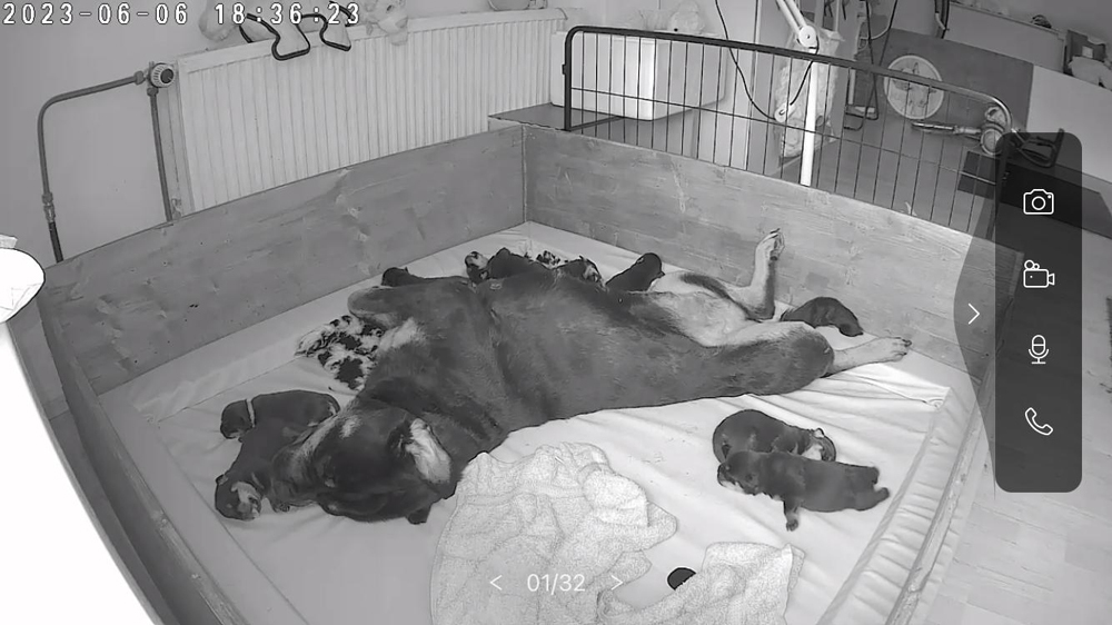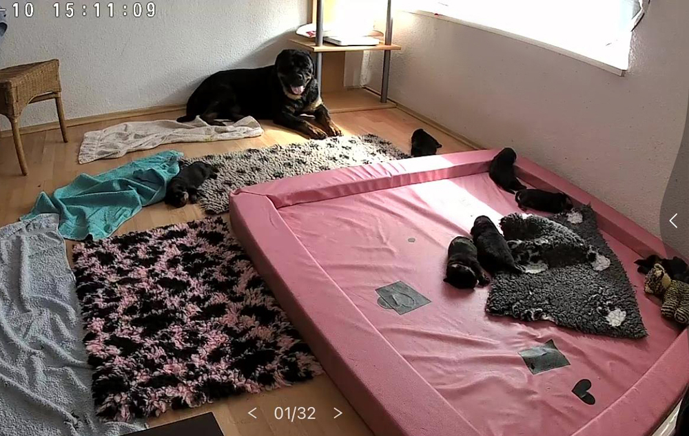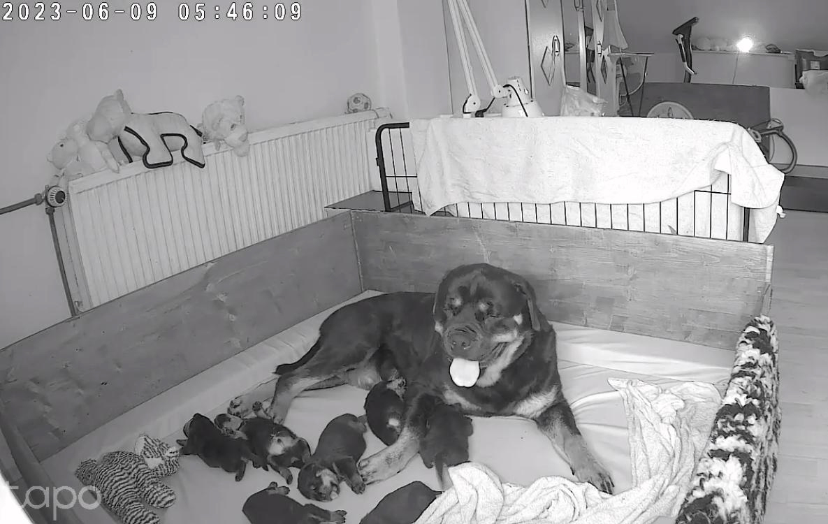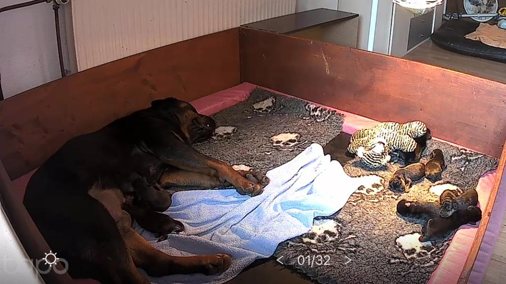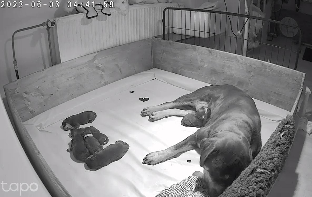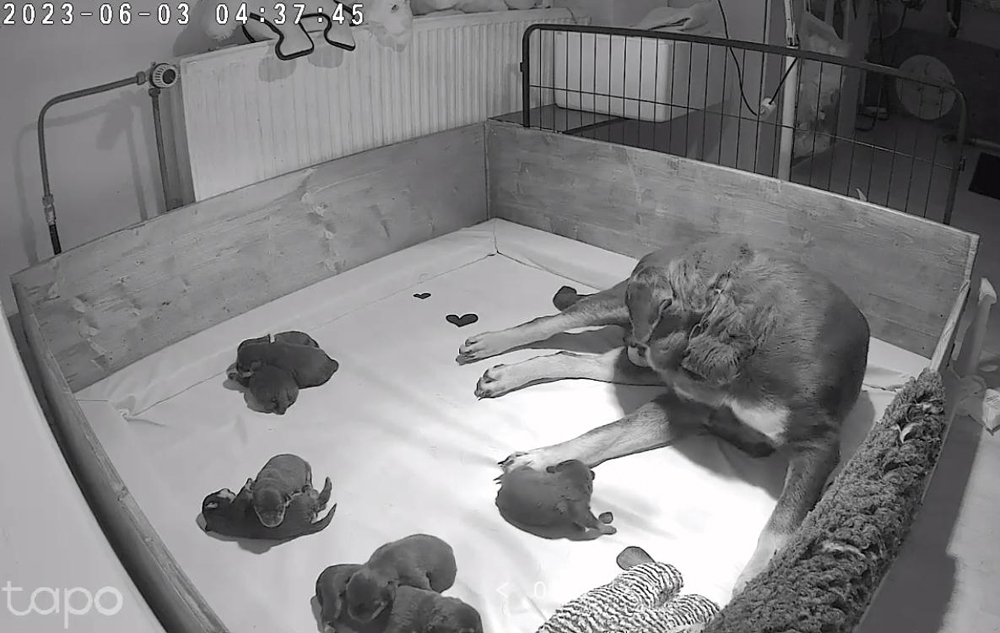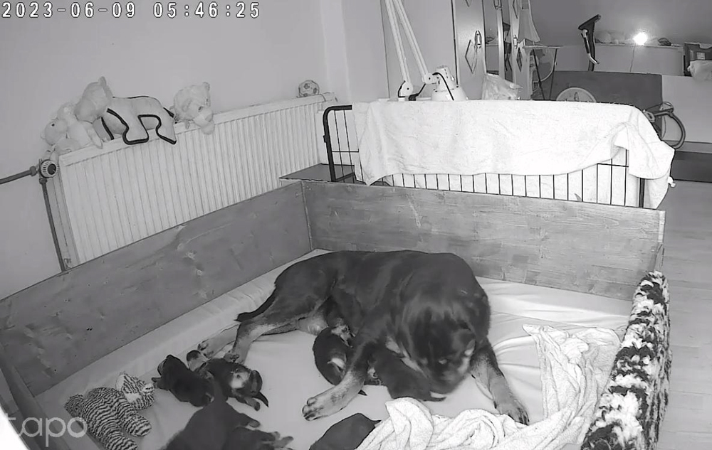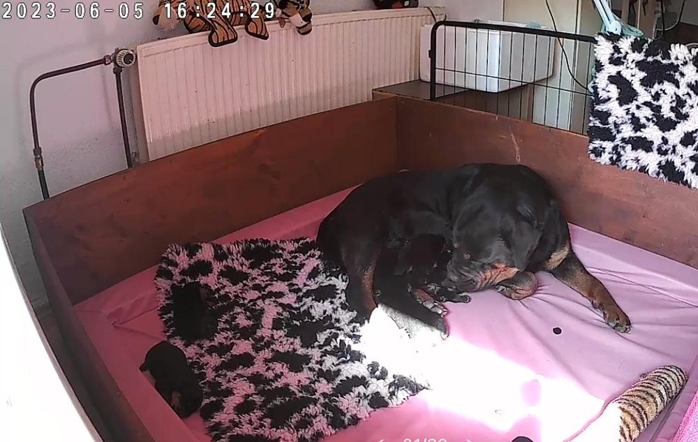 Ein Bursche ist leider tot😢, erstickt unter Dasha Gewicht. Auf der Überwachungskamera habe ich im Nachhinein gesehen, das er mit dem Kopf bzw. der ganzen vorderen Hälfte unter ihrer Brust geklemmt hat und vergeblich versucht hat wieder vorzukommen. Dasha hat geschlafen und es nicht gemerkt. Seitdem das passiert ist, traue ich mir nicht, sie mit den Babys alleine zu lassen.
