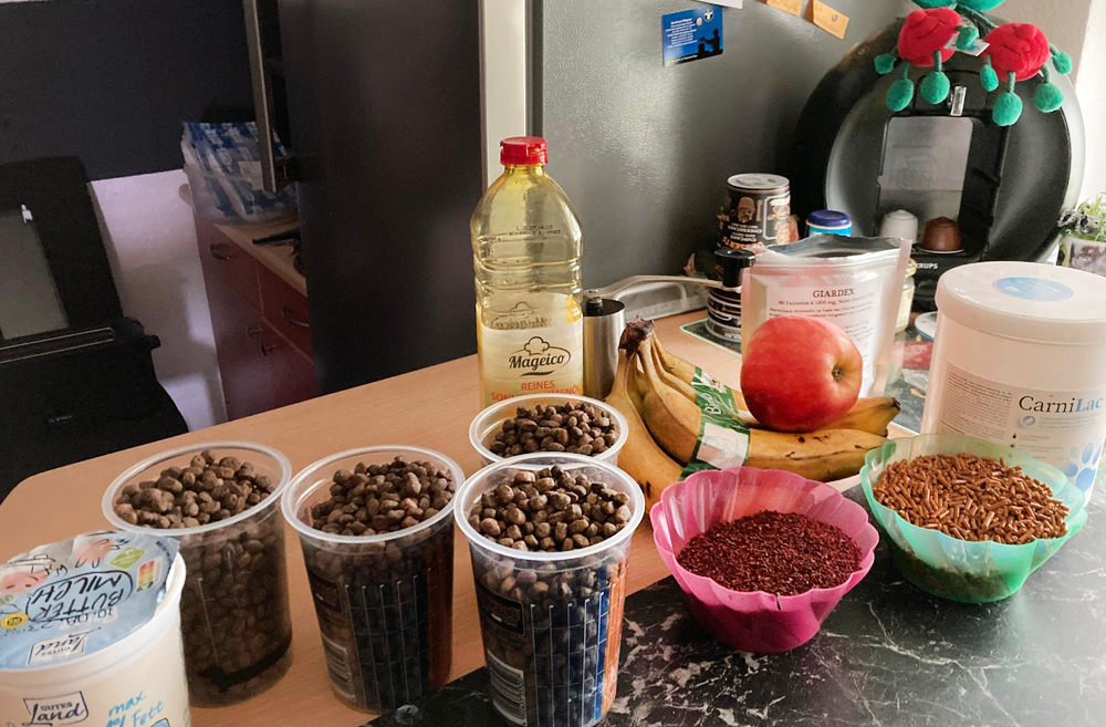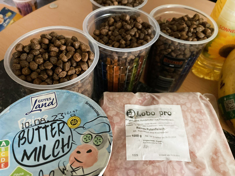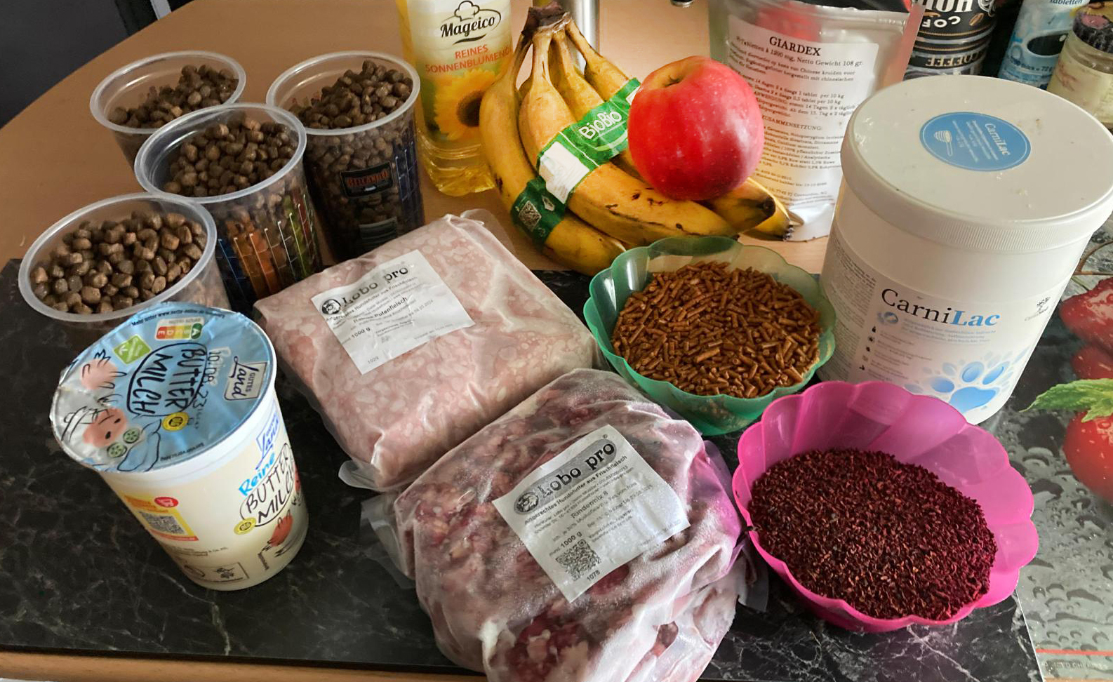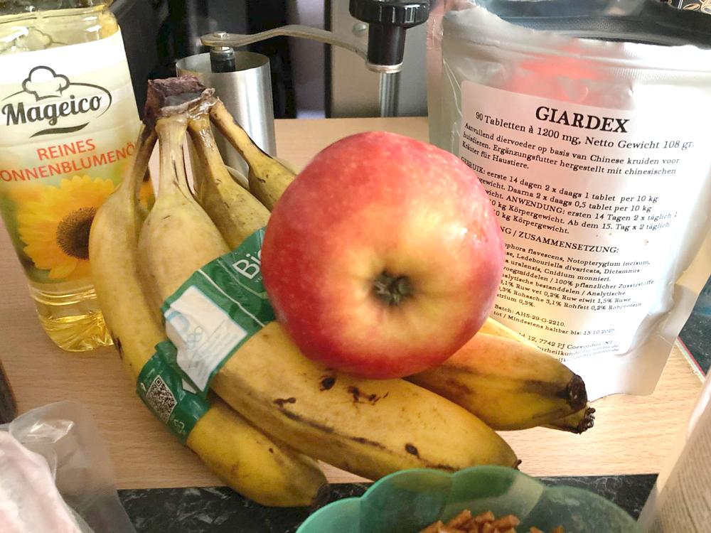 4 Becher a 240g Belcando Puppy GF Poultry 2 Kilo Fleisch (Rind und Pute), ein viertel Becher Buttermilch, diverse Bananen, einen geriebenen Apfel, Möhren- und Rote Beete Pelletts, Öl, Carnilac und Giardex.